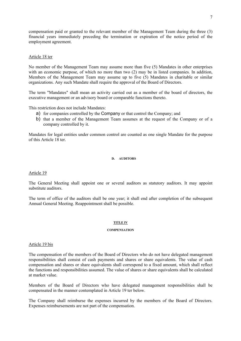 7 compensation paid or granted to the relevant member of the Management Team during the three (3) financial years immediately preceding the termination or expiration of the notice period of the employment agreement. Article 18 ter No member of the Management Team may assume more than five (5) Mandates in other enterprises with an economic purpose, of which no more than two (2) may be in listed companies. In addition, Members of the Management Team may assume up to five (5) Mandates in charitable or similar organizations. Any such Mandate shall require the approval of the Board of Directors. The term "Mandates" shall mean an activity carried out as a member of the board of directors, the executive management or an advisory board or comparable functions thereto. This restriction does not include Mandates: a) for companies controlled by the Company or that control the Company; and b) that a member of the Management Team assumes at the request of the Company or of a company controlled by it. Mandates for legal entities under common control are counted as one single Mandate for the purpose of this Article 18 ter. D. AUDITORS Article 19 The General Meeting shall appoint one or several auditors as statutory auditors. It may appoint substitute auditors. The term of office of the auditors shall be one year; it shall end after completion of the subsequent Annual General Meeting. Reappointment shall be possible. TITLE IV COMPENSATION Article 19 bis The compensation of the members of the Board of Directors who do not have delegated management responsibilities shall consist of cash payments and shares or share equivalents. The value of cash compensation and shares or share equivalents shall correspond to a fixed amount, which shall reflect the functions and responsibilities assumed. The value of shares or share equivalents shall be calculated at market value. Members of the Board of Directors who have delegated management responsibilities shall be compensated in the manner contemplated in Article 19 ter below. The Company shall reimburse the expenses incurred by the members of the Board of Directors. Expenses reimbursements are not part of the compensation.