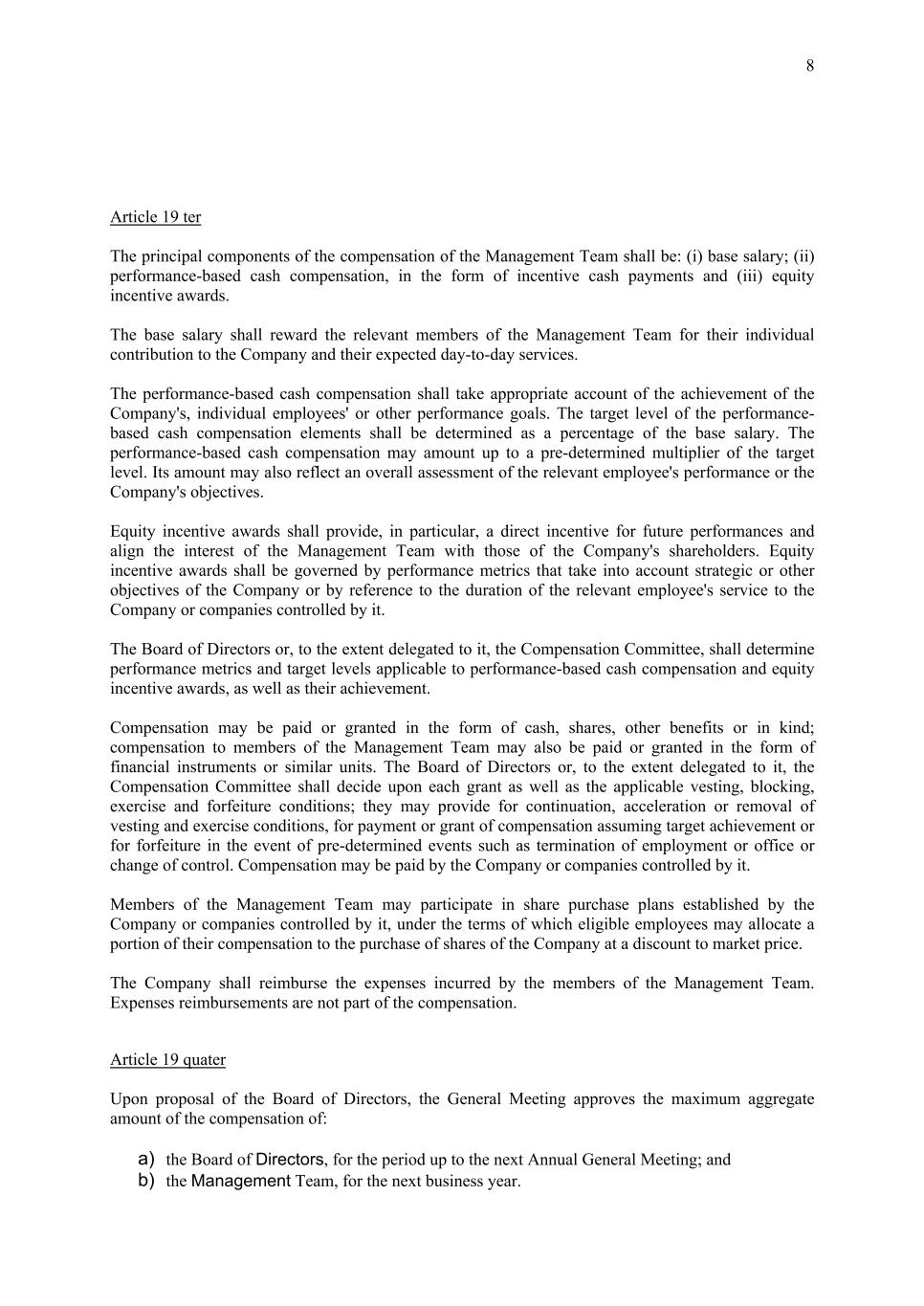 8 Article 19 ter The principal components of the compensation of the Management Team shall be: (i) base salary; (ii) performance-based cash compensation, in the form of incentive cash payments and (iii) equity incentive awards. The base salary shall reward the relevant members of the Management Team for their individual contribution to the Company and their expected day-to-day services. The performance-based cash compensation shall take appropriate account of the achievement of the Company's, individual employees' or other performance goals. The target level of the performance- based cash compensation elements shall be determined as a percentage of the base salary. The performance-based cash compensation may amount up to a pre-determined multiplier of the target level. Its amount may also reflect an overall assessment of the relevant employee's performance or the Company's objectives. Equity incentive awards shall provide, in particular, a direct incentive for future performances and align the interest of the Management Team with those of the Company's shareholders. Equity incentive awards shall be governed by performance metrics that take into account strategic or other objectives of the Company or by reference to the duration of the relevant employee's service to the Company or companies controlled by it. The Board of Directors or, to the extent delegated to it, the Compensation Committee, shall determine performance metrics and target levels applicable to performance-based cash compensation and equity incentive awards, as well as their achievement. Compensation may be paid or granted in the form of cash, shares, other benefits or in kind; compensation to members of the Management Team may also be paid or granted in the form of financial instruments or similar units. The Board of Directors or, to the extent delegated to it, the Compensation Committee shall decide upon each grant as well as the applicable vesting, blocking, exercise and forfeiture conditions; they may provide for continuation, acceleration or removal of vesting and exercise conditions, for payment or grant of compensation assuming target achievement or for forfeiture in the event of pre-determined events such as termination of employment or office or change of control. Compensation may be paid by the Company or companies controlled by it. Members of the Management Team may participate in share purchase plans established by the Company or companies controlled by it, under the terms of which eligible employees may allocate a portion of their compensation to the purchase of shares of the Company at a discount to market price. The Company shall reimburse the expenses incurred by the members of the Management Team. Expenses reimbursements are not part of the compensation. Article 19 quater Upon proposal of the Board of Directors, the General Meeting approves the maximum aggregate amount of the compensation of: a) the Board of Directors, for the period up to the next Annual General Meeting; and b) the Management Team, for the next business year.