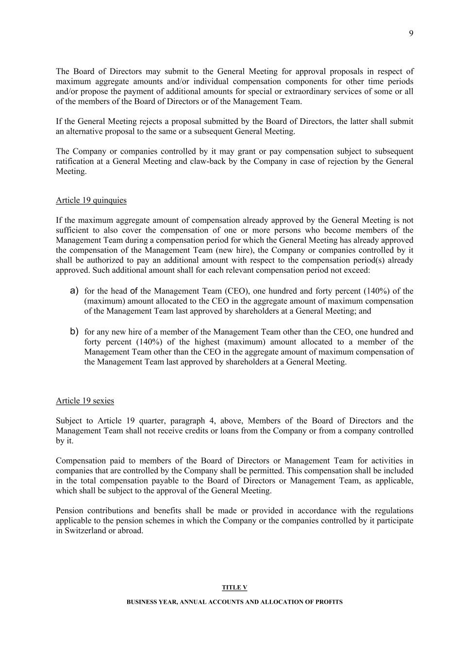9 The Board of Directors may submit to the General Meeting for approval proposals in respect of maximum aggregate amounts and/or individual compensation components for other time periods and/or propose the payment of additional amounts for special or extraordinary services of some or all of the members of the Board of Directors or of the Management Team. If the General Meeting rejects a proposal submitted by the Board of Directors, the latter shall submit an alternative proposal to the same or a subsequent General Meeting. The Company or companies controlled by it may grant or pay compensation subject to subsequent ratification at a General Meeting and claw-back by the Company in case of rejection by the General Meeting. Article 19 quinquies If the maximum aggregate amount of compensation already approved by the General Meeting is not sufficient to also cover the compensation of one or more persons who become members of the Management Team during a compensation period for which the General Meeting has already approved the compensation of the Management Team (new hire), the Company or companies controlled by it shall be authorized to pay an additional amount with respect to the compensation period(s) already approved. Such additional amount shall for each relevant compensation period not exceed: a) for the head of the Management Team (CEO), one hundred and forty percent (140%) of the (maximum) amount allocated to the CEO in the aggregate amount of maximum compensation of the Management Team last approved by shareholders at a General Meeting; and b) for any new hire of a member of the Management Team other than the CEO, one hundred and forty percent (140%) of the highest (maximum) amount allocated to a member of the Management Team other than the CEO in the aggregate amount of maximum compensation of the Management Team last approved by shareholders at a General Meeting. Article 19 sexies Subject to Article 19 quarter, paragraph 4, above, Members of the Board of Directors and the Management Team shall not receive credits or loans from the Company or from a company controlled by it. Compensation paid to members of the Board of Directors or Management Team for activities in companies that are controlled by the Company shall be permitted. This compensation shall be included in the total compensation payable to the Board of Directors or Management Team, as applicable, which shall be subject to the approval of the General Meeting. Pension contributions and benefits shall be made or provided in accordance with the regulations applicable to the pension schemes in which the Company or the companies controlled by it participate in Switzerland or abroad. TITLE V BUSINESS YEAR, ANNUAL ACCOUNTS AND ALLOCATION OF PROFITS