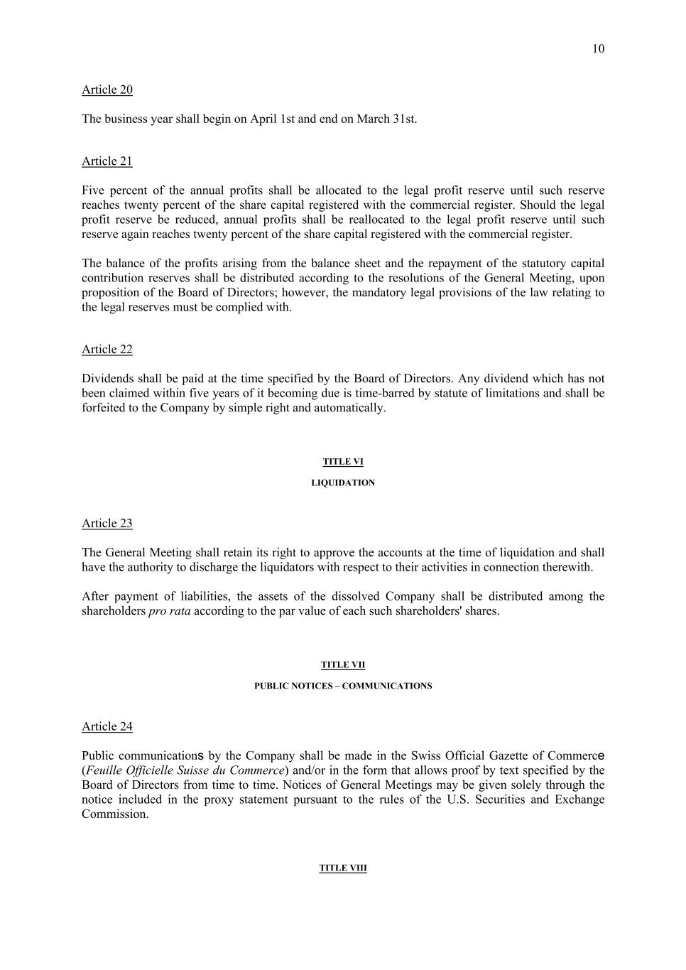 10 Article 20 The business year shall begin on April 1st and end on March 31st. Article 21 Five percent of the annual profits shall be allocated to the legal profit reserve until such reserve reaches twenty percent of the share capital registered with the commercial register. Should the legal profit reserve be reduced, annual profits shall be reallocated to the legal profit reserve until such reserve again reaches twenty percent of the share capital registered with the commercial register. The balance of the profits arising from the balance sheet and the repayment of the statutory capital contribution reserves shall be distributed according to the resolutions of the General Meeting, upon proposition of the Board of Directors; however, the mandatory legal provisions of the law relating to the legal reserves must be complied with. Article 22 Dividends shall be paid at the time specified by the Board of Directors. Any dividend which has not been claimed within five years of it becoming due is time-barred by statute of limitations and shall be forfeited to the Company by simple right and automatically. TITLE VI LIQUIDATION Article 23 The General Meeting shall retain its right to approve the accounts at the time of liquidation and shall have the authority to discharge the liquidators with respect to their activities in connection therewith. After payment of liabilities, the assets of the dissolved Company shall be distributed among the shareholders pro rata according to the par value of each such shareholders' shares. TITLE VII PUBLIC NOTICES – COMMUNICATIONS Article 24 Public communications by the Company shall be made in the Swiss Official Gazette of Commerce (Feuille Officielle Suisse du Commerce) and/or in the form that allows proof by text specified by the Board of Directors from time to time. Notices of General Meetings may be given solely through the notice included in the proxy statement pursuant to the rules of the U.S. Securities and Exchange Commission. TITLE VIII