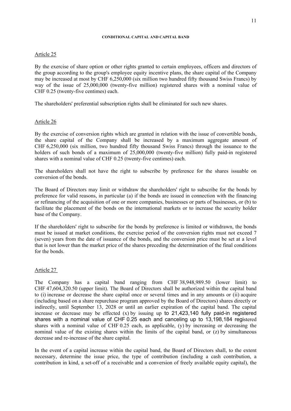 11 CONDITIONAL CAPITAL AND CAPITAL BAND Article 25 By the exercise of share option or other rights granted to certain employees, officers and directors of the group according to the group's employee equity incentive plans, the share capital of the Company may be increased at most by CHF 6,250,000 (six million two hundred fifty thousand Swiss Francs) by way of the issue of 25,000,000 (twenty-five million) registered shares with a nominal value of CHF 0.25 (twenty-five centimes) each. The shareholders' preferential subscription rights shall be eliminated for such new shares. Article 26 By the exercise of conversion rights which are granted in relation with the issue of convertible bonds, the share capital of the Company shall be increased by a maximum aggregate amount of CHF 6,250,000 (six million, two hundred fifty thousand Swiss Francs) through the issuance to the holders of such bonds of a maximum of 25,000,000 (twenty-five million) fully paid-in registered shares with a nominal value of CHF 0.25 (twenty-five centimes) each. The shareholders shall not have the right to subscribe by preference for the shares issuable on conversion of the bonds. The Board of Directors may limit or withdraw the shareholders' right to subscribe for the bonds by preference for valid reasons, in particular (a) if the bonds are issued in connection with the financing or refinancing of the acquisition of one or more companies, businesses or parts of businesses, or (b) to facilitate the placement of the bonds on the international markets or to increase the security holder base of the Company. If the shareholders' right to subscribe for the bonds by preference is limited or withdrawn, the bonds must be issued at market conditions, the exercise period of the conversion rights must not exceed 7 (seven) years from the date of issuance of the bonds, and the conversion price must be set at a level that is not lower than the market price of the shares preceding the determination of the final conditions for the bonds. Article 27 The Company has a capital band ranging from CHF 38,948,989.50 (lower limit) to CHF 47,604,320.50 (upper limit). The Board of Directors shall be authorized within the capital band to (i) increase or decrease the share capital once or several times and in any amounts or (ii) acquire (including based on a share repurchase program approved by the Board of Directors) shares directly or indirectly, until September 13, 2028 or until an earlier expiration of the capital band. The capital increase or decrease may be effected (x) by issuing up to 21,423,140 fully paid-in registered shares with a nominal value of CHF 0.25 each and canceling up to 13,198,184 registered shares with a nominal value of CHF 0.25 each, as applicable, (y) by increasing or decreasing the nominal value of the existing shares within the limits of the capital band, or (z) by simultaneous decrease and re-increase of the share capital. In the event of a capital increase within the capital band, the Board of Directors shall, to the extent necessary, determine the issue price, the type of contribution (including a cash contribution, a contribution in kind, a set-off of a receivable and a conversion of freely available equity capital), the