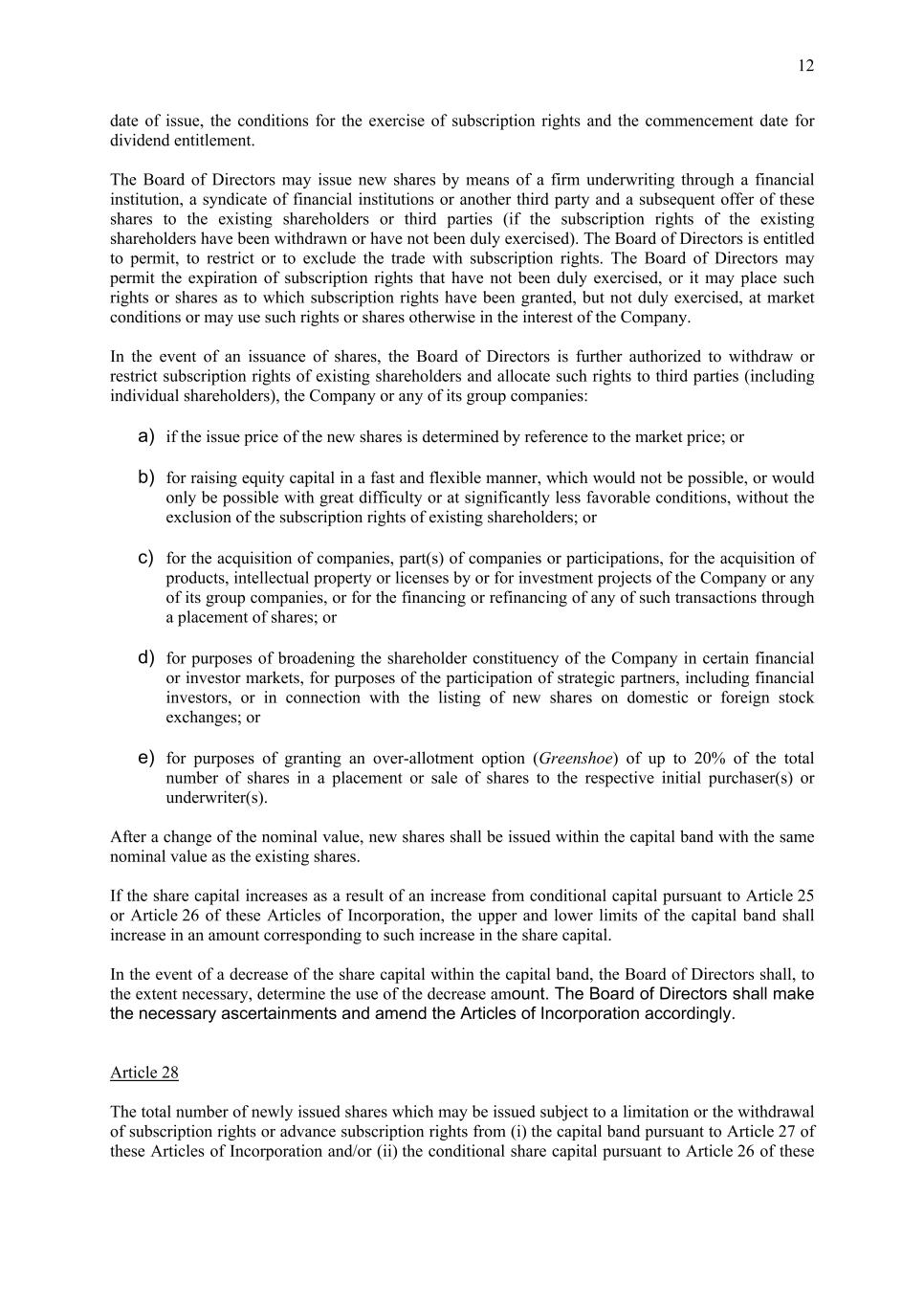 12 date of issue, the conditions for the exercise of subscription rights and the commencement date for dividend entitlement. The Board of Directors may issue new shares by means of a firm underwriting through a financial institution, a syndicate of financial institutions or another third party and a subsequent offer of these shares to the existing shareholders or third parties (if the subscription rights of the existing shareholders have been withdrawn or have not been duly exercised). The Board of Directors is entitled to permit, to restrict or to exclude the trade with subscription rights. The Board of Directors may permit the expiration of subscription rights that have not been duly exercised, or it may place such rights or shares as to which subscription rights have been granted, but not duly exercised, at market conditions or may use such rights or shares otherwise in the interest of the Company. In the event of an issuance of shares, the Board of Directors is further authorized to withdraw or restrict subscription rights of existing shareholders and allocate such rights to third parties (including individual shareholders), the Company or any of its group companies: a) if the issue price of the new shares is determined by reference to the market price; or b) for raising equity capital in a fast and flexible manner, which would not be possible, or would only be possible with great difficulty or at significantly less favorable conditions, without the exclusion of the subscription rights of existing shareholders; or c) for the acquisition of companies, part(s) of companies or participations, for the acquisition of products, intellectual property or licenses by or for investment projects of the Company or any of its group companies, or for the financing or refinancing of any of such transactions through a placement of shares; or d) for purposes of broadening the shareholder constituency of the Company in certain financial or investor markets, for purposes of the participation of strategic partners, including financial investors, or in connection with the listing of new shares on domestic or foreign stock exchanges; or e) for purposes of granting an over-allotment option (Greenshoe) of up to 20% of the total number of shares in a placement or sale of shares to the respective initial purchaser(s) or underwriter(s). After a change of the nominal value, new shares shall be issued within the capital band with the same nominal value as the existing shares. If the share capital increases as a result of an increase from conditional capital pursuant to Article 25 or Article 26 of these Articles of Incorporation, the upper and lower limits of the capital band shall increase in an amount corresponding to such increase in the share capital. In the event of a decrease of the share capital within the capital band, the Board of Directors shall, to the extent necessary, determine the use of the decrease amount. The Board of Directors shall make the necessary ascertainments and amend the Articles of Incorporation accordingly. Article 28 The total number of newly issued shares which may be issued subject to a limitation or the withdrawal of subscription rights or advance subscription rights from (i) the capital band pursuant to Article 27 of these Articles of Incorporation and/or (ii) the conditional share capital pursuant to Article 26 of these