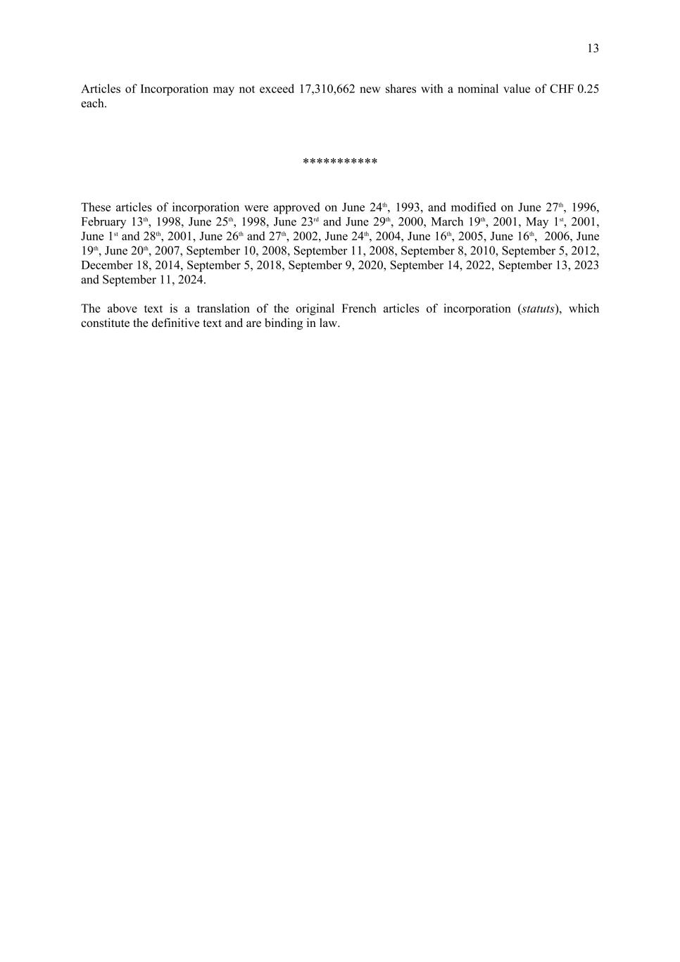 13 Articles of Incorporation may not exceed 17,310,662 new shares with a nominal value of CHF 0.25 each. *********** These articles of incorporation were approved on June 24th, 1993, and modified on June 27th, 1996, February 13th, 1998, June 25th, 1998, June 23rd and June 29th, 2000, March 19th, 2001, May 1st, 2001, June 1st and 28th, 2001, June 26th and 27th, 2002, June 24th, 2004, June 16th, 2005, June 16th, 2006, June 19th, June 20th, 2007, September 10, 2008, September 11, 2008, September 8, 2010, September 5, 2012, December 18, 2014, September 5, 2018, September 9, 2020, September 14, 2022, September 13, 2023 and September 11, 2024. The above text is a translation of the original French articles of incorporation (statuts), which constitute the definitive text and are binding in law.