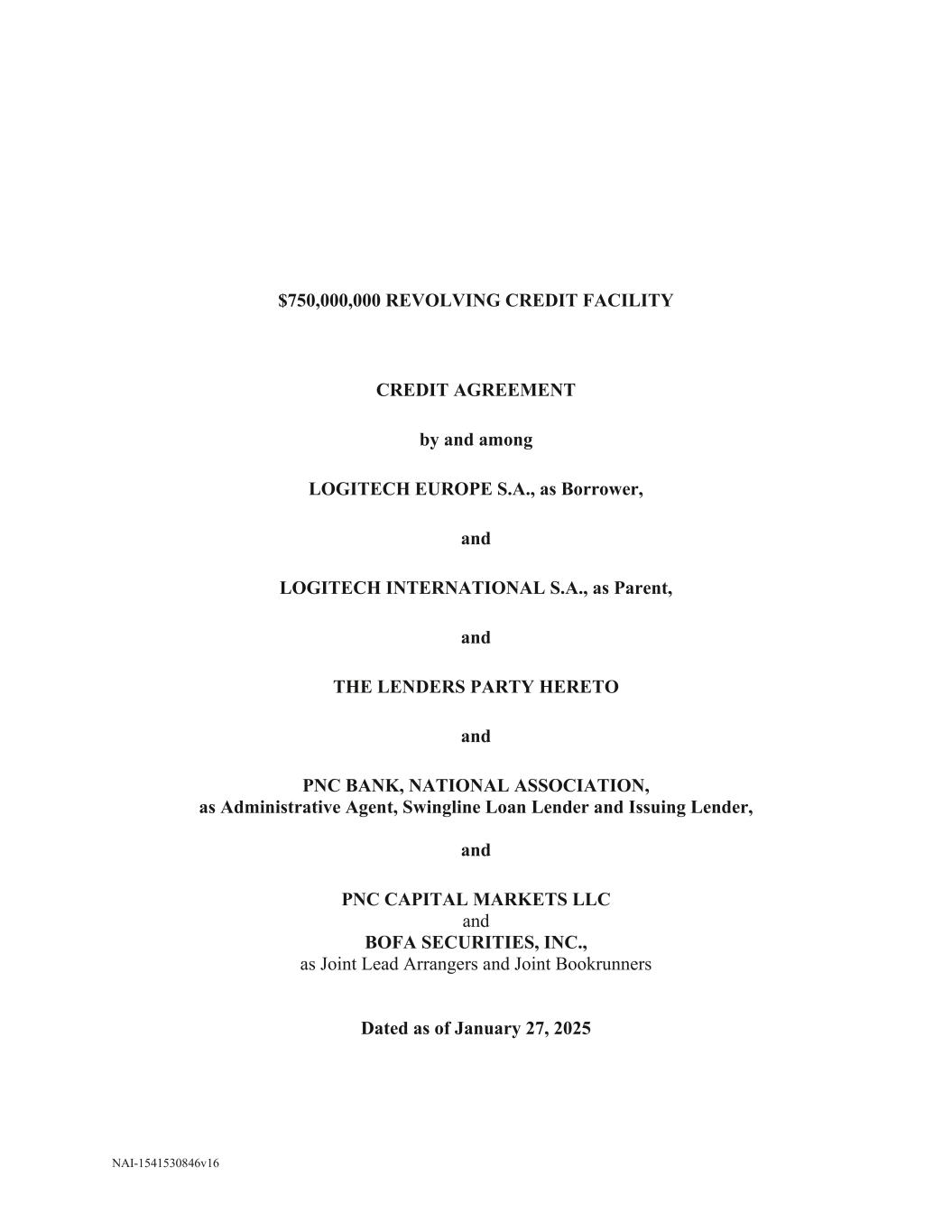NAI-1541530846v16 $750,000,000 REVOLVING CREDIT FACILITY CREDIT AGREEMENT by and among LOGITECH EUROPE S.A., as Borrower, and LOGITECH INTERNATIONAL S.A., as Parent, and THE LENDERS PARTY HERETO and PNC BANK, NATIONAL ASSOCIATION, as Administrative Agent, Swingline Loan Lender and Issuing Lender, and PNC CAPITAL MARKETS LLC and BOFA SECURITIES, INC., as Joint Lead Arrangers and Joint Bookrunners Dated as of January 27, 2025