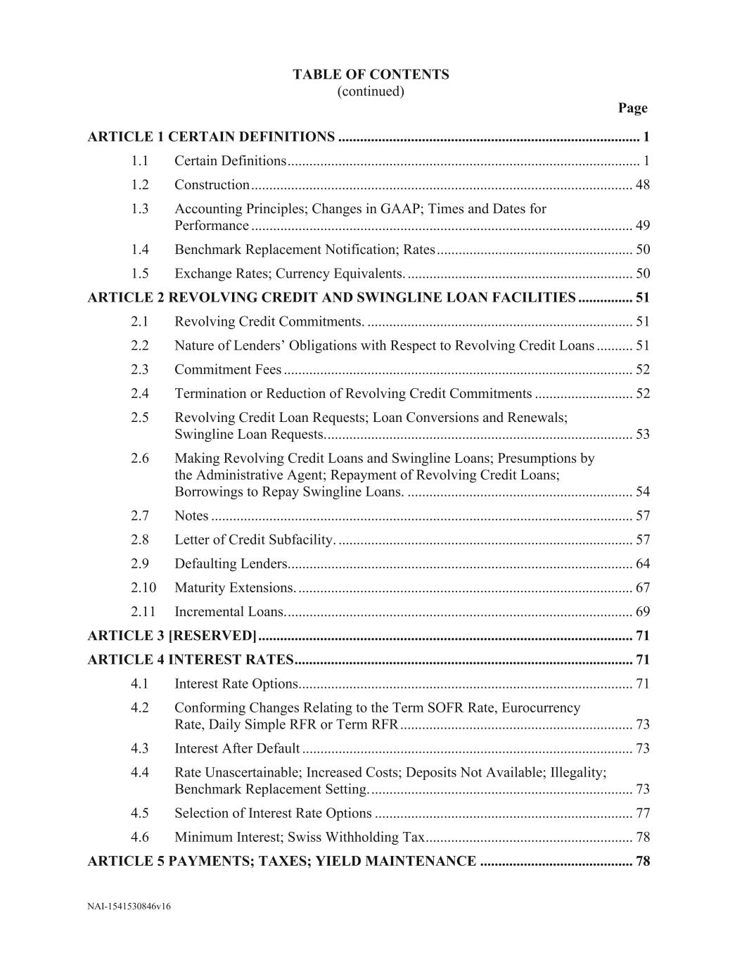 NAI-1541530846v16 TABLE OF CONTENTS (continued) Page ARTICLE 1 CERTAIN DEFINITIONS ................................................................................... 1 1.1 Certain Definitions ................................................................................................. 1 1.2 Construction ......................................................................................................... 48 1.3 Accounting Principles; Changes in GAAP; Times and Dates for Performance ......................................................................................................... 49 1.4 Benchmark Replacement Notification; Rates ...................................................... 50 1.5 Exchange Rates; Currency Equivalents. .............................................................. 50 ARTICLE 2 REVOLVING CREDIT AND SWINGLINE LOAN FACILITIES ............... 51 2.1 Revolving Credit Commitments. ......................................................................... 51 2.2 Nature of Lenders’ Obligations with Respect to Revolving Credit Loans .......... 51 2.3 Commitment Fees ................................................................................................ 52 2.4 Termination or Reduction of Revolving Credit Commitments ........................... 52 2.5 Revolving Credit Loan Requests; Loan Conversions and Renewals; Swingline Loan Requests. .................................................................................... 53 2.6 Making Revolving Credit Loans and Swingline Loans; Presumptions by the Administrative Agent; Repayment of Revolving Credit Loans; Borrowings to Repay Swingline Loans. .............................................................. 54 2.7 Notes .................................................................................................................... 57 2.8 Letter of Credit Subfacility. ................................................................................. 57 2.9 Defaulting Lenders............................................................................................... 64 2.10 Maturity Extensions. ............................................................................................ 67 2.11 Incremental Loans. ............................................................................................... 69 ARTICLE 3 [RESERVED] ....................................................................................................... 71 ARTICLE 4 INTEREST RATES ............................................................................................. 71 4.1 Interest Rate Options............................................................................................ 71 4.2 Conforming Changes Relating to the Term SOFR Rate, Eurocurrency Rate, Daily Simple RFR or Term RFR ................................................................ 73 4.3 Interest After Default ........................................................................................... 73 4.4 Rate Unascertainable; Increased Costs; Deposits Not Available; Illegality; Benchmark Replacement Setting. ........................................................................ 73 4.5 Selection of Interest Rate Options ....................................................................... 77 4.6 Minimum Interest; Swiss Withholding Tax ......................................................... 78 ARTICLE 5 PAYMENTS; TAXES; YIELD MAINTENANCE .......................................... 78
