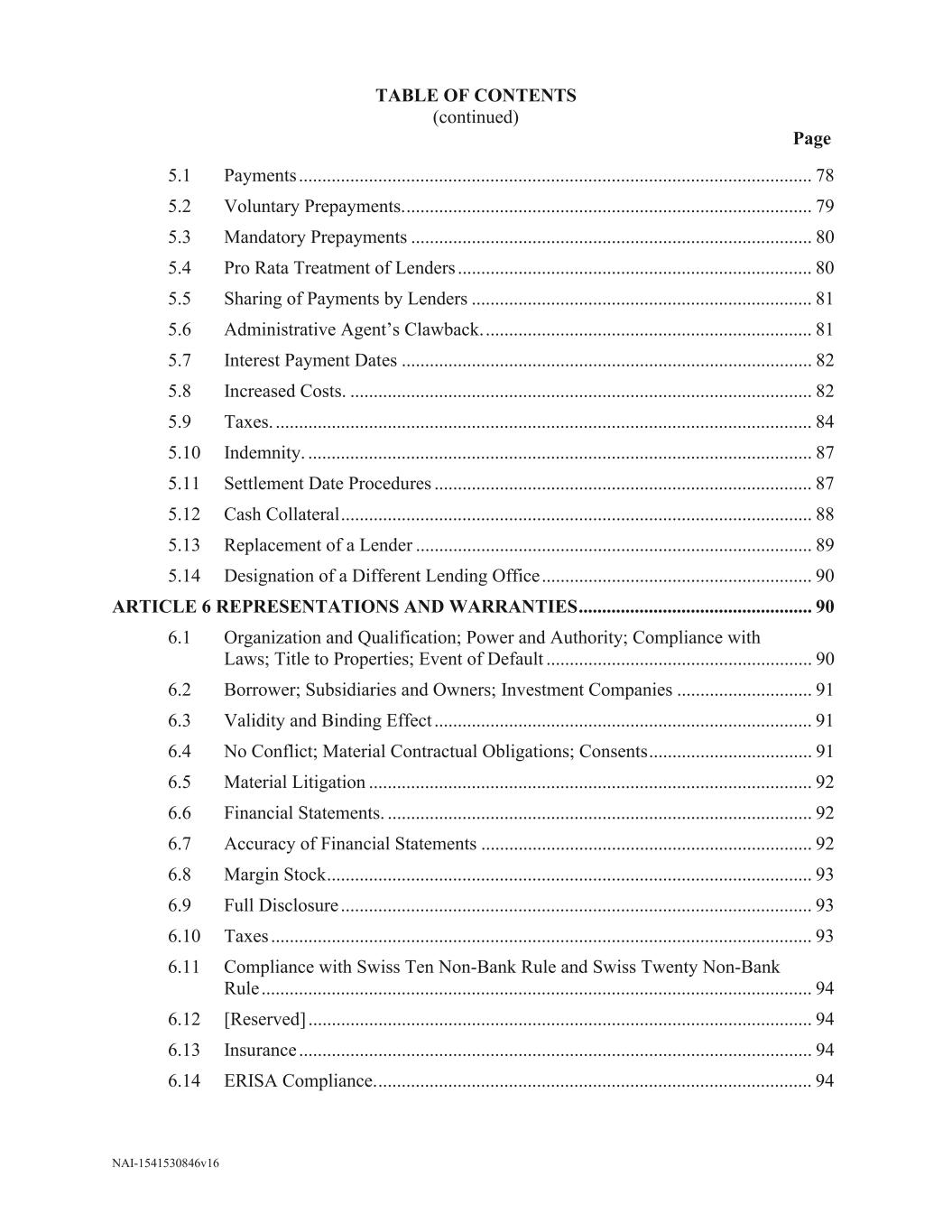 NAI-1541530846v16 TABLE OF CONTENTS (continued) Page 5.1 Payments .............................................................................................................. 78 5.2 Voluntary Prepayments. ....................................................................................... 79 5.3 Mandatory Prepayments ...................................................................................... 80 5.4 Pro Rata Treatment of Lenders ............................................................................ 80 5.5 Sharing of Payments by Lenders ......................................................................... 81 5.6 Administrative Agent’s Clawback. ...................................................................... 81 5.7 Interest Payment Dates ........................................................................................ 82 5.8 Increased Costs. ................................................................................................... 82 5.9 Taxes. ................................................................................................................... 84 5.10 Indemnity. ............................................................................................................ 87 5.11 Settlement Date Procedures ................................................................................. 87 5.12 Cash Collateral ..................................................................................................... 88 5.13 Replacement of a Lender ..................................................................................... 89 5.14 Designation of a Different Lending Office .......................................................... 90 ARTICLE 6 REPRESENTATIONS AND WARRANTIES .................................................. 90 6.1 Organization and Qualification; Power and Authority; Compliance with Laws; Title to Properties; Event of Default ......................................................... 90 6.2 Borrower; Subsidiaries and Owners; Investment Companies ............................. 91 6.3 Validity and Binding Effect ................................................................................. 91 6.4 No Conflict; Material Contractual Obligations; Consents ................................... 91 6.5 Material Litigation ............................................................................................... 92 6.6 Financial Statements. ........................................................................................... 92 6.7 Accuracy of Financial Statements ....................................................................... 92 6.8 Margin Stock ........................................................................................................ 93 6.9 Full Disclosure ..................................................................................................... 93 6.10 Taxes .................................................................................................................... 93 6.11 Compliance with Swiss Ten Non-Bank Rule and Swiss Twenty Non-Bank Rule ...................................................................................................................... 94 6.12 [Reserved] ............................................................................................................ 94 6.13 Insurance .............................................................................................................. 94 6.14 ERISA Compliance. ............................................................................................. 94
