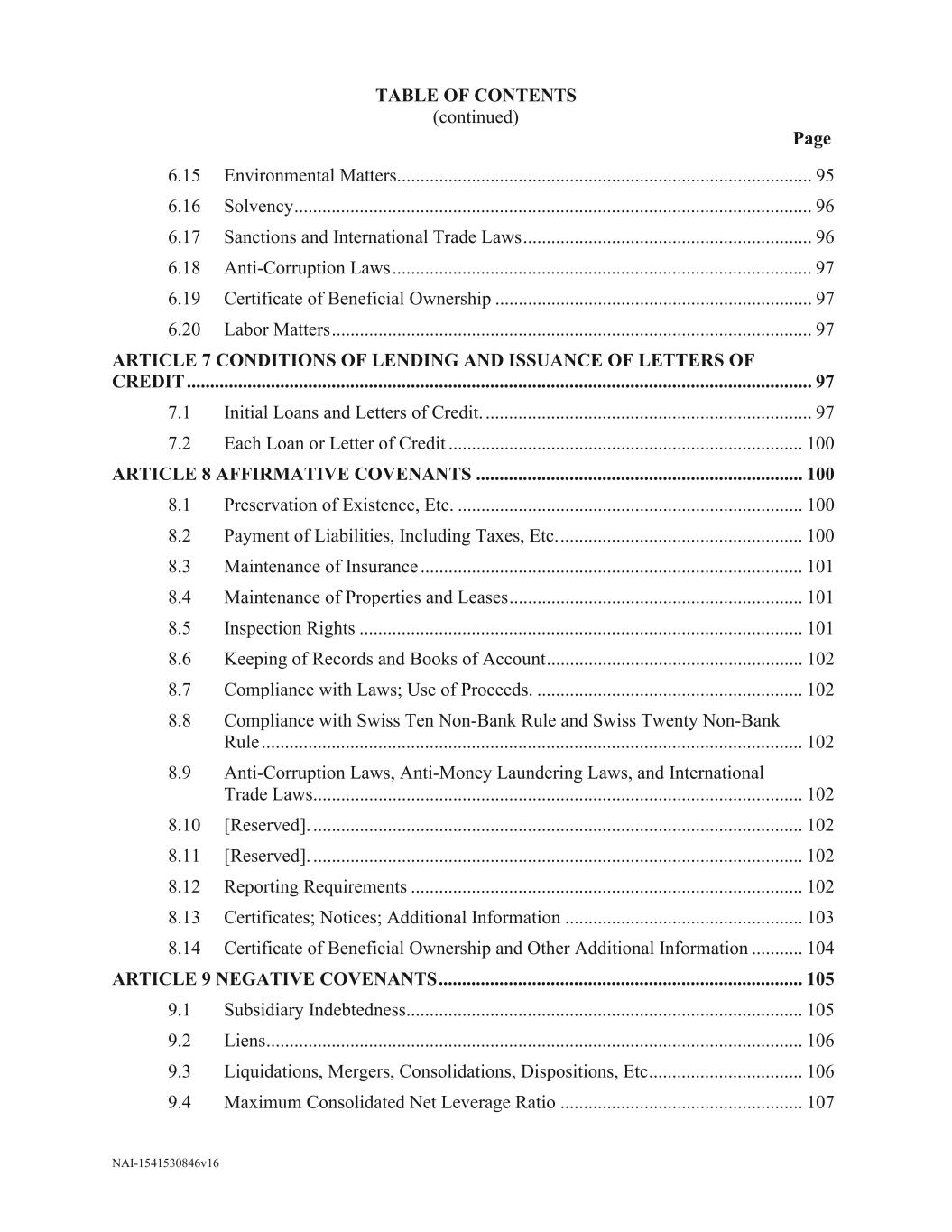 NAI-1541530846v16 TABLE OF CONTENTS (continued) Page 6.15 Environmental Matters......................................................................................... 95 6.16 Solvency ............................................................................................................... 96 6.17 Sanctions and International Trade Laws .............................................................. 96 6.18 Anti-Corruption Laws .......................................................................................... 97 6.19 Certificate of Beneficial Ownership .................................................................... 97 6.20 Labor Matters ....................................................................................................... 97 ARTICLE 7 CONDITIONS OF LENDING AND ISSUANCE OF LETTERS OF CREDIT ...................................................................................................................................... 97 7.1 Initial Loans and Letters of Credit. ...................................................................... 97 7.2 Each Loan or Letter of Credit ............................................................................ 100 ARTICLE 8 AFFIRMATIVE COVENANTS ...................................................................... 100 8.1 Preservation of Existence, Etc. .......................................................................... 100 8.2 Payment of Liabilities, Including Taxes, Etc. .................................................... 100 8.3 Maintenance of Insurance .................................................................................. 101 8.4 Maintenance of Properties and Leases ............................................................... 101 8.5 Inspection Rights ............................................................................................... 101 8.6 Keeping of Records and Books of Account ....................................................... 102 8.7 Compliance with Laws; Use of Proceeds. ......................................................... 102 8.8 Compliance with Swiss Ten Non-Bank Rule and Swiss Twenty Non-Bank Rule .................................................................................................................... 102 8.9 Anti-Corruption Laws, Anti-Money Laundering Laws, and International Trade Laws......................................................................................................... 102 8.10 [Reserved]. ......................................................................................................... 102 8.11 [Reserved]. ......................................................................................................... 102 8.12 Reporting Requirements .................................................................................... 102 8.13 Certificates; Notices; Additional Information ................................................... 103 8.14 Certificate of Beneficial Ownership and Other Additional Information ........... 104 ARTICLE 9 NEGATIVE COVENANTS .............................................................................. 105 9.1 Subsidiary Indebtedness..................................................................................... 105 9.2 Liens ................................................................................................................... 106 9.3 Liquidations, Mergers, Consolidations, Dispositions, Etc ................................. 106 9.4 Maximum Consolidated Net Leverage Ratio .................................................... 107