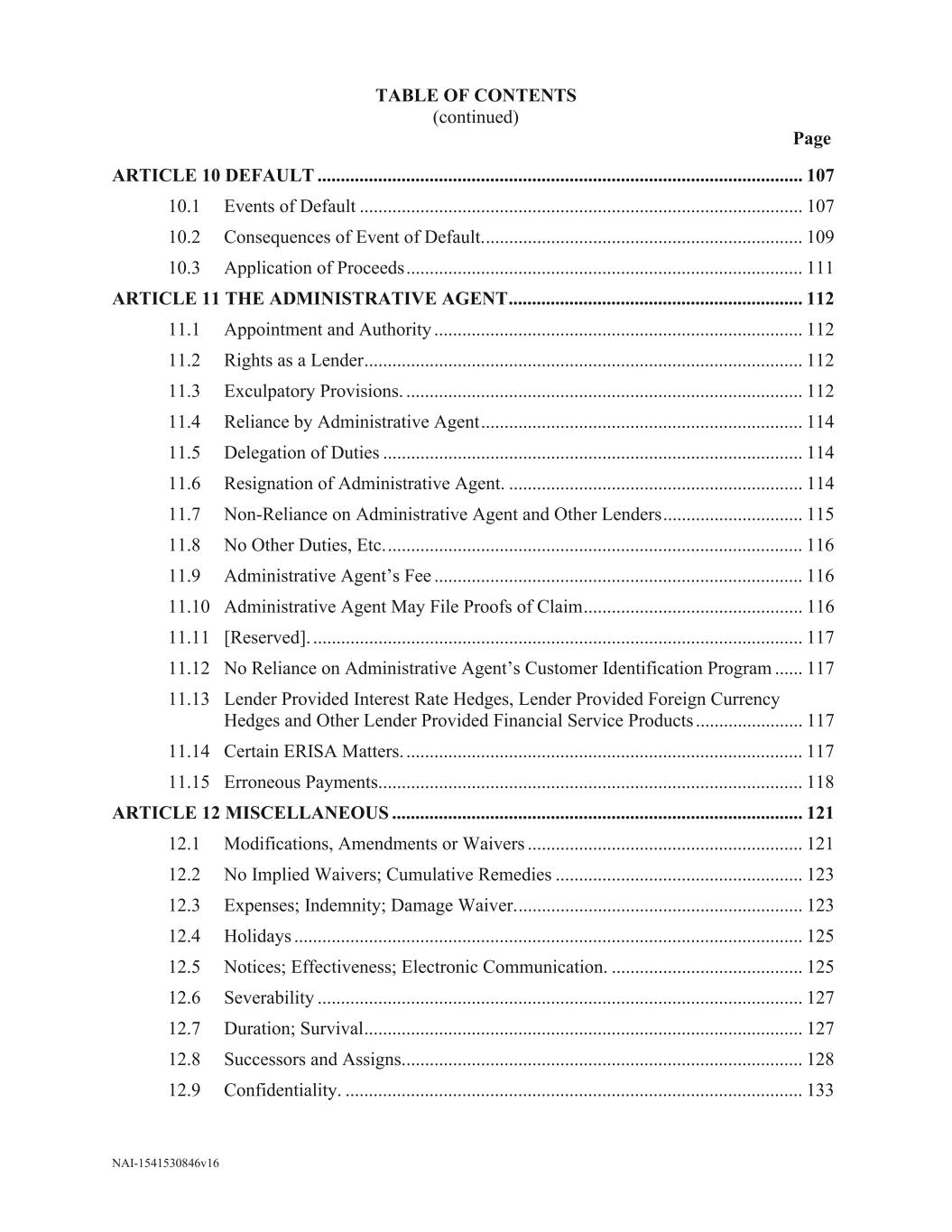 NAI-1541530846v16 TABLE OF CONTENTS (continued) Page ARTICLE 10 DEFAULT ........................................................................................................ 107 10.1 Events of Default ............................................................................................... 107 10.2 Consequences of Event of Default. .................................................................... 109 10.3 Application of Proceeds ..................................................................................... 111 ARTICLE 11 THE ADMINISTRATIVE AGENT ............................................................... 112 11.1 Appointment and Authority ............................................................................... 112 11.2 Rights as a Lender .............................................................................................. 112 11.3 Exculpatory Provisions. ..................................................................................... 112 11.4 Reliance by Administrative Agent ..................................................................... 114 11.5 Delegation of Duties .......................................................................................... 114 11.6 Resignation of Administrative Agent. ............................................................... 114 11.7 Non-Reliance on Administrative Agent and Other Lenders .............................. 115 11.8 No Other Duties, Etc. ......................................................................................... 116 11.9 Administrative Agent’s Fee ............................................................................... 116 11.10 Administrative Agent May File Proofs of Claim ............................................... 116 11.11 [Reserved]. ......................................................................................................... 117 11.12 No Reliance on Administrative Agent’s Customer Identification Program ...... 117 11.13 Lender Provided Interest Rate Hedges, Lender Provided Foreign Currency Hedges and Other Lender Provided Financial Service Products ....................... 117 11.14 Certain ERISA Matters. ..................................................................................... 117 11.15 Erroneous Payments........................................................................................... 118 ARTICLE 12 MISCELLANEOUS ........................................................................................ 121 12.1 Modifications, Amendments or Waivers ........................................................... 121 12.2 No Implied Waivers; Cumulative Remedies ..................................................... 123 12.3 Expenses; Indemnity; Damage Waiver. ............................................................. 123 12.4 Holidays ............................................................................................................. 125 12.5 Notices; Effectiveness; Electronic Communication. ......................................... 125 12.6 Severability ........................................................................................................ 127 12.7 Duration; Survival .............................................................................................. 127 12.8 Successors and Assigns...................................................................................... 128 12.9 Confidentiality. .................................................................................................. 133
