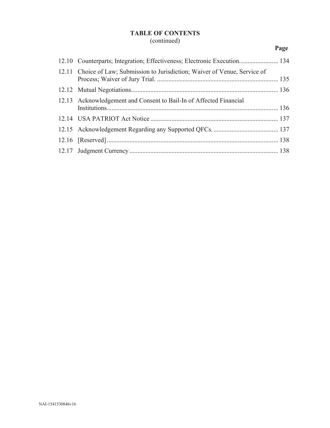 NAI-1541530846v16 TABLE OF CONTENTS (continued) Page 12.10 Counterparts; Integration; Effectiveness; Electronic Execution. ....................... 134 12.11 Choice of Law; Submission to Jurisdiction; Waiver of Venue, Service of Process; Waiver of Jury Trial. ........................................................................... 135 12.12 Mutual Negotiations........................................................................................... 136 12.13 Acknowledgement and Consent to Bail-In of Affected Financial Institutions.......................................................................................................... 136 12.14 USA PATRIOT Act Notice ............................................................................... 137 12.15 Acknowledgement Regarding any Supported QFCs. ........................................ 137 12.16 [Reserved] .......................................................................................................... 138 12.17 Judgment Currency ............................................................................................ 138