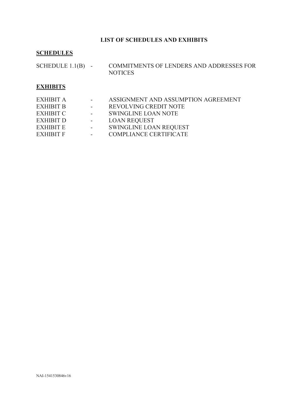 NAI-1541530846v16 LIST OF SCHEDULES AND EXHIBITS SCHEDULES SCHEDULE 1.1(B) - COMMITMENTS OF LENDERS AND ADDRESSES FOR NOTICES EXHIBITS EXHIBIT A - ASSIGNMENT AND ASSUMPTION AGREEMENT EXHIBIT B - REVOLVING CREDIT NOTE EXHIBIT C - SWINGLINE LOAN NOTE EXHIBIT D - LOAN REQUEST EXHIBIT E - SWINGLINE LOAN REQUEST EXHIBIT F - COMPLIANCE CERTIFICATE