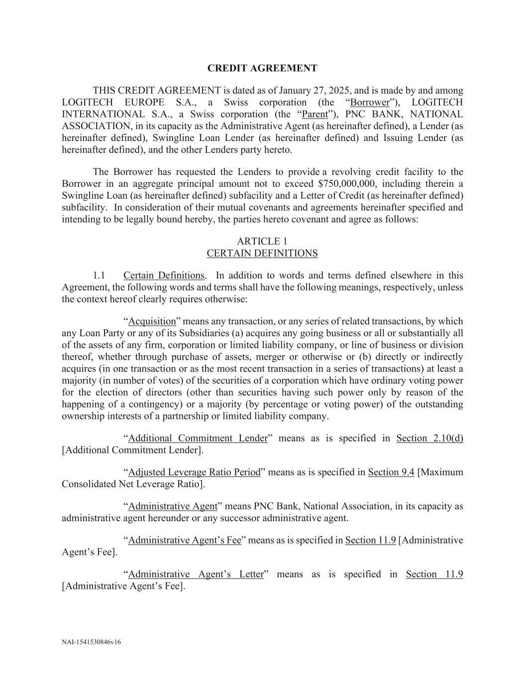 NAI-1541530846v16 CREDIT AGREEMENT THIS CREDIT AGREEMENT is dated as of January 27, 2025, and is made by and among LOGITECH EUROPE S.A., a Swiss corporation (the “Borrower”), LOGITECH INTERNATIONAL S.A., a Swiss corporation (the “Parent”), PNC BANK, NATIONAL ASSOCIATION, in its capacity as the Administrative Agent (as hereinafter defined), a Lender (as hereinafter defined), Swingline Loan Lender (as hereinafter defined) and Issuing Lender (as hereinafter defined), and the other Lenders party hereto. The Borrower has requested the Lenders to provide a revolving credit facility to the Borrower in an aggregate principal amount not to exceed $750,000,000, including therein a Swingline Loan (as hereinafter defined) subfacility and a Letter of Credit (as hereinafter defined) subfacility. In consideration of their mutual covenants and agreements hereinafter specified and intending to be legally bound hereby, the parties hereto covenant and agree as follows: ARTICLE 1 CERTAIN DEFINITIONS 1.1 Certain Definitions. In addition to words and terms defined elsewhere in this Agreement, the following words and terms shall have the following meanings, respectively, unless the context hereof clearly requires otherwise: “Acquisition” means any transaction, or any series of related transactions, by which any Loan Party or any of its Subsidiaries (a) acquires any going business or all or substantially all of the assets of any firm, corporation or limited liability company, or line of business or division thereof, whether through purchase of assets, merger or otherwise or (b) directly or indirectly acquires (in one transaction or as the most recent transaction in a series of transactions) at least a majority (in number of votes) of the securities of a corporation which have ordinary voting power for the election of directors (other than securities having such power only by reason of the happening of a contingency) or a majority (by percentage or voting power) of the outstanding ownership interests of a partnership or limited liability company. “Additional Commitment Lender” means as is specified in Section 2.10(d) [Additional Commitment Lender]. “Adjusted Leverage Ratio Period” means as is specified in Section 9.4 [Maximum Consolidated Net Leverage Ratio]. “Administrative Agent” means PNC Bank, National Association, in its capacity as administrative agent hereunder or any successor administrative agent. “Administrative Agent’s Fee” means as is specified in Section 11.9 [Administrative Agent’s Fee]. “Administrative Agent’s Letter” means as is specified in Section 11.9 [Administrative Agent’s Fee].