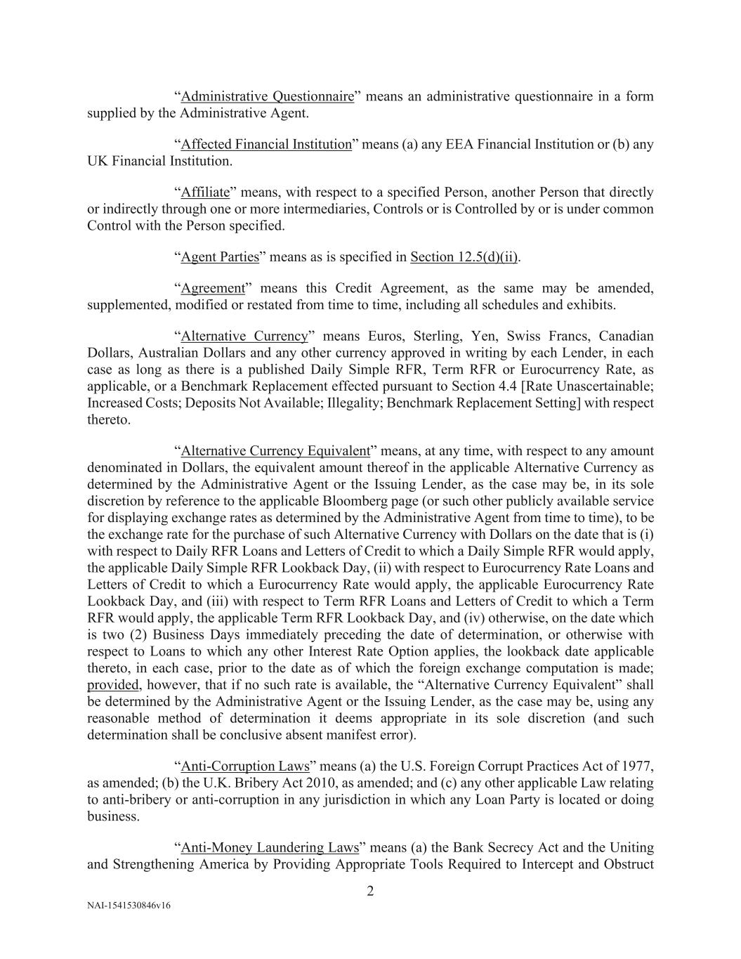NAI-1541530846v16 2 “Administrative Questionnaire” means an administrative questionnaire in a form supplied by the Administrative Agent. “Affected Financial Institution” means (a) any EEA Financial Institution or (b) any UK Financial Institution. “Affiliate” means, with respect to a specified Person, another Person that directly or indirectly through one or more intermediaries, Controls or is Controlled by or is under common Control with the Person specified. “Agent Parties” means as is specified in Section 12.5(d)(ii). “Agreement” means this Credit Agreement, as the same may be amended, supplemented, modified or restated from time to time, including all schedules and exhibits. “Alternative Currency” means Euros, Sterling, Yen, Swiss Francs, Canadian Dollars, Australian Dollars and any other currency approved in writing by each Lender, in each case as long as there is a published Daily Simple RFR, Term RFR or Eurocurrency Rate, as applicable, or a Benchmark Replacement effected pursuant to Section 4.4 [Rate Unascertainable; Increased Costs; Deposits Not Available; Illegality; Benchmark Replacement Setting] with respect thereto. “Alternative Currency Equivalent” means, at any time, with respect to any amount denominated in Dollars, the equivalent amount thereof in the applicable Alternative Currency as determined by the Administrative Agent or the Issuing Lender, as the case may be, in its sole discretion by reference to the applicable Bloomberg page (or such other publicly available service for displaying exchange rates as determined by the Administrative Agent from time to time), to be the exchange rate for the purchase of such Alternative Currency with Dollars on the date that is (i) with respect to Daily RFR Loans and Letters of Credit to which a Daily Simple RFR would apply, the applicable Daily Simple RFR Lookback Day, (ii) with respect to Eurocurrency Rate Loans and Letters of Credit to which a Eurocurrency Rate would apply, the applicable Eurocurrency Rate Lookback Day, and (iii) with respect to Term RFR Loans and Letters of Credit to which a Term RFR would apply, the applicable Term RFR Lookback Day, and (iv) otherwise, on the date which is two (2) Business Days immediately preceding the date of determination, or otherwise with respect to Loans to which any other Interest Rate Option applies, the lookback date applicable thereto, in each case, prior to the date as of which the foreign exchange computation is made; provided, however, that if no such rate is available, the “Alternative Currency Equivalent” shall be determined by the Administrative Agent or the Issuing Lender, as the case may be, using any reasonable method of determination it deems appropriate in its sole discretion (and such determination shall be conclusive absent manifest error). “Anti-Corruption Laws” means (a) the U.S. Foreign Corrupt Practices Act of 1977, as amended; (b) the U.K. Bribery Act 2010, as amended; and (c) any other applicable Law relating to anti-bribery or anti-corruption in any jurisdiction in which any Loan Party is located or doing business. “Anti-Money Laundering Laws” means (a) the Bank Secrecy Act and the Uniting and Strengthening America by Providing Appropriate Tools Required to Intercept and Obstruct