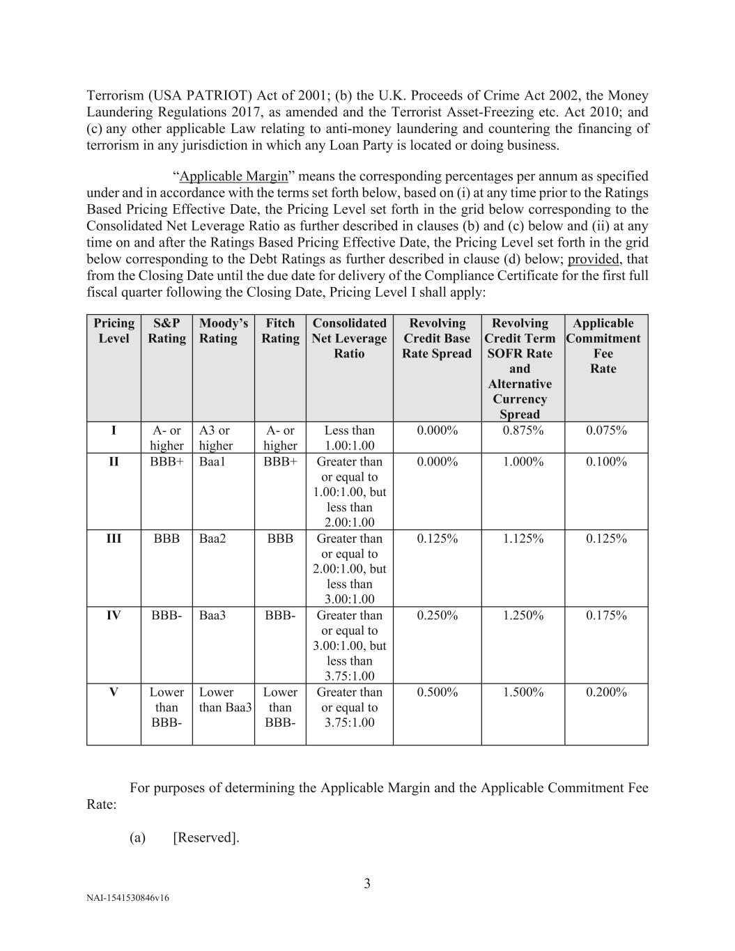 NAI-1541530846v16 3 Terrorism (USA PATRIOT) Act of 2001; (b) the U.K. Proceeds of Crime Act 2002, the Money Laundering Regulations 2017, as amended and the Terrorist Asset-Freezing etc. Act 2010; and (c) any other applicable Law relating to anti-money laundering and countering the financing of terrorism in any jurisdiction in which any Loan Party is located or doing business. “Applicable Margin” means the corresponding percentages per annum as specified under and in accordance with the terms set forth below, based on (i) at any time prior to the Ratings Based Pricing Effective Date, the Pricing Level set forth in the grid below corresponding to the Consolidated Net Leverage Ratio as further described in clauses (b) and (c) below and (ii) at any time on and after the Ratings Based Pricing Effective Date, the Pricing Level set forth in the grid below corresponding to the Debt Ratings as further described in clause (d) below; provided, that from the Closing Date until the due date for delivery of the Compliance Certificate for the first full fiscal quarter following the Closing Date, Pricing Level I shall apply: Pricing Level S&P Rating Moody’s Rating Fitch Rating Consolidated Net Leverage Ratio Revolving Credit Base Rate Spread Revolving Credit Term SOFR Rate and Alternative Currency Spread Applicable Commitment Fee Rate I A- or higher A3 or higher A- or higher Less than 1.00:1.00 0.000% 0.875% 0.075% II BBB+ Baa1 BBB+ Greater than or equal to 1.00:1.00, but less than 2.00:1.00 0.000% 1.000% 0.100% III BBB Baa2 BBB Greater than or equal to 2.00:1.00, but less than 3.00:1.00 0.125% 1.125% 0.125% IV BBB- Baa3 BBB- Greater than or equal to 3.00:1.00, but less than 3.75:1.00 0.250% 1.250% 0.175% V Lower than BBB- Lower than Baa3 Lower than BBB- Greater than or equal to 3.75:1.00 0.500% 1.500% 0.200% For purposes of determining the Applicable Margin and the Applicable Commitment Fee Rate: (a) [Reserved].