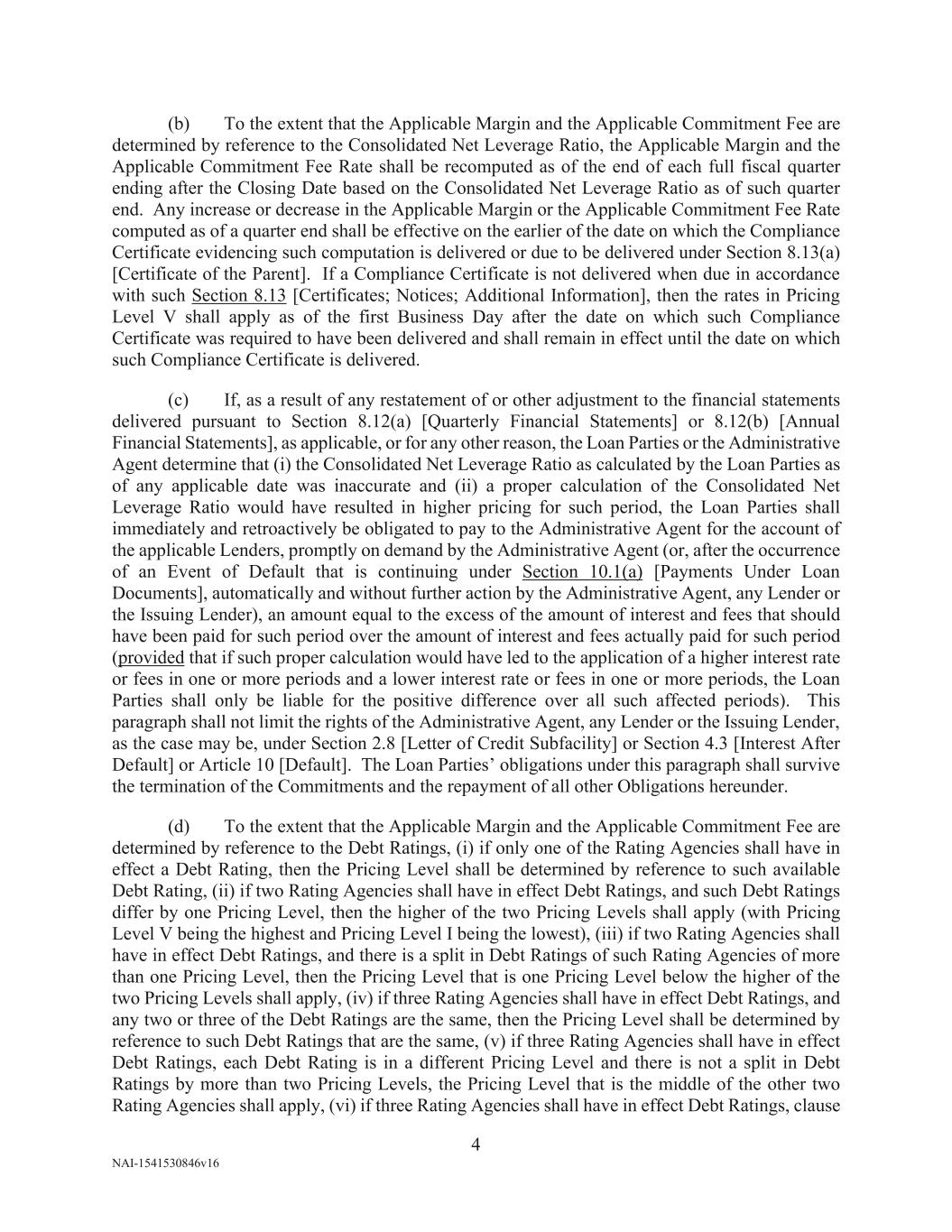 NAI-1541530846v16 4 (b) To the extent that the Applicable Margin and the Applicable Commitment Fee are determined by reference to the Consolidated Net Leverage Ratio, the Applicable Margin and the Applicable Commitment Fee Rate shall be recomputed as of the end of each full fiscal quarter ending after the Closing Date based on the Consolidated Net Leverage Ratio as of such quarter end. Any increase or decrease in the Applicable Margin or the Applicable Commitment Fee Rate computed as of a quarter end shall be effective on the earlier of the date on which the Compliance Certificate evidencing such computation is delivered or due to be delivered under Section 8.13(a) [Certificate of the Parent]. If a Compliance Certificate is not delivered when due in accordance with such Section 8.13 [Certificates; Notices; Additional Information], then the rates in Pricing Level V shall apply as of the first Business Day after the date on which such Compliance Certificate was required to have been delivered and shall remain in effect until the date on which such Compliance Certificate is delivered. (c) If, as a result of any restatement of or other adjustment to the financial statements delivered pursuant to Section 8.12(a) [Quarterly Financial Statements] or 8.12(b) [Annual Financial Statements], as applicable, or for any other reason, the Loan Parties or the Administrative Agent determine that (i) the Consolidated Net Leverage Ratio as calculated by the Loan Parties as of any applicable date was inaccurate and (ii) a proper calculation of the Consolidated Net Leverage Ratio would have resulted in higher pricing for such period, the Loan Parties shall immediately and retroactively be obligated to pay to the Administrative Agent for the account of the applicable Lenders, promptly on demand by the Administrative Agent (or, after the occurrence of an Event of Default that is continuing under Section 10.1(a) [Payments Under Loan Documents], automatically and without further action by the Administrative Agent, any Lender or the Issuing Lender), an amount equal to the excess of the amount of interest and fees that should have been paid for such period over the amount of interest and fees actually paid for such period (provided that if such proper calculation would have led to the application of a higher interest rate or fees in one or more periods and a lower interest rate or fees in one or more periods, the Loan Parties shall only be liable for the positive difference over all such affected periods). This paragraph shall not limit the rights of the Administrative Agent, any Lender or the Issuing Lender, as the case may be, under Section 2.8 [Letter of Credit Subfacility] or Section 4.3 [Interest After Default] or Article 10 [Default]. The Loan Parties’ obligations under this paragraph shall survive the termination of the Commitments and the repayment of all other Obligations hereunder. (d) To the extent that the Applicable Margin and the Applicable Commitment Fee are determined by reference to the Debt Ratings, (i) if only one of the Rating Agencies shall have in effect a Debt Rating, then the Pricing Level shall be determined by reference to such available Debt Rating, (ii) if two Rating Agencies shall have in effect Debt Ratings, and such Debt Ratings differ by one Pricing Level, then the higher of the two Pricing Levels shall apply (with Pricing Level V being the highest and Pricing Level I being the lowest), (iii) if two Rating Agencies shall have in effect Debt Ratings, and there is a split in Debt Ratings of such Rating Agencies of more than one Pricing Level, then the Pricing Level that is one Pricing Level below the higher of the two Pricing Levels shall apply, (iv) if three Rating Agencies shall have in effect Debt Ratings, and any two or three of the Debt Ratings are the same, then the Pricing Level shall be determined by reference to such Debt Ratings that are the same, (v) if three Rating Agencies shall have in effect Debt Ratings, each Debt Rating is in a different Pricing Level and there is not a split in Debt Ratings by more than two Pricing Levels, the Pricing Level that is the middle of the other two Rating Agencies shall apply, (vi) if three Rating Agencies shall have in effect Debt Ratings, clause