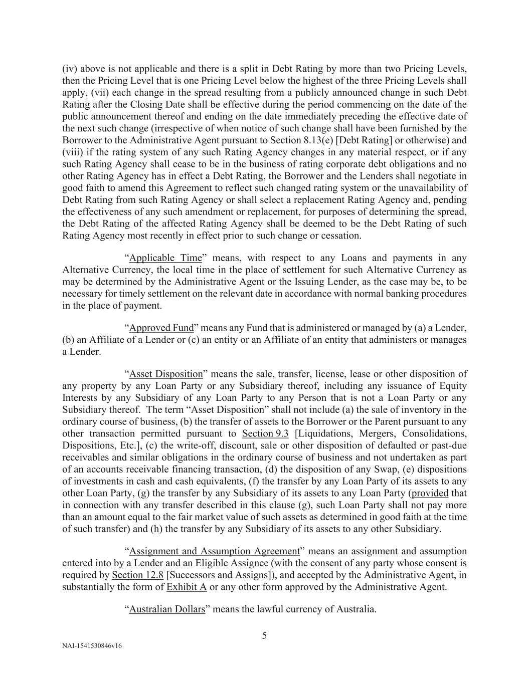 NAI-1541530846v16 5 (iv) above is not applicable and there is a split in Debt Rating by more than two Pricing Levels, then the Pricing Level that is one Pricing Level below the highest of the three Pricing Levels shall apply, (vii) each change in the spread resulting from a publicly announced change in such Debt Rating after the Closing Date shall be effective during the period commencing on the date of the public announcement thereof and ending on the date immediately preceding the effective date of the next such change (irrespective of when notice of such change shall have been furnished by the Borrower to the Administrative Agent pursuant to Section 8.13(e) [Debt Rating] or otherwise) and (viii) if the rating system of any such Rating Agency changes in any material respect, or if any such Rating Agency shall cease to be in the business of rating corporate debt obligations and no other Rating Agency has in effect a Debt Rating, the Borrower and the Lenders shall negotiate in good faith to amend this Agreement to reflect such changed rating system or the unavailability of Debt Rating from such Rating Agency or shall select a replacement Rating Agency and, pending the effectiveness of any such amendment or replacement, for purposes of determining the spread, the Debt Rating of the affected Rating Agency shall be deemed to be the Debt Rating of such Rating Agency most recently in effect prior to such change or cessation. “Applicable Time” means, with respect to any Loans and payments in any Alternative Currency, the local time in the place of settlement for such Alternative Currency as may be determined by the Administrative Agent or the Issuing Lender, as the case may be, to be necessary for timely settlement on the relevant date in accordance with normal banking procedures in the place of payment. “Approved Fund” means any Fund that is administered or managed by (a) a Lender, (b) an Affiliate of a Lender or (c) an entity or an Affiliate of an entity that administers or manages a Lender. “Asset Disposition” means the sale, transfer, license, lease or other disposition of any property by any Loan Party or any Subsidiary thereof, including any issuance of Equity Interests by any Subsidiary of any Loan Party to any Person that is not a Loan Party or any Subsidiary thereof. The term “Asset Disposition” shall not include (a) the sale of inventory in the ordinary course of business, (b) the transfer of assets to the Borrower or the Parent pursuant to any other transaction permitted pursuant to Section 9.3 [Liquidations, Mergers, Consolidations, Dispositions, Etc.], (c) the write-off, discount, sale or other disposition of defaulted or past-due receivables and similar obligations in the ordinary course of business and not undertaken as part of an accounts receivable financing transaction, (d) the disposition of any Swap, (e) dispositions of investments in cash and cash equivalents, (f) the transfer by any Loan Party of its assets to any other Loan Party, (g) the transfer by any Subsidiary of its assets to any Loan Party (provided that in connection with any transfer described in this clause (g), such Loan Party shall not pay more than an amount equal to the fair market value of such assets as determined in good faith at the time of such transfer) and (h) the transfer by any Subsidiary of its assets to any other Subsidiary. “Assignment and Assumption Agreement” means an assignment and assumption entered into by a Lender and an Eligible Assignee (with the consent of any party whose consent is required by Section 12.8 [Successors and Assigns]), and accepted by the Administrative Agent, in substantially the form of Exhibit A or any other form approved by the Administrative Agent. “Australian Dollars” means the lawful currency of Australia.