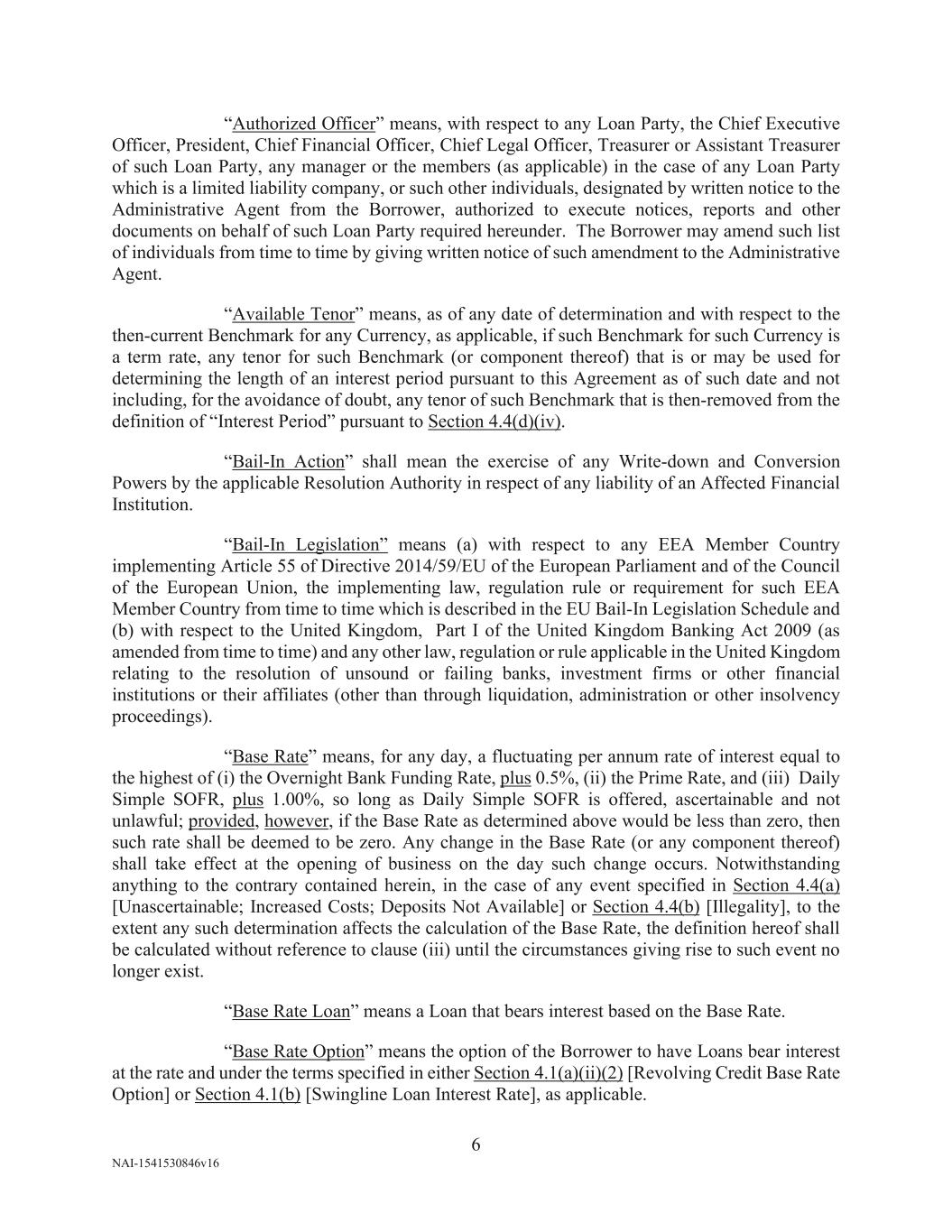 NAI-1541530846v16 6 “Authorized Officer” means, with respect to any Loan Party, the Chief Executive Officer, President, Chief Financial Officer, Chief Legal Officer, Treasurer or Assistant Treasurer of such Loan Party, any manager or the members (as applicable) in the case of any Loan Party which is a limited liability company, or such other individuals, designated by written notice to the Administrative Agent from the Borrower, authorized to execute notices, reports and other documents on behalf of such Loan Party required hereunder. The Borrower may amend such list of individuals from time to time by giving written notice of such amendment to the Administrative Agent. “Available Tenor” means, as of any date of determination and with respect to the then-current Benchmark for any Currency, as applicable, if such Benchmark for such Currency is a term rate, any tenor for such Benchmark (or component thereof) that is or may be used for determining the length of an interest period pursuant to this Agreement as of such date and not including, for the avoidance of doubt, any tenor of such Benchmark that is then-removed from the definition of “Interest Period” pursuant to Section 4.4(d)(iv). “Bail-In Action” shall mean the exercise of any Write-down and Conversion Powers by the applicable Resolution Authority in respect of any liability of an Affected Financial Institution. “Bail-In Legislation” means (a) with respect to any EEA Member Country implementing Article 55 of Directive 2014/59/EU of the European Parliament and of the Council of the European Union, the implementing law, regulation rule or requirement for such EEA Member Country from time to time which is described in the EU Bail-In Legislation Schedule and (b) with respect to the United Kingdom, Part I of the United Kingdom Banking Act 2009 (as amended from time to time) and any other law, regulation or rule applicable in the United Kingdom relating to the resolution of unsound or failing banks, investment firms or other financial institutions or their affiliates (other than through liquidation, administration or other insolvency proceedings). “Base Rate” means, for any day, a fluctuating per annum rate of interest equal to the highest of (i) the Overnight Bank Funding Rate, plus 0.5%, (ii) the Prime Rate, and (iii) Daily Simple SOFR, plus 1.00%, so long as Daily Simple SOFR is offered, ascertainable and not unlawful; provided, however, if the Base Rate as determined above would be less than zero, then such rate shall be deemed to be zero. Any change in the Base Rate (or any component thereof) shall take effect at the opening of business on the day such change occurs. Notwithstanding anything to the contrary contained herein, in the case of any event specified in Section 4.4(a) [Unascertainable; Increased Costs; Deposits Not Available] or Section 4.4(b) [Illegality], to the extent any such determination affects the calculation of the Base Rate, the definition hereof shall be calculated without reference to clause (iii) until the circumstances giving rise to such event no longer exist. “Base Rate Loan” means a Loan that bears interest based on the Base Rate. “Base Rate Option” means the option of the Borrower to have Loans bear interest at the rate and under the terms specified in either Section 4.1(a)(ii)(2) [Revolving Credit Base Rate Option] or Section 4.1(b) [Swingline Loan Interest Rate], as applicable.