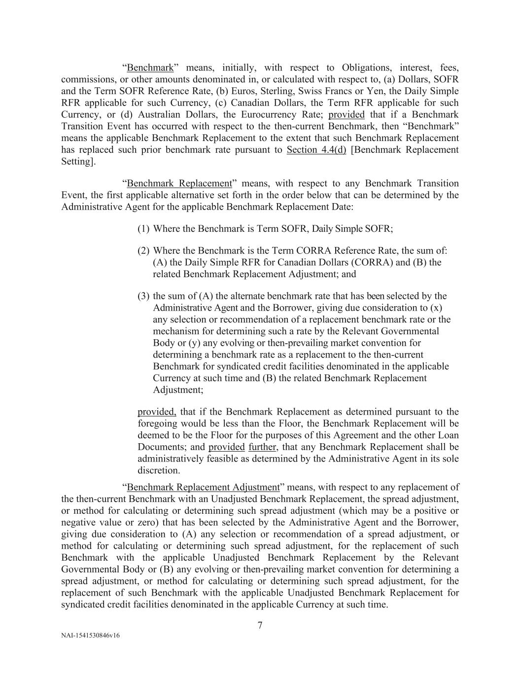 NAI-1541530846v16 7 “Benchmark” means, initially, with respect to Obligations, interest, fees, commissions, or other amounts denominated in, or calculated with respect to, (a) Dollars, SOFR and the Term SOFR Reference Rate, (b) Euros, Sterling, Swiss Francs or Yen, the Daily Simple RFR applicable for such Currency, (c) Canadian Dollars, the Term RFR applicable for such Currency, or (d) Australian Dollars, the Eurocurrency Rate; provided that if a Benchmark Transition Event has occurred with respect to the then-current Benchmark, then “Benchmark” means the applicable Benchmark Replacement to the extent that such Benchmark Replacement has replaced such prior benchmark rate pursuant to Section 4.4(d) [Benchmark Replacement Setting]. “Benchmark Replacement” means, with respect to any Benchmark Transition Event, the first applicable alternative set forth in the order below that can be determined by the Administrative Agent for the applicable Benchmark Replacement Date: (1) Where the Benchmark is Term SOFR, Daily Simple SOFR; (2) Where the Benchmark is the Term CORRA Reference Rate, the sum of: (A) the Daily Simple RFR for Canadian Dollars (CORRA) and (B) the related Benchmark Replacement Adjustment; and (3) the sum of (A) the alternate benchmark rate that has been selected by the Administrative Agent and the Borrower, giving due consideration to (x) any selection or recommendation of a replacement benchmark rate or the mechanism for determining such a rate by the Relevant Governmental Body or (y) any evolving or then-prevailing market convention for determining a benchmark rate as a replacement to the then-current Benchmark for syndicated credit facilities denominated in the applicable Currency at such time and (B) the related Benchmark Replacement Adjustment; provided, that if the Benchmark Replacement as determined pursuant to the foregoing would be less than the Floor, the Benchmark Replacement will be deemed to be the Floor for the purposes of this Agreement and the other Loan Documents; and provided further, that any Benchmark Replacement shall be administratively feasible as determined by the Administrative Agent in its sole discretion. “Benchmark Replacement Adjustment” means, with respect to any replacement of the then-current Benchmark with an Unadjusted Benchmark Replacement, the spread adjustment, or method for calculating or determining such spread adjustment (which may be a positive or negative value or zero) that has been selected by the Administrative Agent and the Borrower, giving due consideration to (A) any selection or recommendation of a spread adjustment, or method for calculating or determining such spread adjustment, for the replacement of such Benchmark with the applicable Unadjusted Benchmark Replacement by the Relevant Governmental Body or (B) any evolving or then-prevailing market convention for determining a spread adjustment, or method for calculating or determining such spread adjustment, for the replacement of such Benchmark with the applicable Unadjusted Benchmark Replacement for syndicated credit facilities denominated in the applicable Currency at such time.