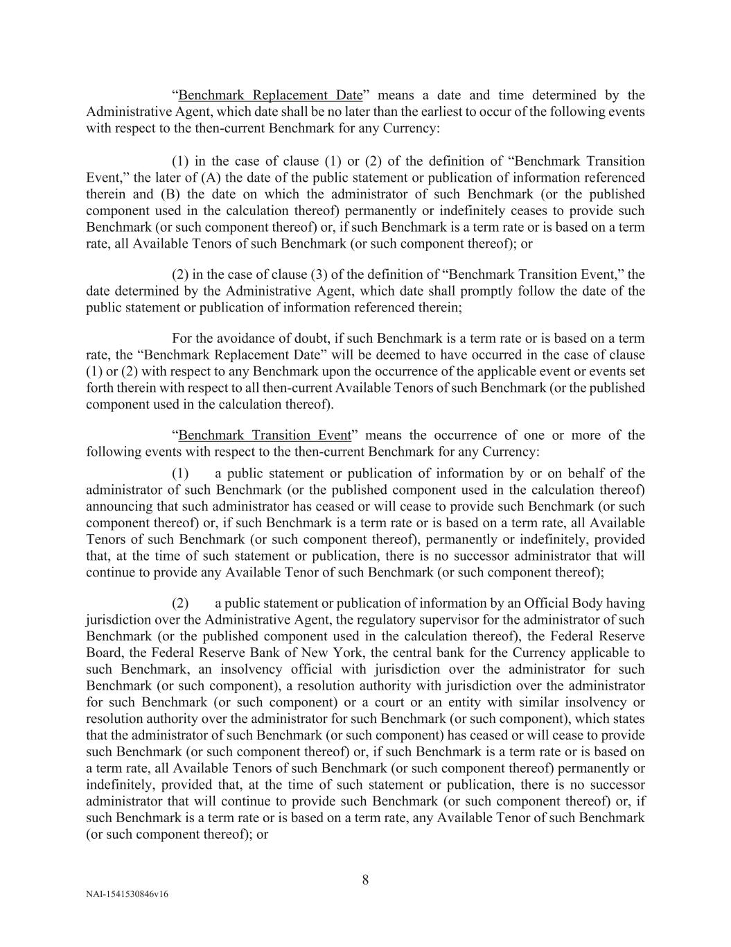 NAI-1541530846v16 8 “Benchmark Replacement Date” means a date and time determined by the Administrative Agent, which date shall be no later than the earliest to occur of the following events with respect to the then-current Benchmark for any Currency: (1) in the case of clause (1) or (2) of the definition of “Benchmark Transition Event,” the later of (A) the date of the public statement or publication of information referenced therein and (B) the date on which the administrator of such Benchmark (or the published component used in the calculation thereof) permanently or indefinitely ceases to provide such Benchmark (or such component thereof) or, if such Benchmark is a term rate or is based on a term rate, all Available Tenors of such Benchmark (or such component thereof); or (2) in the case of clause (3) of the definition of “Benchmark Transition Event,” the date determined by the Administrative Agent, which date shall promptly follow the date of the public statement or publication of information referenced therein; For the avoidance of doubt, if such Benchmark is a term rate or is based on a term rate, the “Benchmark Replacement Date” will be deemed to have occurred in the case of clause (1) or (2) with respect to any Benchmark upon the occurrence of the applicable event or events set forth therein with respect to all then-current Available Tenors of such Benchmark (or the published component used in the calculation thereof). “Benchmark Transition Event” means the occurrence of one or more of the following events with respect to the then-current Benchmark for any Currency: (1) a public statement or publication of information by or on behalf of the administrator of such Benchmark (or the published component used in the calculation thereof) announcing that such administrator has ceased or will cease to provide such Benchmark (or such component thereof) or, if such Benchmark is a term rate or is based on a term rate, all Available Tenors of such Benchmark (or such component thereof), permanently or indefinitely, provided that, at the time of such statement or publication, there is no successor administrator that will continue to provide any Available Tenor of such Benchmark (or such component thereof); (2) a public statement or publication of information by an Official Body having jurisdiction over the Administrative Agent, the regulatory supervisor for the administrator of such Benchmark (or the published component used in the calculation thereof), the Federal Reserve Board, the Federal Reserve Bank of New York, the central bank for the Currency applicable to such Benchmark, an insolvency official with jurisdiction over the administrator for such Benchmark (or such component), a resolution authority with jurisdiction over the administrator for such Benchmark (or such component) or a court or an entity with similar insolvency or resolution authority over the administrator for such Benchmark (or such component), which states that the administrator of such Benchmark (or such component) has ceased or will cease to provide such Benchmark (or such component thereof) or, if such Benchmark is a term rate or is based on a term rate, all Available Tenors of such Benchmark (or such component thereof) permanently or indefinitely, provided that, at the time of such statement or publication, there is no successor administrator that will continue to provide such Benchmark (or such component thereof) or, if such Benchmark is a term rate or is based on a term rate, any Available Tenor of such Benchmark (or such component thereof); or