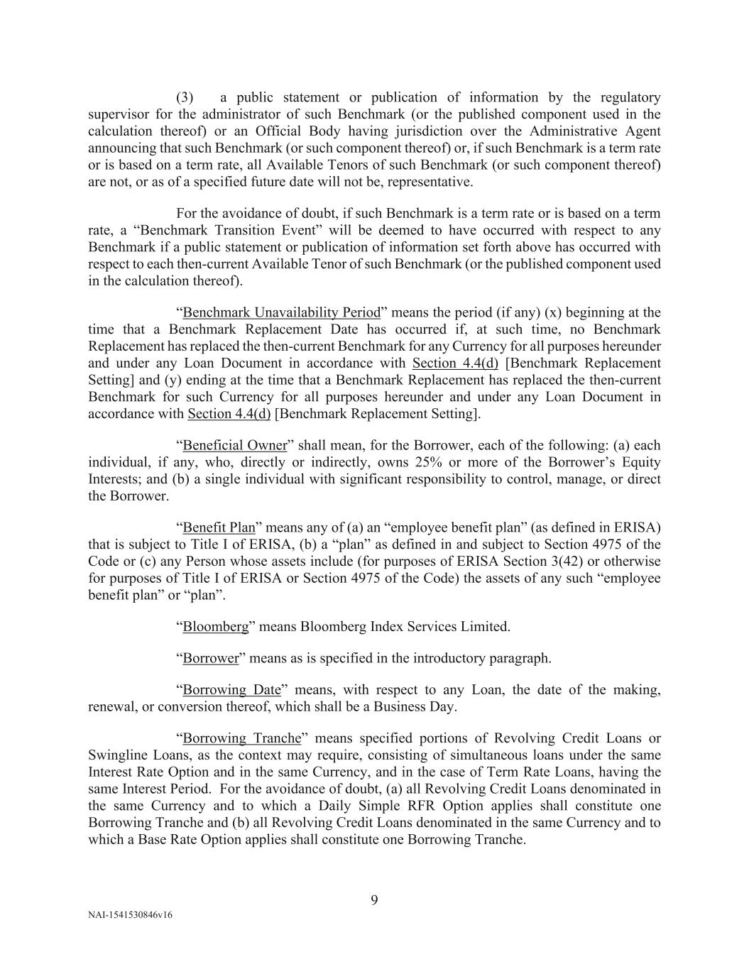 NAI-1541530846v16 9 (3) a public statement or publication of information by the regulatory supervisor for the administrator of such Benchmark (or the published component used in the calculation thereof) or an Official Body having jurisdiction over the Administrative Agent announcing that such Benchmark (or such component thereof) or, if such Benchmark is a term rate or is based on a term rate, all Available Tenors of such Benchmark (or such component thereof) are not, or as of a specified future date will not be, representative. For the avoidance of doubt, if such Benchmark is a term rate or is based on a term rate, a “Benchmark Transition Event” will be deemed to have occurred with respect to any Benchmark if a public statement or publication of information set forth above has occurred with respect to each then-current Available Tenor of such Benchmark (or the published component used in the calculation thereof). “Benchmark Unavailability Period” means the period (if any) (x) beginning at the time that a Benchmark Replacement Date has occurred if, at such time, no Benchmark Replacement has replaced the then-current Benchmark for any Currency for all purposes hereunder and under any Loan Document in accordance with Section 4.4(d) [Benchmark Replacement Setting] and (y) ending at the time that a Benchmark Replacement has replaced the then-current Benchmark for such Currency for all purposes hereunder and under any Loan Document in accordance with Section 4.4(d) [Benchmark Replacement Setting]. “Beneficial Owner” shall mean, for the Borrower, each of the following: (a) each individual, if any, who, directly or indirectly, owns 25% or more of the Borrower’s Equity Interests; and (b) a single individual with significant responsibility to control, manage, or direct the Borrower. “Benefit Plan” means any of (a) an “employee benefit plan” (as defined in ERISA) that is subject to Title I of ERISA, (b) a “plan” as defined in and subject to Section 4975 of the Code or (c) any Person whose assets include (for purposes of ERISA Section 3(42) or otherwise for purposes of Title I of ERISA or Section 4975 of the Code) the assets of any such “employee benefit plan” or “plan”. “Bloomberg” means Bloomberg Index Services Limited. “Borrower” means as is specified in the introductory paragraph. “Borrowing Date” means, with respect to any Loan, the date of the making, renewal, or conversion thereof, which shall be a Business Day. “Borrowing Tranche” means specified portions of Revolving Credit Loans or Swingline Loans, as the context may require, consisting of simultaneous loans under the same Interest Rate Option and in the same Currency, and in the case of Term Rate Loans, having the same Interest Period. For the avoidance of doubt, (a) all Revolving Credit Loans denominated in the same Currency and to which a Daily Simple RFR Option applies shall constitute one Borrowing Tranche and (b) all Revolving Credit Loans denominated in the same Currency and to which a Base Rate Option applies shall constitute one Borrowing Tranche.