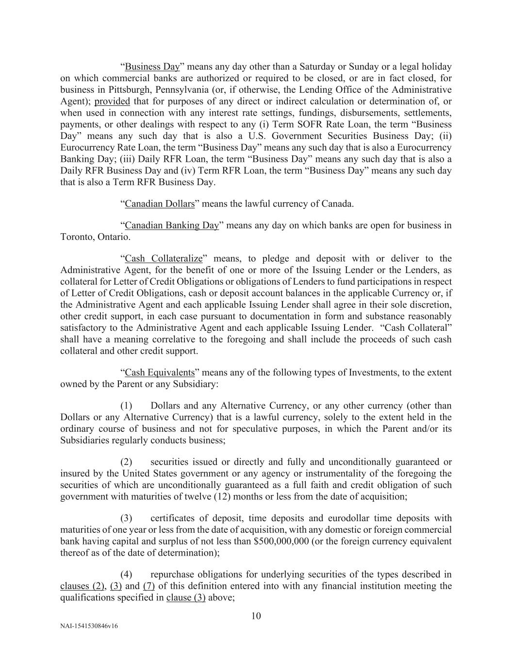 NAI-1541530846v16 10 “Business Day” means any day other than a Saturday or Sunday or a legal holiday on which commercial banks are authorized or required to be closed, or are in fact closed, for business in Pittsburgh, Pennsylvania (or, if otherwise, the Lending Office of the Administrative Agent); provided that for purposes of any direct or indirect calculation or determination of, or when used in connection with any interest rate settings, fundings, disbursements, settlements, payments, or other dealings with respect to any (i) Term SOFR Rate Loan, the term “Business Day” means any such day that is also a U.S. Government Securities Business Day; (ii) Eurocurrency Rate Loan, the term “Business Day” means any such day that is also a Eurocurrency Banking Day; (iii) Daily RFR Loan, the term “Business Day” means any such day that is also a Daily RFR Business Day and (iv) Term RFR Loan, the term “Business Day” means any such day that is also a Term RFR Business Day. “Canadian Dollars” means the lawful currency of Canada. “Canadian Banking Day” means any day on which banks are open for business in Toronto, Ontario. “Cash Collateralize” means, to pledge and deposit with or deliver to the Administrative Agent, for the benefit of one or more of the Issuing Lender or the Lenders, as collateral for Letter of Credit Obligations or obligations of Lenders to fund participations in respect of Letter of Credit Obligations, cash or deposit account balances in the applicable Currency or, if the Administrative Agent and each applicable Issuing Lender shall agree in their sole discretion, other credit support, in each case pursuant to documentation in form and substance reasonably satisfactory to the Administrative Agent and each applicable Issuing Lender. “Cash Collateral” shall have a meaning correlative to the foregoing and shall include the proceeds of such cash collateral and other credit support. “Cash Equivalents” means any of the following types of Investments, to the extent owned by the Parent or any Subsidiary: (1) Dollars and any Alternative Currency, or any other currency (other than Dollars or any Alternative Currency) that is a lawful currency, solely to the extent held in the ordinary course of business and not for speculative purposes, in which the Parent and/or its Subsidiaries regularly conducts business; (2) securities issued or directly and fully and unconditionally guaranteed or insured by the United States government or any agency or instrumentality of the foregoing the securities of which are unconditionally guaranteed as a full faith and credit obligation of such government with maturities of twelve (12) months or less from the date of acquisition; (3) certificates of deposit, time deposits and eurodollar time deposits with maturities of one year or less from the date of acquisition, with any domestic or foreign commercial bank having capital and surplus of not less than $500,000,000 (or the foreign currency equivalent thereof as of the date of determination); (4) repurchase obligations for underlying securities of the types described in clauses (2), (3) and (7) of this definition entered into with any financial institution meeting the qualifications specified in clause (3) above;