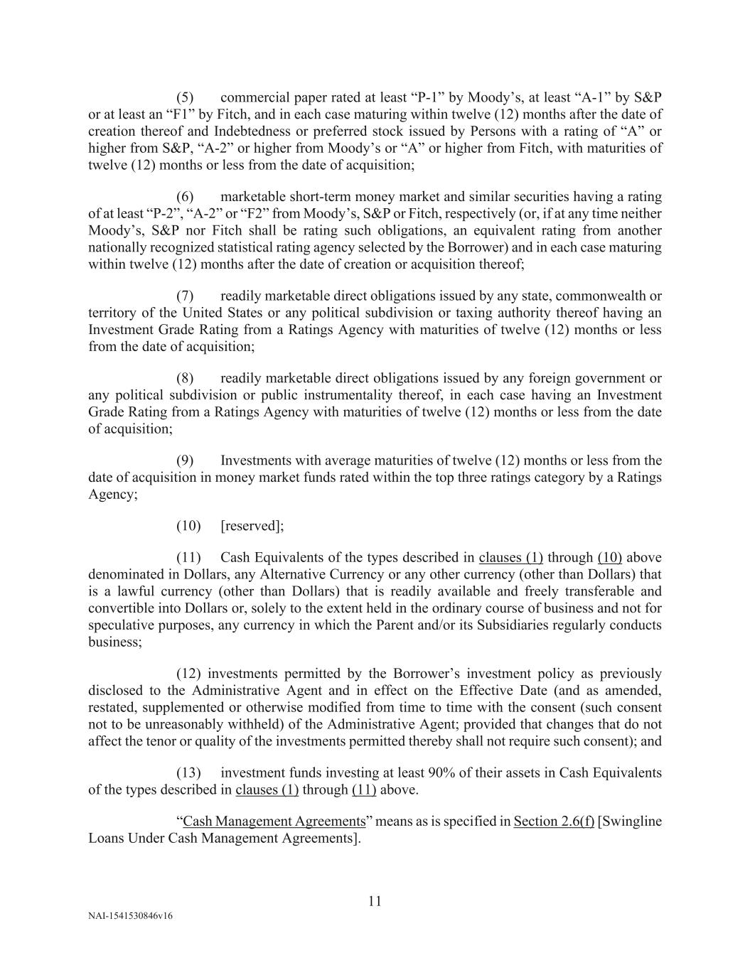 NAI-1541530846v16 11 (5) commercial paper rated at least “P-1” by Moody’s, at least “A-1” by S&P or at least an “F1” by Fitch, and in each case maturing within twelve (12) months after the date of creation thereof and Indebtedness or preferred stock issued by Persons with a rating of “A” or higher from S&P, “A-2” or higher from Moody’s or “A” or higher from Fitch, with maturities of twelve (12) months or less from the date of acquisition; (6) marketable short-term money market and similar securities having a rating of at least “P-2”, “A-2” or “F2” from Moody’s, S&P or Fitch, respectively (or, if at any time neither Moody’s, S&P nor Fitch shall be rating such obligations, an equivalent rating from another nationally recognized statistical rating agency selected by the Borrower) and in each case maturing within twelve (12) months after the date of creation or acquisition thereof; (7) readily marketable direct obligations issued by any state, commonwealth or territory of the United States or any political subdivision or taxing authority thereof having an Investment Grade Rating from a Ratings Agency with maturities of twelve (12) months or less from the date of acquisition; (8) readily marketable direct obligations issued by any foreign government or any political subdivision or public instrumentality thereof, in each case having an Investment Grade Rating from a Ratings Agency with maturities of twelve (12) months or less from the date of acquisition; (9) Investments with average maturities of twelve (12) months or less from the date of acquisition in money market funds rated within the top three ratings category by a Ratings Agency; (10) [reserved]; (11) Cash Equivalents of the types described in clauses (1) through (10) above denominated in Dollars, any Alternative Currency or any other currency (other than Dollars) that is a lawful currency (other than Dollars) that is readily available and freely transferable and convertible into Dollars or, solely to the extent held in the ordinary course of business and not for speculative purposes, any currency in which the Parent and/or its Subsidiaries regularly conducts business; (12) investments permitted by the Borrower’s investment policy as previously disclosed to the Administrative Agent and in effect on the Effective Date (and as amended, restated, supplemented or otherwise modified from time to time with the consent (such consent not to be unreasonably withheld) of the Administrative Agent; provided that changes that do not affect the tenor or quality of the investments permitted thereby shall not require such consent); and (13) investment funds investing at least 90% of their assets in Cash Equivalents of the types described in clauses (1) through (11) above. “Cash Management Agreements” means as is specified in Section 2.6(f) [Swingline Loans Under Cash Management Agreements].
