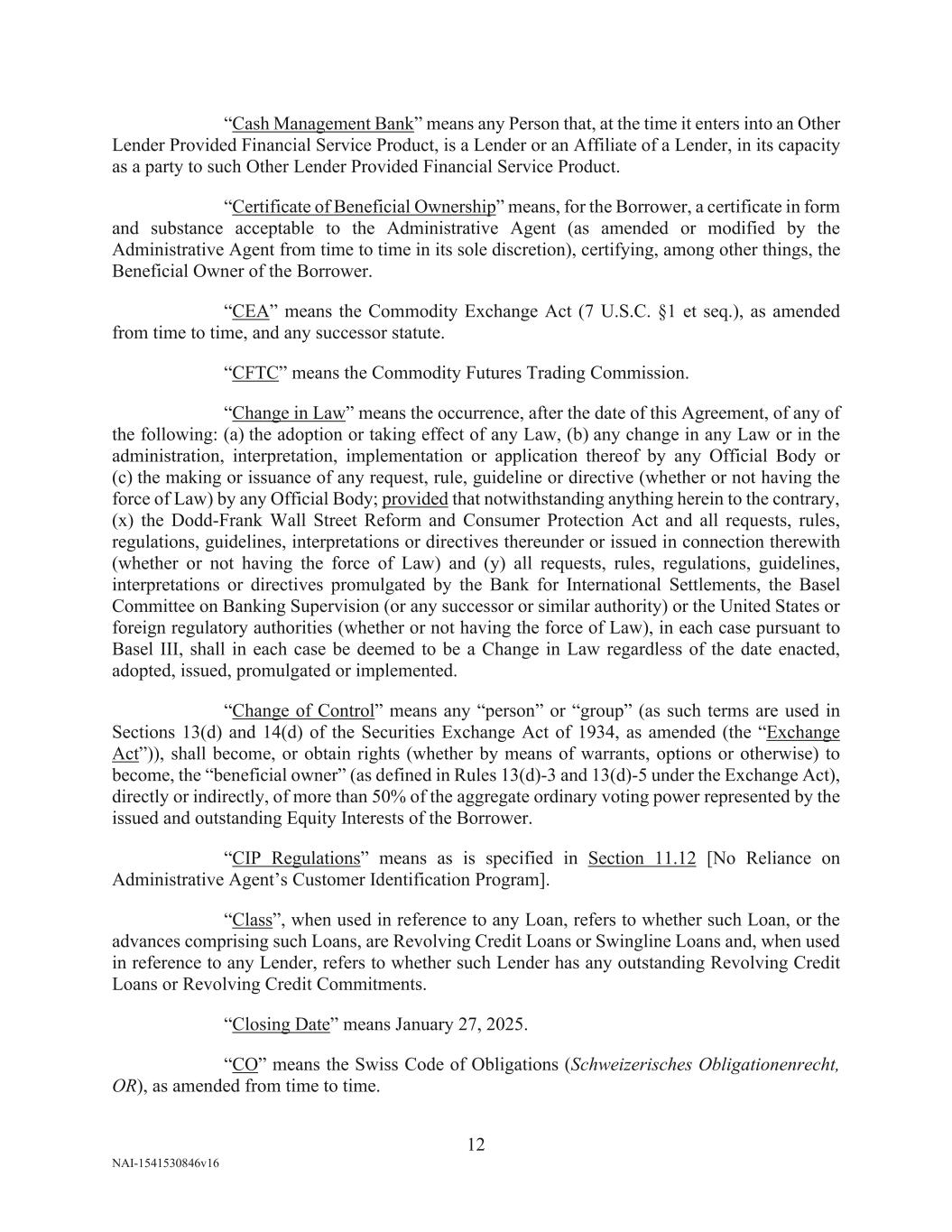 NAI-1541530846v16 12 “Cash Management Bank” means any Person that, at the time it enters into an Other Lender Provided Financial Service Product, is a Lender or an Affiliate of a Lender, in its capacity as a party to such Other Lender Provided Financial Service Product. “Certificate of Beneficial Ownership” means, for the Borrower, a certificate in form and substance acceptable to the Administrative Agent (as amended or modified by the Administrative Agent from time to time in its sole discretion), certifying, among other things, the Beneficial Owner of the Borrower. “CEA” means the Commodity Exchange Act (7 U.S.C. §1 et seq.), as amended from time to time, and any successor statute. “CFTC” means the Commodity Futures Trading Commission. “Change in Law” means the occurrence, after the date of this Agreement, of any of the following: (a) the adoption or taking effect of any Law, (b) any change in any Law or in the administration, interpretation, implementation or application thereof by any Official Body or (c) the making or issuance of any request, rule, guideline or directive (whether or not having the force of Law) by any Official Body; provided that notwithstanding anything herein to the contrary, (x) the Dodd-Frank Wall Street Reform and Consumer Protection Act and all requests, rules, regulations, guidelines, interpretations or directives thereunder or issued in connection therewith (whether or not having the force of Law) and (y) all requests, rules, regulations, guidelines, interpretations or directives promulgated by the Bank for International Settlements, the Basel Committee on Banking Supervision (or any successor or similar authority) or the United States or foreign regulatory authorities (whether or not having the force of Law), in each case pursuant to Basel III, shall in each case be deemed to be a Change in Law regardless of the date enacted, adopted, issued, promulgated or implemented. “Change of Control” means any “person” or “group” (as such terms are used in Sections 13(d) and 14(d) of the Securities Exchange Act of 1934, as amended (the “Exchange Act”)), shall become, or obtain rights (whether by means of warrants, options or otherwise) to become, the “beneficial owner” (as defined in Rules 13(d)-3 and 13(d)-5 under the Exchange Act), directly or indirectly, of more than 50% of the aggregate ordinary voting power represented by the issued and outstanding Equity Interests of the Borrower. “CIP Regulations” means as is specified in Section 11.12 [No Reliance on Administrative Agent’s Customer Identification Program]. “Class”, when used in reference to any Loan, refers to whether such Loan, or the advances comprising such Loans, are Revolving Credit Loans or Swingline Loans and, when used in reference to any Lender, refers to whether such Lender has any outstanding Revolving Credit Loans or Revolving Credit Commitments. “Closing Date” means January 27, 2025. “CO” means the Swiss Code of Obligations (Schweizerisches Obligationenrecht, OR), as amended from time to time.