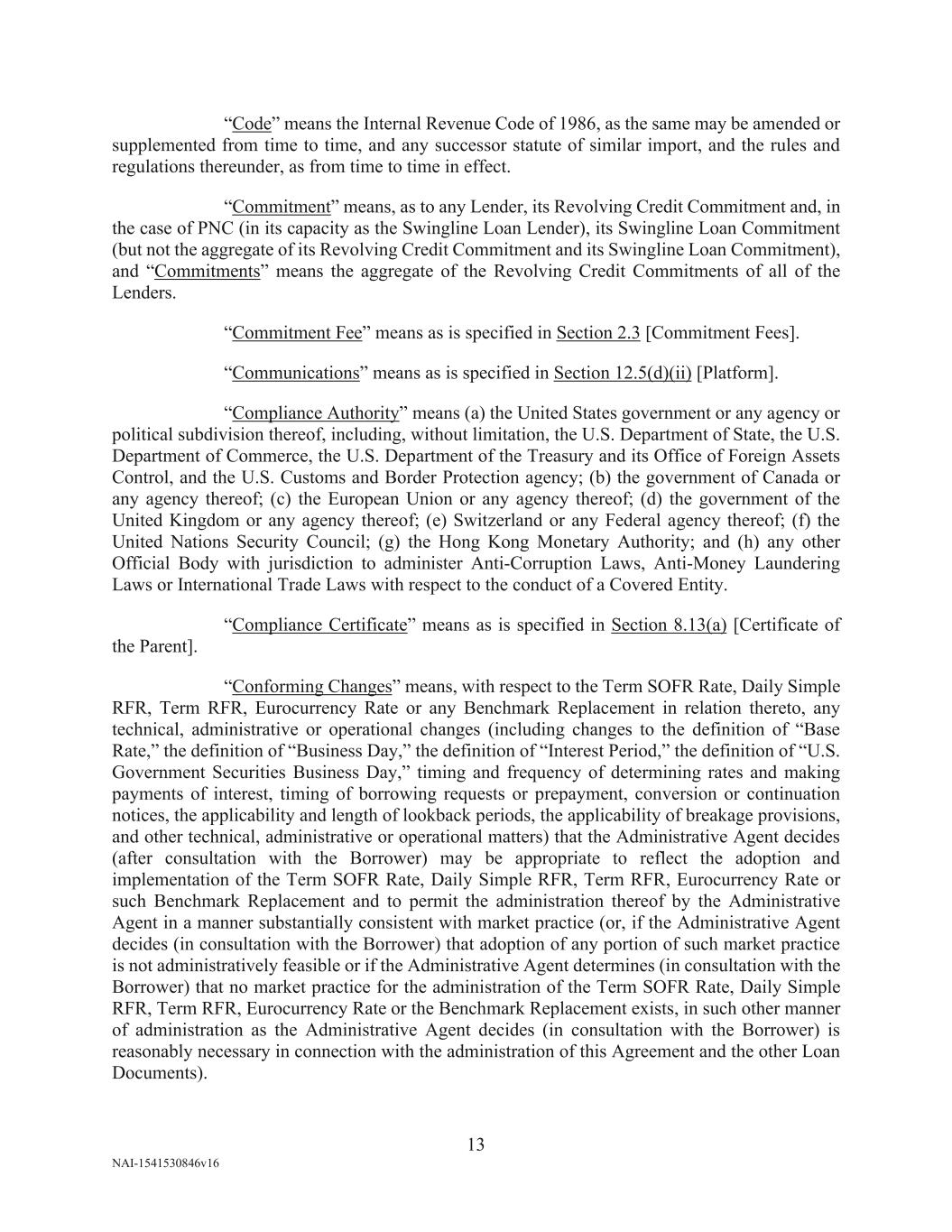 NAI-1541530846v16 13 “Code” means the Internal Revenue Code of 1986, as the same may be amended or supplemented from time to time, and any successor statute of similar import, and the rules and regulations thereunder, as from time to time in effect. “Commitment” means, as to any Lender, its Revolving Credit Commitment and, in the case of PNC (in its capacity as the Swingline Loan Lender), its Swingline Loan Commitment (but not the aggregate of its Revolving Credit Commitment and its Swingline Loan Commitment), and “Commitments” means the aggregate of the Revolving Credit Commitments of all of the Lenders. “Commitment Fee” means as is specified in Section 2.3 [Commitment Fees]. “Communications” means as is specified in Section 12.5(d)(ii) [Platform]. “Compliance Authority” means (a) the United States government or any agency or political subdivision thereof, including, without limitation, the U.S. Department of State, the U.S. Department of Commerce, the U.S. Department of the Treasury and its Office of Foreign Assets Control, and the U.S. Customs and Border Protection agency; (b) the government of Canada or any agency thereof; (c) the European Union or any agency thereof; (d) the government of the United Kingdom or any agency thereof; (e) Switzerland or any Federal agency thereof; (f) the United Nations Security Council; (g) the Hong Kong Monetary Authority; and (h) any other Official Body with jurisdiction to administer Anti-Corruption Laws, Anti-Money Laundering Laws or International Trade Laws with respect to the conduct of a Covered Entity. “Compliance Certificate” means as is specified in Section 8.13(a) [Certificate of the Parent]. “Conforming Changes” means, with respect to the Term SOFR Rate, Daily Simple RFR, Term RFR, Eurocurrency Rate or any Benchmark Replacement in relation thereto, any technical, administrative or operational changes (including changes to the definition of “Base Rate,” the definition of “Business Day,” the definition of “Interest Period,” the definition of “U.S. Government Securities Business Day,” timing and frequency of determining rates and making payments of interest, timing of borrowing requests or prepayment, conversion or continuation notices, the applicability and length of lookback periods, the applicability of breakage provisions, and other technical, administrative or operational matters) that the Administrative Agent decides (after consultation with the Borrower) may be appropriate to reflect the adoption and implementation of the Term SOFR Rate, Daily Simple RFR, Term RFR, Eurocurrency Rate or such Benchmark Replacement and to permit the administration thereof by the Administrative Agent in a manner substantially consistent with market practice (or, if the Administrative Agent decides (in consultation with the Borrower) that adoption of any portion of such market practice is not administratively feasible or if the Administrative Agent determines (in consultation with the Borrower) that no market practice for the administration of the Term SOFR Rate, Daily Simple RFR, Term RFR, Eurocurrency Rate or the Benchmark Replacement exists, in such other manner of administration as the Administrative Agent decides (in consultation with the Borrower) is reasonably necessary in connection with the administration of this Agreement and the other Loan Documents).
