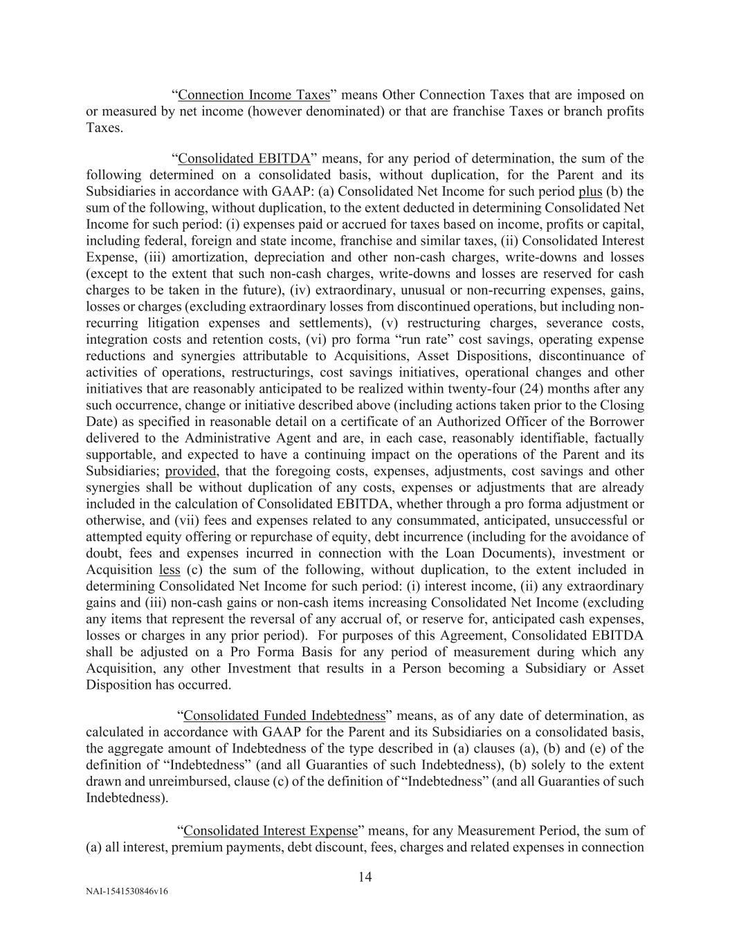 NAI-1541530846v16 14 “Connection Income Taxes” means Other Connection Taxes that are imposed on or measured by net income (however denominated) or that are franchise Taxes or branch profits Taxes. “Consolidated EBITDA” means, for any period of determination, the sum of the following determined on a consolidated basis, without duplication, for the Parent and its Subsidiaries in accordance with GAAP: (a) Consolidated Net Income for such period plus (b) the sum of the following, without duplication, to the extent deducted in determining Consolidated Net Income for such period: (i) expenses paid or accrued for taxes based on income, profits or capital, including federal, foreign and state income, franchise and similar taxes, (ii) Consolidated Interest Expense, (iii) amortization, depreciation and other non-cash charges, write-downs and losses (except to the extent that such non-cash charges, write-downs and losses are reserved for cash charges to be taken in the future), (iv) extraordinary, unusual or non-recurring expenses, gains, losses or charges (excluding extraordinary losses from discontinued operations, but including non- recurring litigation expenses and settlements), (v) restructuring charges, severance costs, integration costs and retention costs, (vi) pro forma “run rate” cost savings, operating expense reductions and synergies attributable to Acquisitions, Asset Dispositions, discontinuance of activities of operations, restructurings, cost savings initiatives, operational changes and other initiatives that are reasonably anticipated to be realized within twenty-four (24) months after any such occurrence, change or initiative described above (including actions taken prior to the Closing Date) as specified in reasonable detail on a certificate of an Authorized Officer of the Borrower delivered to the Administrative Agent and are, in each case, reasonably identifiable, factually supportable, and expected to have a continuing impact on the operations of the Parent and its Subsidiaries; provided, that the foregoing costs, expenses, adjustments, cost savings and other synergies shall be without duplication of any costs, expenses or adjustments that are already included in the calculation of Consolidated EBITDA, whether through a pro forma adjustment or otherwise, and (vii) fees and expenses related to any consummated, anticipated, unsuccessful or attempted equity offering or repurchase of equity, debt incurrence (including for the avoidance of doubt, fees and expenses incurred in connection with the Loan Documents), investment or Acquisition less (c) the sum of the following, without duplication, to the extent included in determining Consolidated Net Income for such period: (i) interest income, (ii) any extraordinary gains and (iii) non-cash gains or non-cash items increasing Consolidated Net Income (excluding any items that represent the reversal of any accrual of, or reserve for, anticipated cash expenses, losses or charges in any prior period). For purposes of this Agreement, Consolidated EBITDA shall be adjusted on a Pro Forma Basis for any period of measurement during which any Acquisition, any other Investment that results in a Person becoming a Subsidiary or Asset Disposition has occurred. “Consolidated Funded Indebtedness” means, as of any date of determination, as calculated in accordance with GAAP for the Parent and its Subsidiaries on a consolidated basis, the aggregate amount of Indebtedness of the type described in (a) clauses (a), (b) and (e) of the definition of “Indebtedness” (and all Guaranties of such Indebtedness), (b) solely to the extent drawn and unreimbursed, clause (c) of the definition of “Indebtedness” (and all Guaranties of such Indebtedness). “Consolidated Interest Expense” means, for any Measurement Period, the sum of (a) all interest, premium payments, debt discount, fees, charges and related expenses in connection