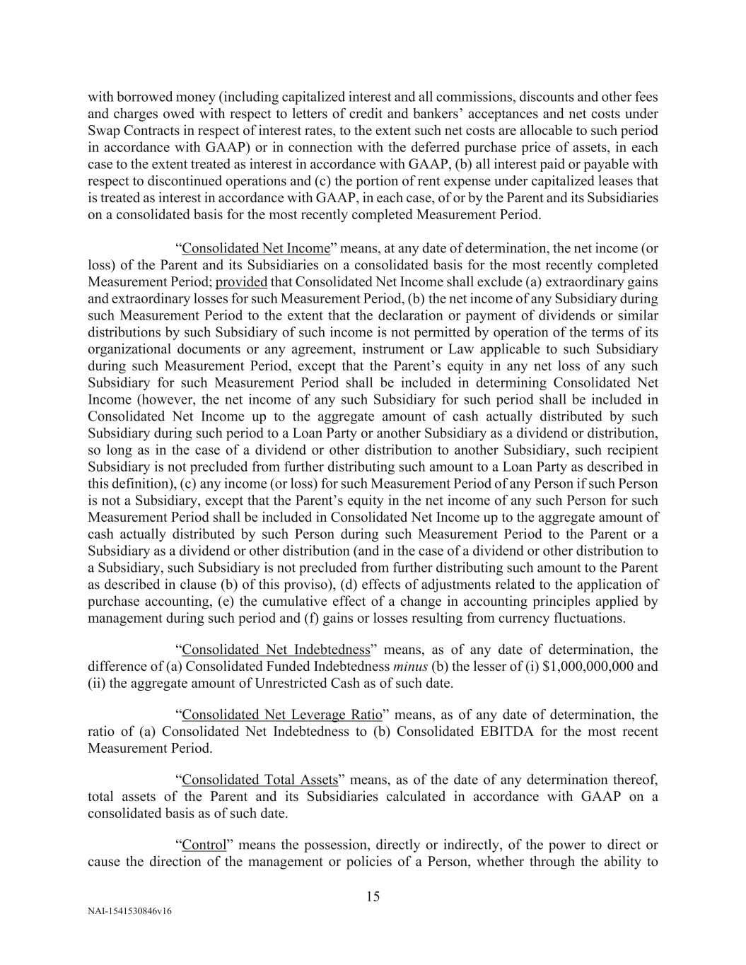 NAI-1541530846v16 15 with borrowed money (including capitalized interest and all commissions, discounts and other fees and charges owed with respect to letters of credit and bankers’ acceptances and net costs under Swap Contracts in respect of interest rates, to the extent such net costs are allocable to such period in accordance with GAAP) or in connection with the deferred purchase price of assets, in each case to the extent treated as interest in accordance with GAAP, (b) all interest paid or payable with respect to discontinued operations and (c) the portion of rent expense under capitalized leases that is treated as interest in accordance with GAAP, in each case, of or by the Parent and its Subsidiaries on a consolidated basis for the most recently completed Measurement Period. “Consolidated Net Income” means, at any date of determination, the net income (or loss) of the Parent and its Subsidiaries on a consolidated basis for the most recently completed Measurement Period; provided that Consolidated Net Income shall exclude (a) extraordinary gains and extraordinary losses for such Measurement Period, (b) the net income of any Subsidiary during such Measurement Period to the extent that the declaration or payment of dividends or similar distributions by such Subsidiary of such income is not permitted by operation of the terms of its organizational documents or any agreement, instrument or Law applicable to such Subsidiary during such Measurement Period, except that the Parent’s equity in any net loss of any such Subsidiary for such Measurement Period shall be included in determining Consolidated Net Income (however, the net income of any such Subsidiary for such period shall be included in Consolidated Net Income up to the aggregate amount of cash actually distributed by such Subsidiary during such period to a Loan Party or another Subsidiary as a dividend or distribution, so long as in the case of a dividend or other distribution to another Subsidiary, such recipient Subsidiary is not precluded from further distributing such amount to a Loan Party as described in this definition), (c) any income (or loss) for such Measurement Period of any Person if such Person is not a Subsidiary, except that the Parent’s equity in the net income of any such Person for such Measurement Period shall be included in Consolidated Net Income up to the aggregate amount of cash actually distributed by such Person during such Measurement Period to the Parent or a Subsidiary as a dividend or other distribution (and in the case of a dividend or other distribution to a Subsidiary, such Subsidiary is not precluded from further distributing such amount to the Parent as described in clause (b) of this proviso), (d) effects of adjustments related to the application of purchase accounting, (e) the cumulative effect of a change in accounting principles applied by management during such period and (f) gains or losses resulting from currency fluctuations. “Consolidated Net Indebtedness” means, as of any date of determination, the difference of (a) Consolidated Funded Indebtedness minus (b) the lesser of (i) $1,000,000,000 and (ii) the aggregate amount of Unrestricted Cash as of such date. “Consolidated Net Leverage Ratio” means, as of any date of determination, the ratio of (a) Consolidated Net Indebtedness to (b) Consolidated EBITDA for the most recent Measurement Period. “Consolidated Total Assets” means, as of the date of any determination thereof, total assets of the Parent and its Subsidiaries calculated in accordance with GAAP on a consolidated basis as of such date. “Control” means the possession, directly or indirectly, of the power to direct or cause the direction of the management or policies of a Person, whether through the ability to