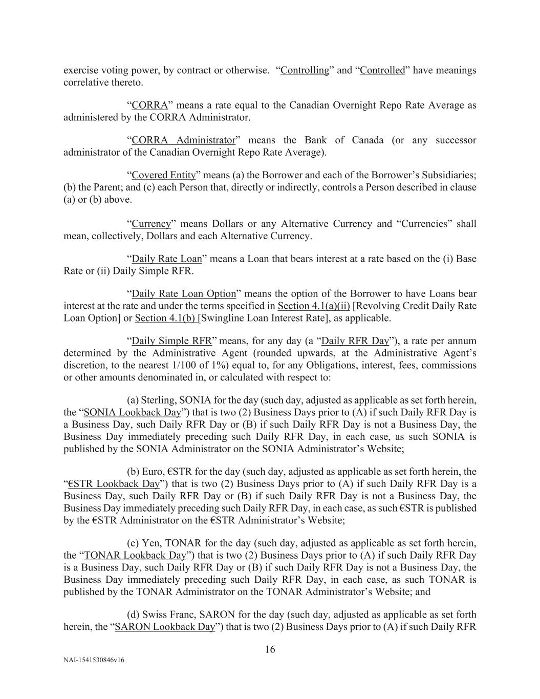 NAI-1541530846v16 16 exercise voting power, by contract or otherwise. “Controlling” and “Controlled” have meanings correlative thereto. “CORRA” means a rate equal to the Canadian Overnight Repo Rate Average as administered by the CORRA Administrator. “CORRA Administrator” means the Bank of Canada (or any successor administrator of the Canadian Overnight Repo Rate Average). “Covered Entity” means (a) the Borrower and each of the Borrower’s Subsidiaries; (b) the Parent; and (c) each Person that, directly or indirectly, controls a Person described in clause (a) or (b) above. “Currency” means Dollars or any Alternative Currency and “Currencies” shall mean, collectively, Dollars and each Alternative Currency. “Daily Rate Loan” means a Loan that bears interest at a rate based on the (i) Base Rate or (ii) Daily Simple RFR. “Daily Rate Loan Option” means the option of the Borrower to have Loans bear interest at the rate and under the terms specified in Section 4.1(a)(ii) [Revolving Credit Daily Rate Loan Option] or Section 4.1(b) [Swingline Loan Interest Rate], as applicable. “Daily Simple RFR” means, for any day (a “Daily RFR Day”), a rate per annum determined by the Administrative Agent (rounded upwards, at the Administrative Agent’s discretion, to the nearest 1/100 of 1%) equal to, for any Obligations, interest, fees, commissions or other amounts denominated in, or calculated with respect to: (a) Sterling, SONIA for the day (such day, adjusted as applicable as set forth herein, the “SONIA Lookback Day”) that is two (2) Business Days prior to (A) if such Daily RFR Day is a Business Day, such Daily RFR Day or (B) if such Daily RFR Day is not a Business Day, the Business Day immediately preceding such Daily RFR Day, in each case, as such SONIA is published by the SONIA Administrator on the SONIA Administrator’s Website; (b) Euro, €STR for the day (such day, adjusted as applicable as set forth herein, the “€STR Lookback Day”) that is two (2) Business Days prior to (A) if such Daily RFR Day is a Business Day, such Daily RFR Day or (B) if such Daily RFR Day is not a Business Day, the Business Day immediately preceding such Daily RFR Day, in each case, as such €STR is published by the €STR Administrator on the €STR Administrator’s Website; (c) Yen, TONAR for the day (such day, adjusted as applicable as set forth herein, the “TONAR Lookback Day”) that is two (2) Business Days prior to (A) if such Daily RFR Day is a Business Day, such Daily RFR Day or (B) if such Daily RFR Day is not a Business Day, the Business Day immediately preceding such Daily RFR Day, in each case, as such TONAR is published by the TONAR Administrator on the TONAR Administrator’s Website; and (d) Swiss Franc, SARON for the day (such day, adjusted as applicable as set forth herein, the “SARON Lookback Day”) that is two (2) Business Days prior to (A) if such Daily RFR