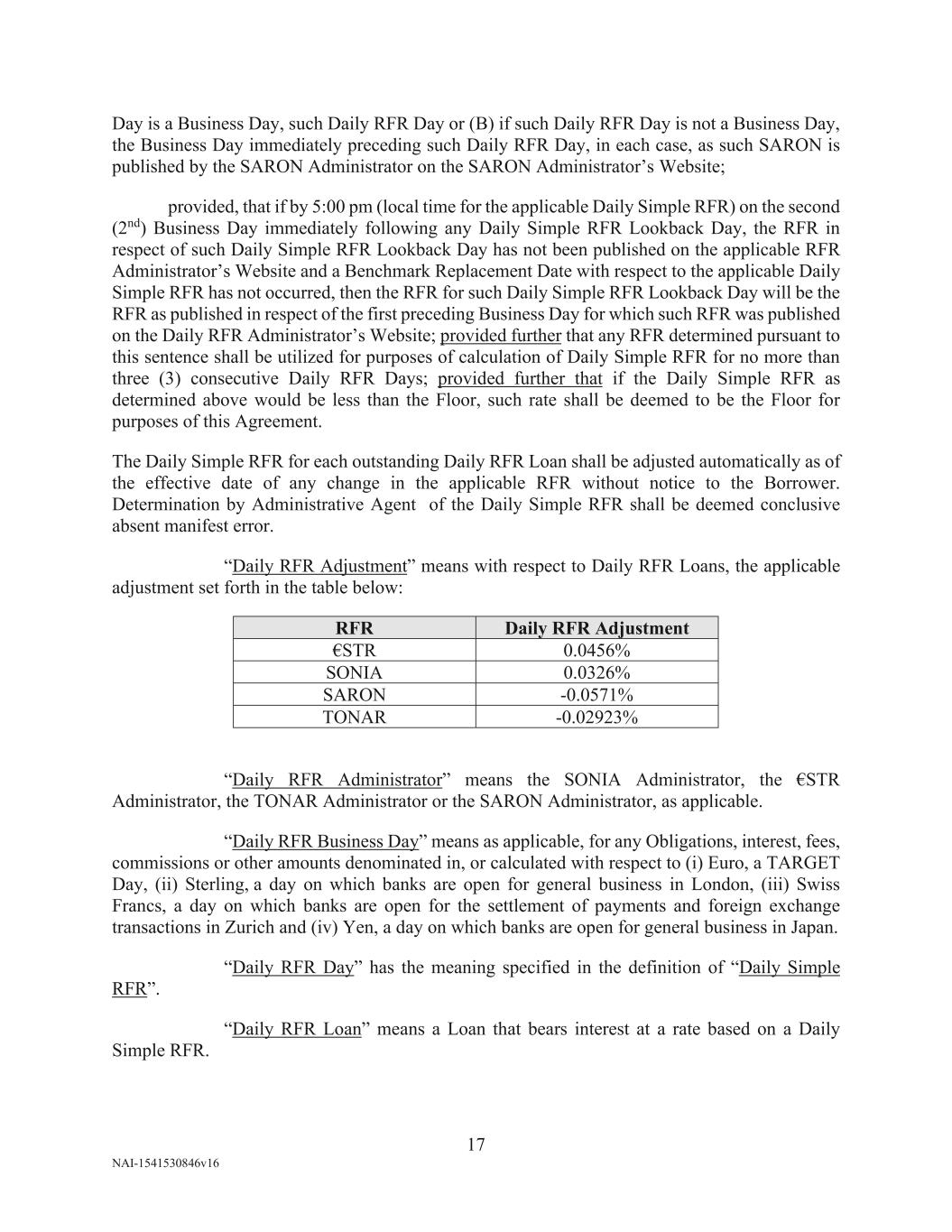 NAI-1541530846v16 17 Day is a Business Day, such Daily RFR Day or (B) if such Daily RFR Day is not a Business Day, the Business Day immediately preceding such Daily RFR Day, in each case, as such SARON is published by the SARON Administrator on the SARON Administrator’s Website; provided, that if by 5:00 pm (local time for the applicable Daily Simple RFR) on the second (2nd) Business Day immediately following any Daily Simple RFR Lookback Day, the RFR in respect of such Daily Simple RFR Lookback Day has not been published on the applicable RFR Administrator’s Website and a Benchmark Replacement Date with respect to the applicable Daily Simple RFR has not occurred, then the RFR for such Daily Simple RFR Lookback Day will be the RFR as published in respect of the first preceding Business Day for which such RFR was published on the Daily RFR Administrator’s Website; provided further that any RFR determined pursuant to this sentence shall be utilized for purposes of calculation of Daily Simple RFR for no more than three (3) consecutive Daily RFR Days; provided further that if the Daily Simple RFR as determined above would be less than the Floor, such rate shall be deemed to be the Floor for purposes of this Agreement. The Daily Simple RFR for each outstanding Daily RFR Loan shall be adjusted automatically as of the effective date of any change in the applicable RFR without notice to the Borrower. Determination by Administrative Agent of the Daily Simple RFR shall be deemed conclusive absent manifest error. “Daily RFR Adjustment” means with respect to Daily RFR Loans, the applicable adjustment set forth in the table below: RFR Daily RFR Adjustment €STR 0.0456% SONIA 0.0326% SARON -0.0571% TONAR -0.02923% “Daily RFR Administrator” means the SONIA Administrator, the €STR Administrator, the TONAR Administrator or the SARON Administrator, as applicable. “Daily RFR Business Day” means as applicable, for any Obligations, interest, fees, commissions or other amounts denominated in, or calculated with respect to (i) Euro, a TARGET Day, (ii) Sterling, a day on which banks are open for general business in London, (iii) Swiss Francs, a day on which banks are open for the settlement of payments and foreign exchange transactions in Zurich and (iv) Yen, a day on which banks are open for general business in Japan. “Daily RFR Day” has the meaning specified in the definition of “Daily Simple RFR”. “Daily RFR Loan” means a Loan that bears interest at a rate based on a Daily Simple RFR.
