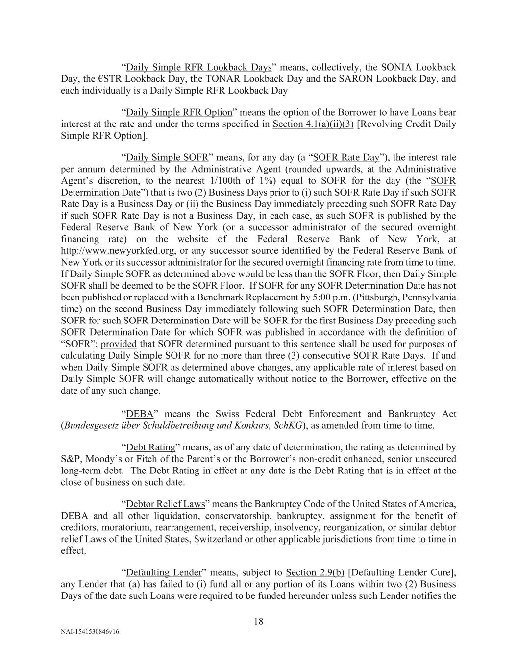 NAI-1541530846v16 18 “Daily Simple RFR Lookback Days” means, collectively, the SONIA Lookback Day, the €STR Lookback Day, the TONAR Lookback Day and the SARON Lookback Day, and each individually is a Daily Simple RFR Lookback Day “Daily Simple RFR Option” means the option of the Borrower to have Loans bear interest at the rate and under the terms specified in Section 4.1(a)(ii)(3) [Revolving Credit Daily Simple RFR Option]. “Daily Simple SOFR” means, for any day (a “SOFR Rate Day”), the interest rate per annum determined by the Administrative Agent (rounded upwards, at the Administrative Agent’s discretion, to the nearest 1/100th of 1%) equal to SOFR for the day (the “SOFR Determination Date”) that is two (2) Business Days prior to (i) such SOFR Rate Day if such SOFR Rate Day is a Business Day or (ii) the Business Day immediately preceding such SOFR Rate Day if such SOFR Rate Day is not a Business Day, in each case, as such SOFR is published by the Federal Reserve Bank of New York (or a successor administrator of the secured overnight financing rate) on the website of the Federal Reserve Bank of New York, at http://www.newyorkfed.org, or any successor source identified by the Federal Reserve Bank of New York or its successor administrator for the secured overnight financing rate from time to time. If Daily Simple SOFR as determined above would be less than the SOFR Floor, then Daily Simple SOFR shall be deemed to be the SOFR Floor. If SOFR for any SOFR Determination Date has not been published or replaced with a Benchmark Replacement by 5:00 p.m. (Pittsburgh, Pennsylvania time) on the second Business Day immediately following such SOFR Determination Date, then SOFR for such SOFR Determination Date will be SOFR for the first Business Day preceding such SOFR Determination Date for which SOFR was published in accordance with the definition of “SOFR”; provided that SOFR determined pursuant to this sentence shall be used for purposes of calculating Daily Simple SOFR for no more than three (3) consecutive SOFR Rate Days. If and when Daily Simple SOFR as determined above changes, any applicable rate of interest based on Daily Simple SOFR will change automatically without notice to the Borrower, effective on the date of any such change. “DEBA” means the Swiss Federal Debt Enforcement and Bankruptcy Act (Bundesgesetz über Schuldbetreibung und Konkurs, SchKG), as amended from time to time. “Debt Rating” means, as of any date of determination, the rating as determined by S&P, Moody’s or Fitch of the Parent’s or the Borrower’s non-credit enhanced, senior unsecured long-term debt. The Debt Rating in effect at any date is the Debt Rating that is in effect at the close of business on such date. “Debtor Relief Laws” means the Bankruptcy Code of the United States of America, DEBA and all other liquidation, conservatorship, bankruptcy, assignment for the benefit of creditors, moratorium, rearrangement, receivership, insolvency, reorganization, or similar debtor relief Laws of the United States, Switzerland or other applicable jurisdictions from time to time in effect. “Defaulting Lender” means, subject to Section 2.9(b) [Defaulting Lender Cure], any Lender that (a) has failed to (i) fund all or any portion of its Loans within two (2) Business Days of the date such Loans were required to be funded hereunder unless such Lender notifies the