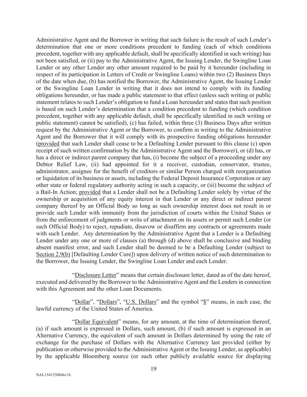NAI-1541530846v16 19 Administrative Agent and the Borrower in writing that such failure is the result of such Lender’s determination that one or more conditions precedent to funding (each of which conditions precedent, together with any applicable default, shall be specifically identified in such writing) has not been satisfied, or (ii) pay to the Administrative Agent, the Issuing Lender, the Swingline Loan Lender or any other Lender any other amount required to be paid by it hereunder (including in respect of its participation in Letters of Credit or Swingline Loans) within two (2) Business Days of the date when due, (b) has notified the Borrower, the Administrative Agent, the Issuing Lender or the Swingline Loan Lender in writing that it does not intend to comply with its funding obligations hereunder, or has made a public statement to that effect (unless such writing or public statement relates to such Lender’s obligation to fund a Loan hereunder and states that such position is based on such Lender’s determination that a condition precedent to funding (which condition precedent, together with any applicable default, shall be specifically identified in such writing or public statement) cannot be satisfied), (c) has failed, within three (3) Business Days after written request by the Administrative Agent or the Borrower, to confirm in writing to the Administrative Agent and the Borrower that it will comply with its prospective funding obligations hereunder (provided that such Lender shall cease to be a Defaulting Lender pursuant to this clause (c) upon receipt of such written confirmation by the Administrative Agent and the Borrower), or (d) has, or has a direct or indirect parent company that has, (i) become the subject of a proceeding under any Debtor Relief Law, (ii) had appointed for it a receiver, custodian, conservator, trustee, administrator, assignee for the benefit of creditors or similar Person charged with reorganization or liquidation of its business or assets, including the Federal Deposit Insurance Corporation or any other state or federal regulatory authority acting in such a capacity, or (iii) become the subject of a Bail-In Action; provided that a Lender shall not be a Defaulting Lender solely by virtue of the ownership or acquisition of any equity interest in that Lender or any direct or indirect parent company thereof by an Official Body so long as such ownership interest does not result in or provide such Lender with immunity from the jurisdiction of courts within the United States or from the enforcement of judgments or writs of attachment on its assets or permit such Lender (or such Official Body) to reject, repudiate, disavow or disaffirm any contracts or agreements made with such Lender. Any determination by the Administrative Agent that a Lender is a Defaulting Lender under any one or more of clauses (a) through (d) above shall be conclusive and binding absent manifest error, and such Lender shall be deemed to be a Defaulting Lender (subject to Section 2.9(b) [Defaulting Lender Cure]) upon delivery of written notice of such determination to the Borrower, the Issuing Lender, the Swingline Loan Lender and each Lender. “Disclosure Letter” means that certain disclosure letter, dated as of the date hereof, executed and delivered by the Borrower to the Administrative Agent and the Lenders in connection with this Agreement and the other Loan Documents. “Dollar”, “Dollars”, “U.S. Dollars” and the symbol “$” means, in each case, the lawful currency of the United States of America. “Dollar Equivalent” means, for any amount, at the time of determination thereof, (a) if such amount is expressed in Dollars, such amount, (b) if such amount is expressed in an Alternative Currency, the equivalent of such amount in Dollars determined by using the rate of exchange for the purchase of Dollars with the Alternative Currency last provided (either by publication or otherwise provided to the Administrative Agent or the Issuing Lender, as applicable) by the applicable Bloomberg source (or such other publicly available source for displaying