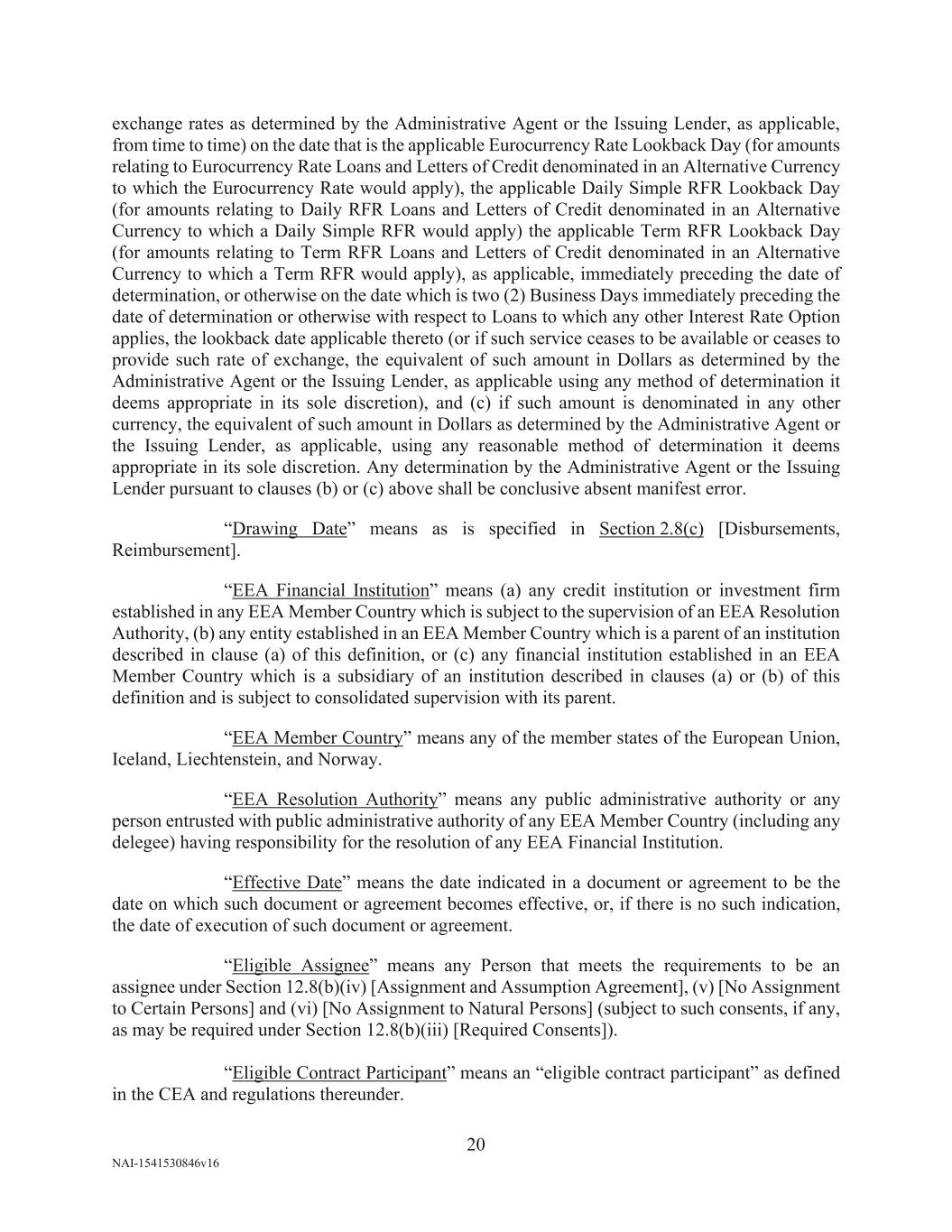 NAI-1541530846v16 20 exchange rates as determined by the Administrative Agent or the Issuing Lender, as applicable, from time to time) on the date that is the applicable Eurocurrency Rate Lookback Day (for amounts relating to Eurocurrency Rate Loans and Letters of Credit denominated in an Alternative Currency to which the Eurocurrency Rate would apply), the applicable Daily Simple RFR Lookback Day (for amounts relating to Daily RFR Loans and Letters of Credit denominated in an Alternative Currency to which a Daily Simple RFR would apply) the applicable Term RFR Lookback Day (for amounts relating to Term RFR Loans and Letters of Credit denominated in an Alternative Currency to which a Term RFR would apply), as applicable, immediately preceding the date of determination, or otherwise on the date which is two (2) Business Days immediately preceding the date of determination or otherwise with respect to Loans to which any other Interest Rate Option applies, the lookback date applicable thereto (or if such service ceases to be available or ceases to provide such rate of exchange, the equivalent of such amount in Dollars as determined by the Administrative Agent or the Issuing Lender, as applicable using any method of determination it deems appropriate in its sole discretion), and (c) if such amount is denominated in any other currency, the equivalent of such amount in Dollars as determined by the Administrative Agent or the Issuing Lender, as applicable, using any reasonable method of determination it deems appropriate in its sole discretion. Any determination by the Administrative Agent or the Issuing Lender pursuant to clauses (b) or (c) above shall be conclusive absent manifest error. “Drawing Date” means as is specified in Section 2.8(c) [Disbursements, Reimbursement]. “EEA Financial Institution” means (a) any credit institution or investment firm established in any EEA Member Country which is subject to the supervision of an EEA Resolution Authority, (b) any entity established in an EEA Member Country which is a parent of an institution described in clause (a) of this definition, or (c) any financial institution established in an EEA Member Country which is a subsidiary of an institution described in clauses (a) or (b) of this definition and is subject to consolidated supervision with its parent. “EEA Member Country” means any of the member states of the European Union, Iceland, Liechtenstein, and Norway. “EEA Resolution Authority” means any public administrative authority or any person entrusted with public administrative authority of any EEA Member Country (including any delegee) having responsibility for the resolution of any EEA Financial Institution. “Effective Date” means the date indicated in a document or agreement to be the date on which such document or agreement becomes effective, or, if there is no such indication, the date of execution of such document or agreement. “Eligible Assignee” means any Person that meets the requirements to be an assignee under Section 12.8(b)(iv) [Assignment and Assumption Agreement], (v) [No Assignment to Certain Persons] and (vi) [No Assignment to Natural Persons] (subject to such consents, if any, as may be required under Section 12.8(b)(iii) [Required Consents]). “Eligible Contract Participant” means an “eligible contract participant” as defined in the CEA and regulations thereunder.