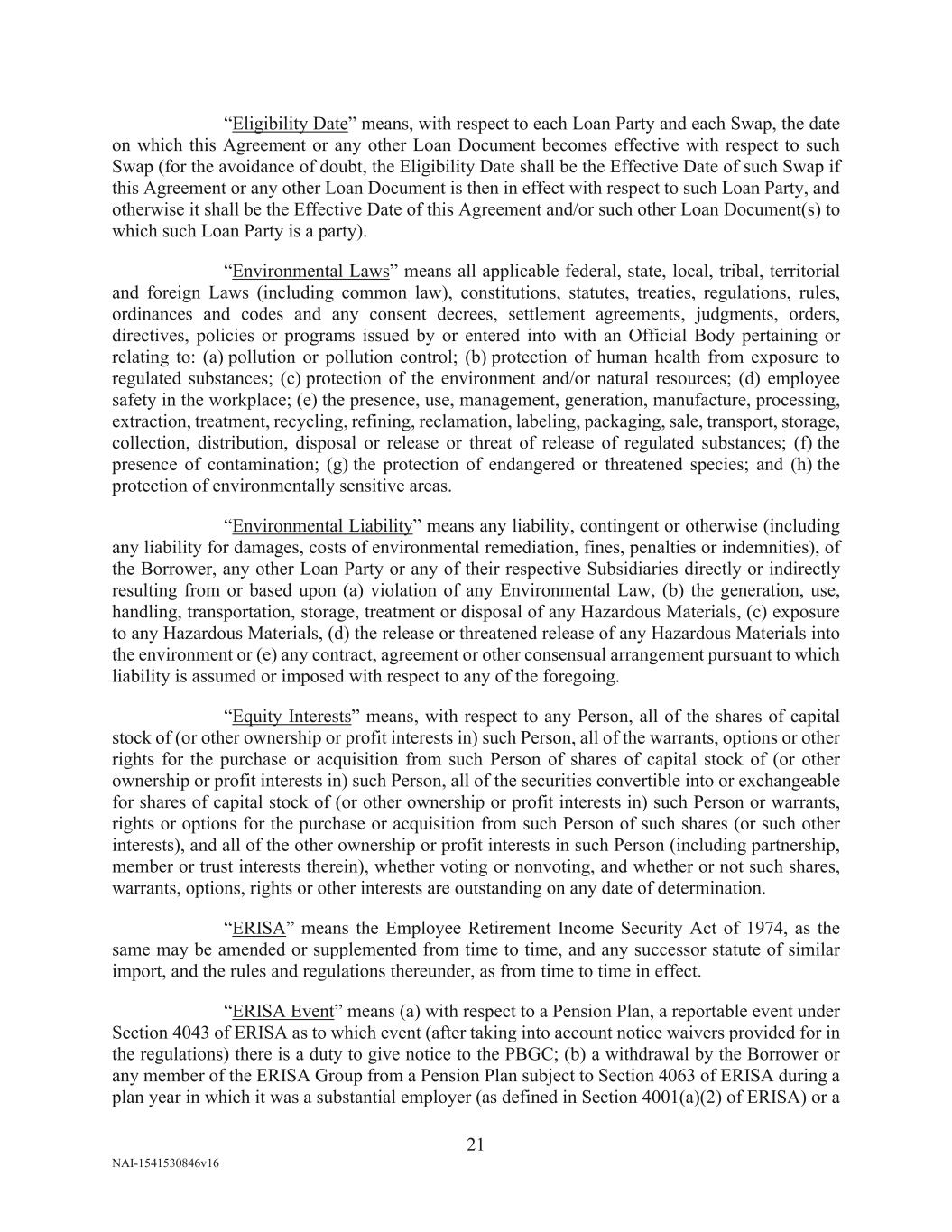NAI-1541530846v16 21 “Eligibility Date” means, with respect to each Loan Party and each Swap, the date on which this Agreement or any other Loan Document becomes effective with respect to such Swap (for the avoidance of doubt, the Eligibility Date shall be the Effective Date of such Swap if this Agreement or any other Loan Document is then in effect with respect to such Loan Party, and otherwise it shall be the Effective Date of this Agreement and/or such other Loan Document(s) to which such Loan Party is a party). “Environmental Laws” means all applicable federal, state, local, tribal, territorial and foreign Laws (including common law), constitutions, statutes, treaties, regulations, rules, ordinances and codes and any consent decrees, settlement agreements, judgments, orders, directives, policies or programs issued by or entered into with an Official Body pertaining or relating to: (a) pollution or pollution control; (b) protection of human health from exposure to regulated substances; (c) protection of the environment and/or natural resources; (d) employee safety in the workplace; (e) the presence, use, management, generation, manufacture, processing, extraction, treatment, recycling, refining, reclamation, labeling, packaging, sale, transport, storage, collection, distribution, disposal or release or threat of release of regulated substances; (f) the presence of contamination; (g) the protection of endangered or threatened species; and (h) the protection of environmentally sensitive areas. “Environmental Liability” means any liability, contingent or otherwise (including any liability for damages, costs of environmental remediation, fines, penalties or indemnities), of the Borrower, any other Loan Party or any of their respective Subsidiaries directly or indirectly resulting from or based upon (a) violation of any Environmental Law, (b) the generation, use, handling, transportation, storage, treatment or disposal of any Hazardous Materials, (c) exposure to any Hazardous Materials, (d) the release or threatened release of any Hazardous Materials into the environment or (e) any contract, agreement or other consensual arrangement pursuant to which liability is assumed or imposed with respect to any of the foregoing. “Equity Interests” means, with respect to any Person, all of the shares of capital stock of (or other ownership or profit interests in) such Person, all of the warrants, options or other rights for the purchase or acquisition from such Person of shares of capital stock of (or other ownership or profit interests in) such Person, all of the securities convertible into or exchangeable for shares of capital stock of (or other ownership or profit interests in) such Person or warrants, rights or options for the purchase or acquisition from such Person of such shares (or such other interests), and all of the other ownership or profit interests in such Person (including partnership, member or trust interests therein), whether voting or nonvoting, and whether or not such shares, warrants, options, rights or other interests are outstanding on any date of determination. “ERISA” means the Employee Retirement Income Security Act of 1974, as the same may be amended or supplemented from time to time, and any successor statute of similar import, and the rules and regulations thereunder, as from time to time in effect. “ERISA Event” means (a) with respect to a Pension Plan, a reportable event under Section 4043 of ERISA as to which event (after taking into account notice waivers provided for in the regulations) there is a duty to give notice to the PBGC; (b) a withdrawal by the Borrower or any member of the ERISA Group from a Pension Plan subject to Section 4063 of ERISA during a plan year in which it was a substantial employer (as defined in Section 4001(a)(2) of ERISA) or a