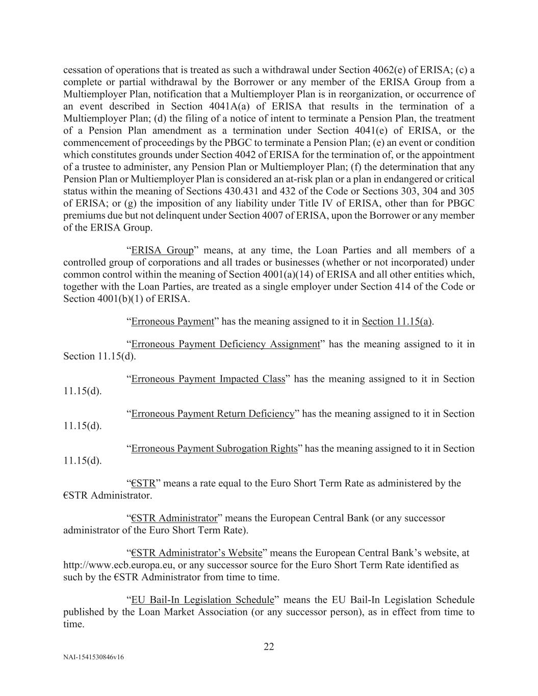 NAI-1541530846v16 22 cessation of operations that is treated as such a withdrawal under Section 4062(e) of ERISA; (c) a complete or partial withdrawal by the Borrower or any member of the ERISA Group from a Multiemployer Plan, notification that a Multiemployer Plan is in reorganization, or occurrence of an event described in Section 4041A(a) of ERISA that results in the termination of a Multiemployer Plan; (d) the filing of a notice of intent to terminate a Pension Plan, the treatment of a Pension Plan amendment as a termination under Section 4041(e) of ERISA, or the commencement of proceedings by the PBGC to terminate a Pension Plan; (e) an event or condition which constitutes grounds under Section 4042 of ERISA for the termination of, or the appointment of a trustee to administer, any Pension Plan or Multiemployer Plan; (f) the determination that any Pension Plan or Multiemployer Plan is considered an at-risk plan or a plan in endangered or critical status within the meaning of Sections 430.431 and 432 of the Code or Sections 303, 304 and 305 of ERISA; or (g) the imposition of any liability under Title IV of ERISA, other than for PBGC premiums due but not delinquent under Section 4007 of ERISA, upon the Borrower or any member of the ERISA Group. “ERISA Group” means, at any time, the Loan Parties and all members of a controlled group of corporations and all trades or businesses (whether or not incorporated) under common control within the meaning of Section 4001(a)(14) of ERISA and all other entities which, together with the Loan Parties, are treated as a single employer under Section 414 of the Code or Section 4001(b)(1) of ERISA. “Erroneous Payment” has the meaning assigned to it in Section 11.15(a). “Erroneous Payment Deficiency Assignment” has the meaning assigned to it in Section 11.15(d). “Erroneous Payment Impacted Class” has the meaning assigned to it in Section 11.15(d). “Erroneous Payment Return Deficiency” has the meaning assigned to it in Section 11.15(d). “Erroneous Payment Subrogation Rights” has the meaning assigned to it in Section 11.15(d). “€STR” means a rate equal to the Euro Short Term Rate as administered by the €STR Administrator. “€STR Administrator” means the European Central Bank (or any successor administrator of the Euro Short Term Rate). “€STR Administrator’s Website” means the European Central Bank’s website, at http://www.ecb.europa.eu, or any successor source for the Euro Short Term Rate identified as such by the €STR Administrator from time to time. “EU Bail-In Legislation Schedule” means the EU Bail-In Legislation Schedule published by the Loan Market Association (or any successor person), as in effect from time to time.