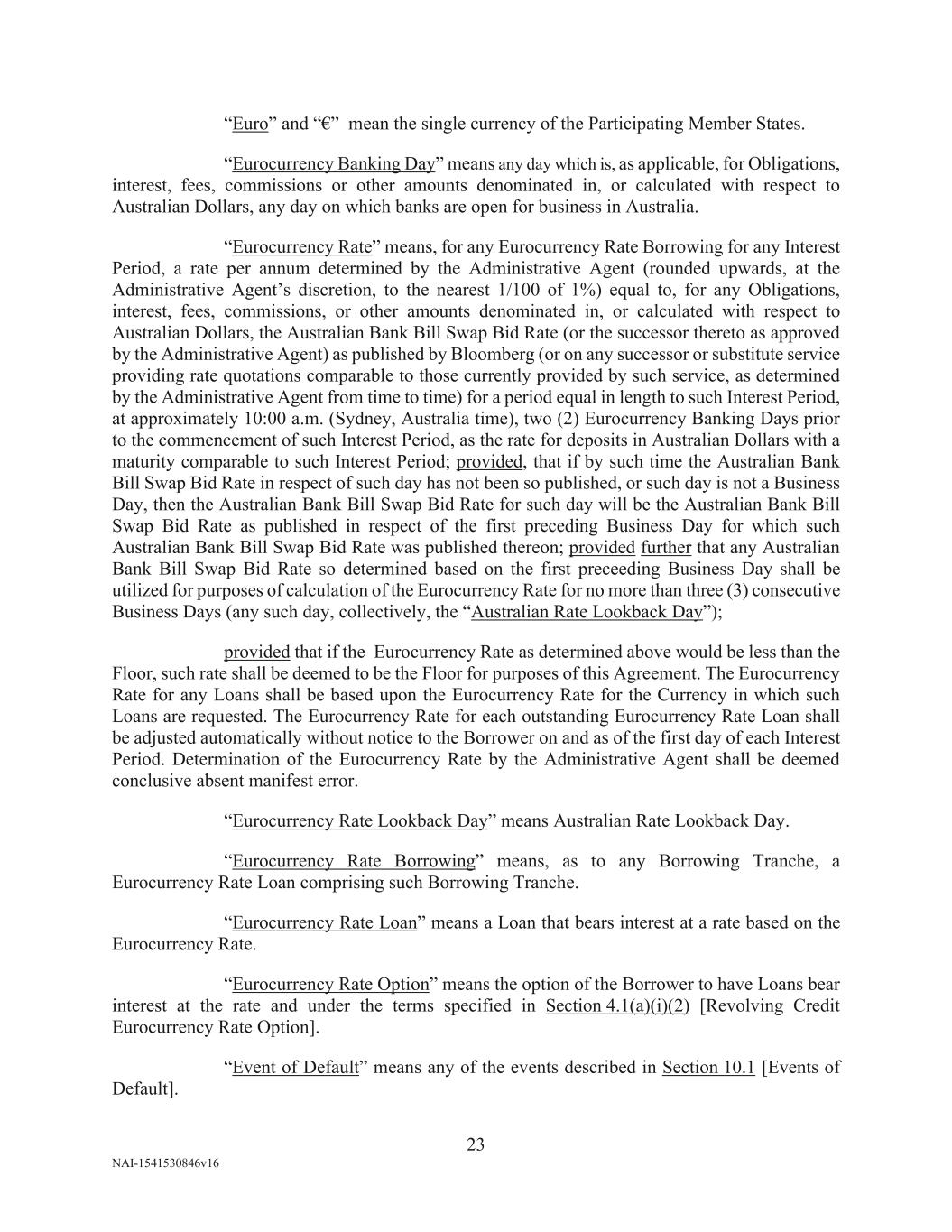 NAI-1541530846v16 23 “Euro” and “€” mean the single currency of the Participating Member States. “Eurocurrency Banking Day” means any day which is, as applicable, for Obligations, interest, fees, commissions or other amounts denominated in, or calculated with respect to Australian Dollars, any day on which banks are open for business in Australia. “Eurocurrency Rate” means, for any Eurocurrency Rate Borrowing for any Interest Period, a rate per annum determined by the Administrative Agent (rounded upwards, at the Administrative Agent’s discretion, to the nearest 1/100 of 1%) equal to, for any Obligations, interest, fees, commissions, or other amounts denominated in, or calculated with respect to Australian Dollars, the Australian Bank Bill Swap Bid Rate (or the successor thereto as approved by the Administrative Agent) as published by Bloomberg (or on any successor or substitute service providing rate quotations comparable to those currently provided by such service, as determined by the Administrative Agent from time to time) for a period equal in length to such Interest Period, at approximately 10:00 a.m. (Sydney, Australia time), two (2) Eurocurrency Banking Days prior to the commencement of such Interest Period, as the rate for deposits in Australian Dollars with a maturity comparable to such Interest Period; provided, that if by such time the Australian Bank Bill Swap Bid Rate in respect of such day has not been so published, or such day is not a Business Day, then the Australian Bank Bill Swap Bid Rate for such day will be the Australian Bank Bill Swap Bid Rate as published in respect of the first preceding Business Day for which such Australian Bank Bill Swap Bid Rate was published thereon; provided further that any Australian Bank Bill Swap Bid Rate so determined based on the first preceeding Business Day shall be utilized for purposes of calculation of the Eurocurrency Rate for no more than three (3) consecutive Business Days (any such day, collectively, the “Australian Rate Lookback Day”); provided that if the Eurocurrency Rate as determined above would be less than the Floor, such rate shall be deemed to be the Floor for purposes of this Agreement. The Eurocurrency Rate for any Loans shall be based upon the Eurocurrency Rate for the Currency in which such Loans are requested. The Eurocurrency Rate for each outstanding Eurocurrency Rate Loan shall be adjusted automatically without notice to the Borrower on and as of the first day of each Interest Period. Determination of the Eurocurrency Rate by the Administrative Agent shall be deemed conclusive absent manifest error. “Eurocurrency Rate Lookback Day” means Australian Rate Lookback Day. “Eurocurrency Rate Borrowing” means, as to any Borrowing Tranche, a Eurocurrency Rate Loan comprising such Borrowing Tranche. “Eurocurrency Rate Loan” means a Loan that bears interest at a rate based on the Eurocurrency Rate. “Eurocurrency Rate Option” means the option of the Borrower to have Loans bear interest at the rate and under the terms specified in Section 4.1(a)(i)(2) [Revolving Credit Eurocurrency Rate Option]. “Event of Default” means any of the events described in Section 10.1 [Events of Default].
