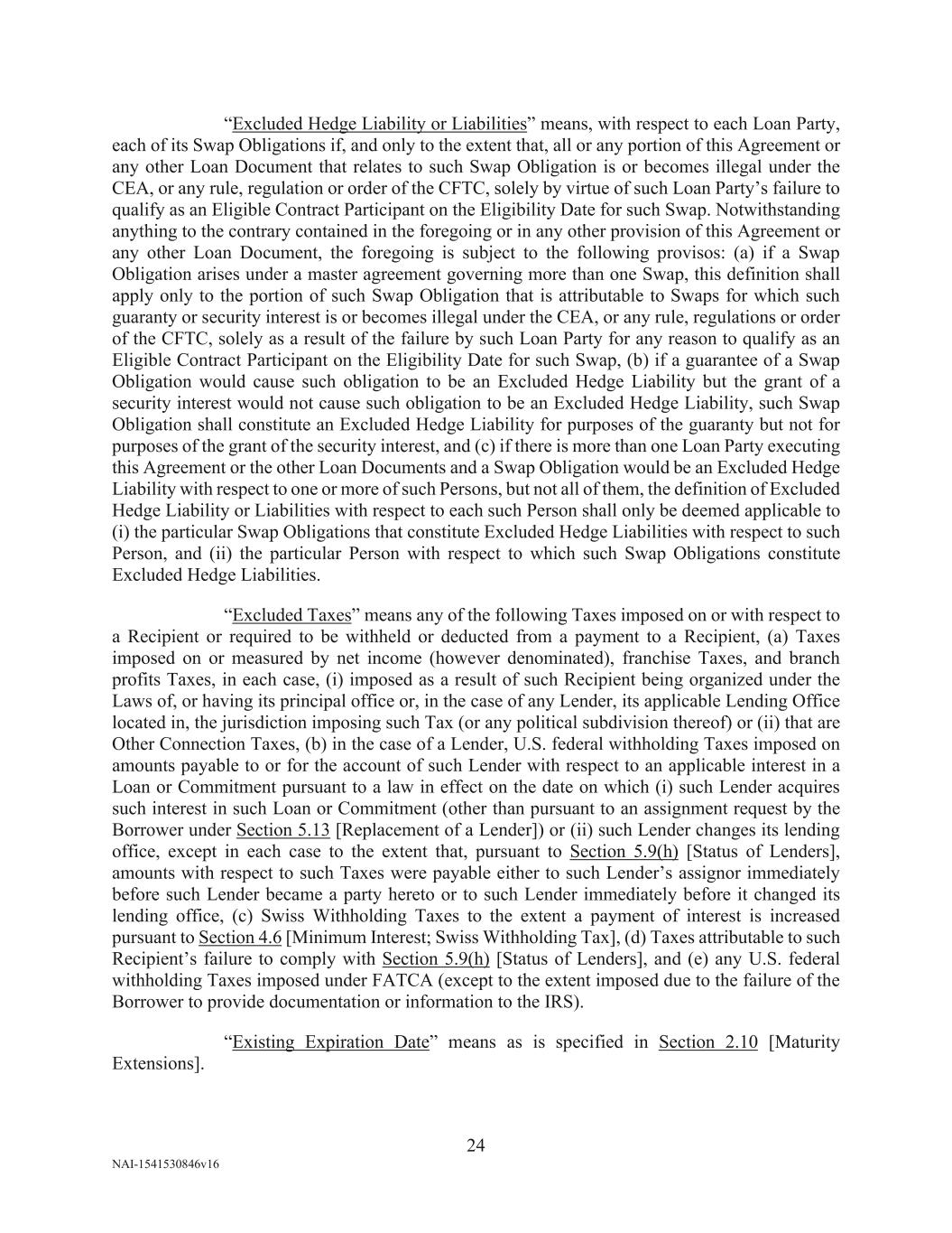 NAI-1541530846v16 24 “Excluded Hedge Liability or Liabilities” means, with respect to each Loan Party, each of its Swap Obligations if, and only to the extent that, all or any portion of this Agreement or any other Loan Document that relates to such Swap Obligation is or becomes illegal under the CEA, or any rule, regulation or order of the CFTC, solely by virtue of such Loan Party’s failure to qualify as an Eligible Contract Participant on the Eligibility Date for such Swap. Notwithstanding anything to the contrary contained in the foregoing or in any other provision of this Agreement or any other Loan Document, the foregoing is subject to the following provisos: (a) if a Swap Obligation arises under a master agreement governing more than one Swap, this definition shall apply only to the portion of such Swap Obligation that is attributable to Swaps for which such guaranty or security interest is or becomes illegal under the CEA, or any rule, regulations or order of the CFTC, solely as a result of the failure by such Loan Party for any reason to qualify as an Eligible Contract Participant on the Eligibility Date for such Swap, (b) if a guarantee of a Swap Obligation would cause such obligation to be an Excluded Hedge Liability but the grant of a security interest would not cause such obligation to be an Excluded Hedge Liability, such Swap Obligation shall constitute an Excluded Hedge Liability for purposes of the guaranty but not for purposes of the grant of the security interest, and (c) if there is more than one Loan Party executing this Agreement or the other Loan Documents and a Swap Obligation would be an Excluded Hedge Liability with respect to one or more of such Persons, but not all of them, the definition of Excluded Hedge Liability or Liabilities with respect to each such Person shall only be deemed applicable to (i) the particular Swap Obligations that constitute Excluded Hedge Liabilities with respect to such Person, and (ii) the particular Person with respect to which such Swap Obligations constitute Excluded Hedge Liabilities. “Excluded Taxes” means any of the following Taxes imposed on or with respect to a Recipient or required to be withheld or deducted from a payment to a Recipient, (a) Taxes imposed on or measured by net income (however denominated), franchise Taxes, and branch profits Taxes, in each case, (i) imposed as a result of such Recipient being organized under the Laws of, or having its principal office or, in the case of any Lender, its applicable Lending Office located in, the jurisdiction imposing such Tax (or any political subdivision thereof) or (ii) that are Other Connection Taxes, (b) in the case of a Lender, U.S. federal withholding Taxes imposed on amounts payable to or for the account of such Lender with respect to an applicable interest in a Loan or Commitment pursuant to a law in effect on the date on which (i) such Lender acquires such interest in such Loan or Commitment (other than pursuant to an assignment request by the Borrower under Section 5.13 [Replacement of a Lender]) or (ii) such Lender changes its lending office, except in each case to the extent that, pursuant to Section 5.9(h) [Status of Lenders], amounts with respect to such Taxes were payable either to such Lender’s assignor immediately before such Lender became a party hereto or to such Lender immediately before it changed its lending office, (c) Swiss Withholding Taxes to the extent a payment of interest is increased pursuant to Section 4.6 [Minimum Interest; Swiss Withholding Tax], (d) Taxes attributable to such Recipient’s failure to comply with Section 5.9(h) [Status of Lenders], and (e) any U.S. federal withholding Taxes imposed under FATCA (except to the extent imposed due to the failure of the Borrower to provide documentation or information to the IRS). “Existing Expiration Date” means as is specified in Section 2.10 [Maturity Extensions].