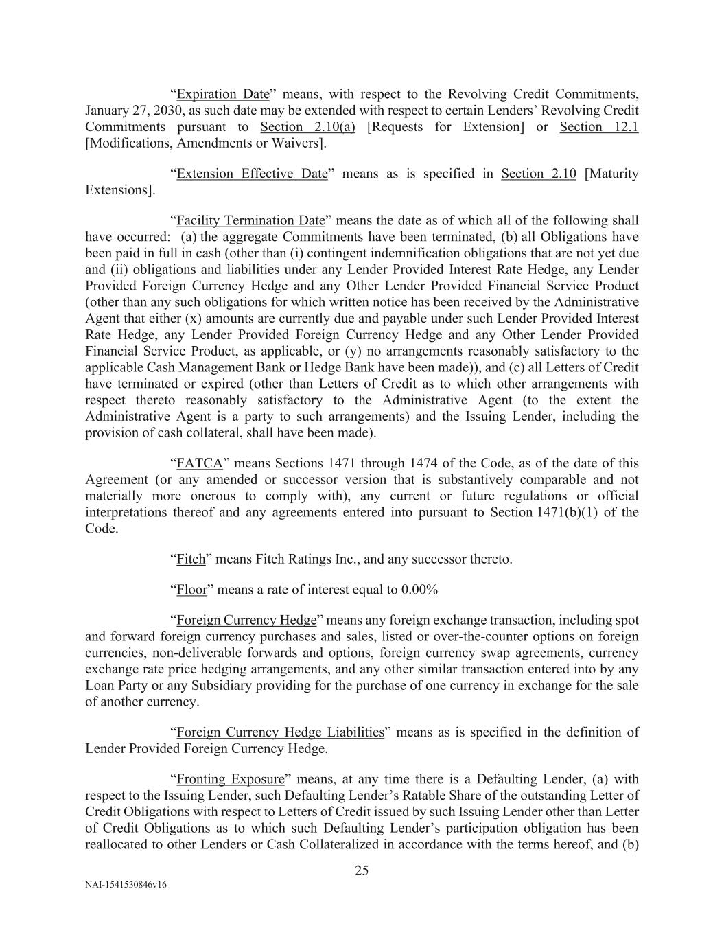 NAI-1541530846v16 25 “Expiration Date” means, with respect to the Revolving Credit Commitments, January 27, 2030, as such date may be extended with respect to certain Lenders’ Revolving Credit Commitments pursuant to Section 2.10(a) [Requests for Extension] or Section 12.1 [Modifications, Amendments or Waivers]. “Extension Effective Date” means as is specified in Section 2.10 [Maturity Extensions]. “Facility Termination Date” means the date as of which all of the following shall have occurred: (a) the aggregate Commitments have been terminated, (b) all Obligations have been paid in full in cash (other than (i) contingent indemnification obligations that are not yet due and (ii) obligations and liabilities under any Lender Provided Interest Rate Hedge, any Lender Provided Foreign Currency Hedge and any Other Lender Provided Financial Service Product (other than any such obligations for which written notice has been received by the Administrative Agent that either (x) amounts are currently due and payable under such Lender Provided Interest Rate Hedge, any Lender Provided Foreign Currency Hedge and any Other Lender Provided Financial Service Product, as applicable, or (y) no arrangements reasonably satisfactory to the applicable Cash Management Bank or Hedge Bank have been made)), and (c) all Letters of Credit have terminated or expired (other than Letters of Credit as to which other arrangements with respect thereto reasonably satisfactory to the Administrative Agent (to the extent the Administrative Agent is a party to such arrangements) and the Issuing Lender, including the provision of cash collateral, shall have been made). “FATCA” means Sections 1471 through 1474 of the Code, as of the date of this Agreement (or any amended or successor version that is substantively comparable and not materially more onerous to comply with), any current or future regulations or official interpretations thereof and any agreements entered into pursuant to Section 1471(b)(1) of the Code. “Fitch” means Fitch Ratings Inc., and any successor thereto. “Floor” means a rate of interest equal to 0.00% “Foreign Currency Hedge” means any foreign exchange transaction, including spot and forward foreign currency purchases and sales, listed or over-the-counter options on foreign currencies, non-deliverable forwards and options, foreign currency swap agreements, currency exchange rate price hedging arrangements, and any other similar transaction entered into by any Loan Party or any Subsidiary providing for the purchase of one currency in exchange for the sale of another currency. “Foreign Currency Hedge Liabilities” means as is specified in the definition of Lender Provided Foreign Currency Hedge. “Fronting Exposure” means, at any time there is a Defaulting Lender, (a) with respect to the Issuing Lender, such Defaulting Lender’s Ratable Share of the outstanding Letter of Credit Obligations with respect to Letters of Credit issued by such Issuing Lender other than Letter of Credit Obligations as to which such Defaulting Lender’s participation obligation has been reallocated to other Lenders or Cash Collateralized in accordance with the terms hereof, and (b)