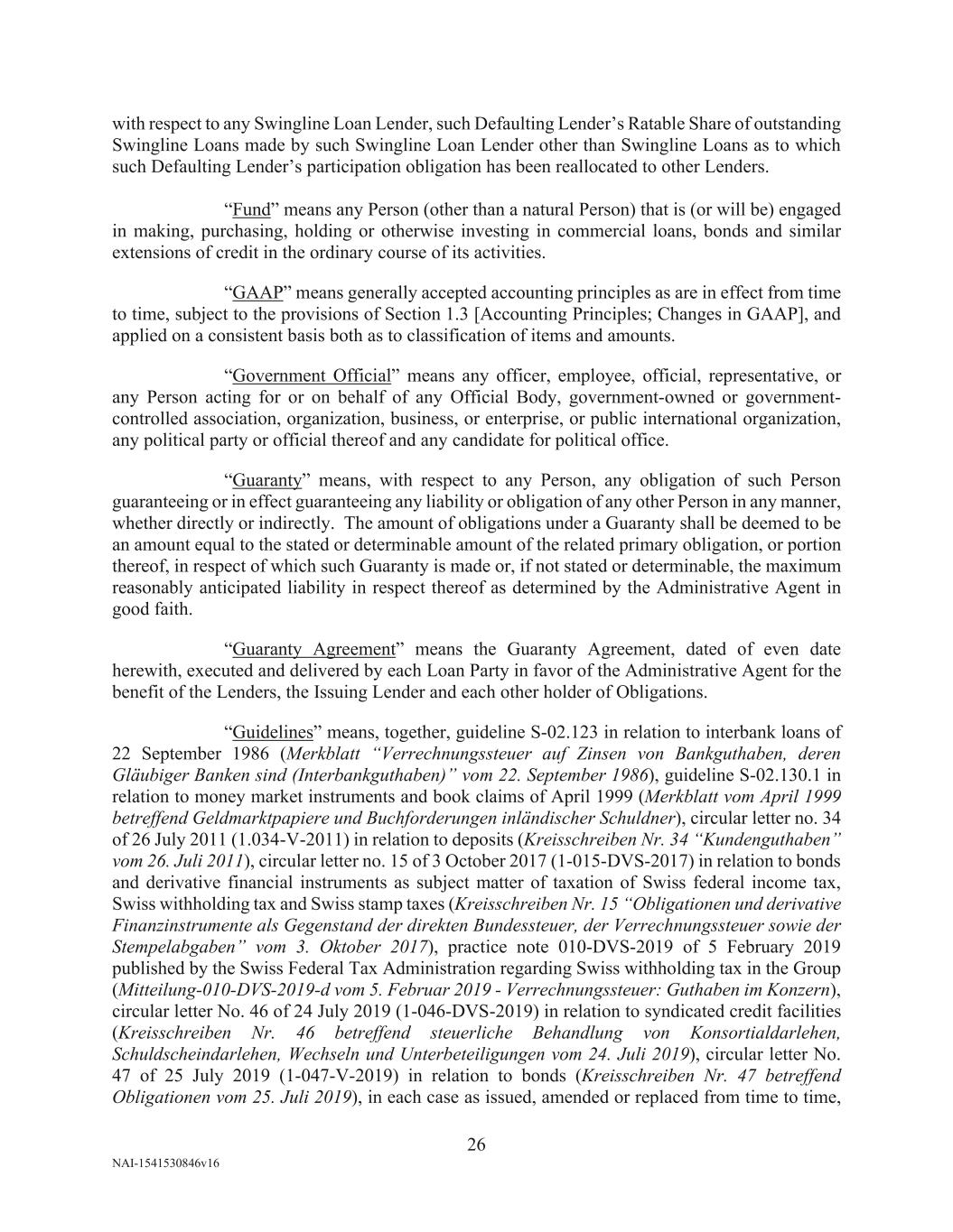 NAI-1541530846v16 26 with respect to any Swingline Loan Lender, such Defaulting Lender’s Ratable Share of outstanding Swingline Loans made by such Swingline Loan Lender other than Swingline Loans as to which such Defaulting Lender’s participation obligation has been reallocated to other Lenders. “Fund” means any Person (other than a natural Person) that is (or will be) engaged in making, purchasing, holding or otherwise investing in commercial loans, bonds and similar extensions of credit in the ordinary course of its activities. “GAAP” means generally accepted accounting principles as are in effect from time to time, subject to the provisions of Section 1.3 [Accounting Principles; Changes in GAAP], and applied on a consistent basis both as to classification of items and amounts. “Government Official” means any officer, employee, official, representative, or any Person acting for or on behalf of any Official Body, government-owned or government- controlled association, organization, business, or enterprise, or public international organization, any political party or official thereof and any candidate for political office. “Guaranty” means, with respect to any Person, any obligation of such Person guaranteeing or in effect guaranteeing any liability or obligation of any other Person in any manner, whether directly or indirectly. The amount of obligations under a Guaranty shall be deemed to be an amount equal to the stated or determinable amount of the related primary obligation, or portion thereof, in respect of which such Guaranty is made or, if not stated or determinable, the maximum reasonably anticipated liability in respect thereof as determined by the Administrative Agent in good faith. “Guaranty Agreement” means the Guaranty Agreement, dated of even date herewith, executed and delivered by each Loan Party in favor of the Administrative Agent for the benefit of the Lenders, the Issuing Lender and each other holder of Obligations. “Guidelines” means, together, guideline S-02.123 in relation to interbank loans of 22 September 1986 (Merkblatt “Verrechnungssteuer auf Zinsen von Bankguthaben, deren Gläubiger Banken sind (Interbankguthaben)” vom 22. September 1986), guideline S-02.130.1 in relation to money market instruments and book claims of April 1999 (Merkblatt vom April 1999 betreffend Geldmarktpapiere und Buchforderungen inländischer Schuldner), circular letter no. 34 of 26 July 2011 (1.034-V-2011) in relation to deposits (Kreisschreiben Nr. 34 “Kundenguthaben” vom 26. Juli 2011), circular letter no. 15 of 3 October 2017 (1-015-DVS-2017) in relation to bonds and derivative financial instruments as subject matter of taxation of Swiss federal income tax, Swiss withholding tax and Swiss stamp taxes (Kreisschreiben Nr. 15 “Obligationen und derivative Finanzinstrumente als Gegenstand der direkten Bundessteuer, der Verrechnungssteuer sowie der Stempelabgaben” vom 3. Oktober 2017), practice note 010-DVS-2019 of 5 February 2019 published by the Swiss Federal Tax Administration regarding Swiss withholding tax in the Group (Mitteilung-010-DVS-2019-d vom 5. Februar 2019 - Verrechnungssteuer: Guthaben im Konzern), circular letter No. 46 of 24 July 2019 (1-046-DVS-2019) in relation to syndicated credit facilities (Kreisschreiben Nr. 46 betreffend steuerliche Behandlung von Konsortialdarlehen, Schuldscheindarlehen, Wechseln und Unterbeteiligungen vom 24. Juli 2019), circular letter No. 47 of 25 July 2019 (1-047-V-2019) in relation to bonds (Kreisschreiben Nr. 47 betreffend Obligationen vom 25. Juli 2019), in each case as issued, amended or replaced from time to time,