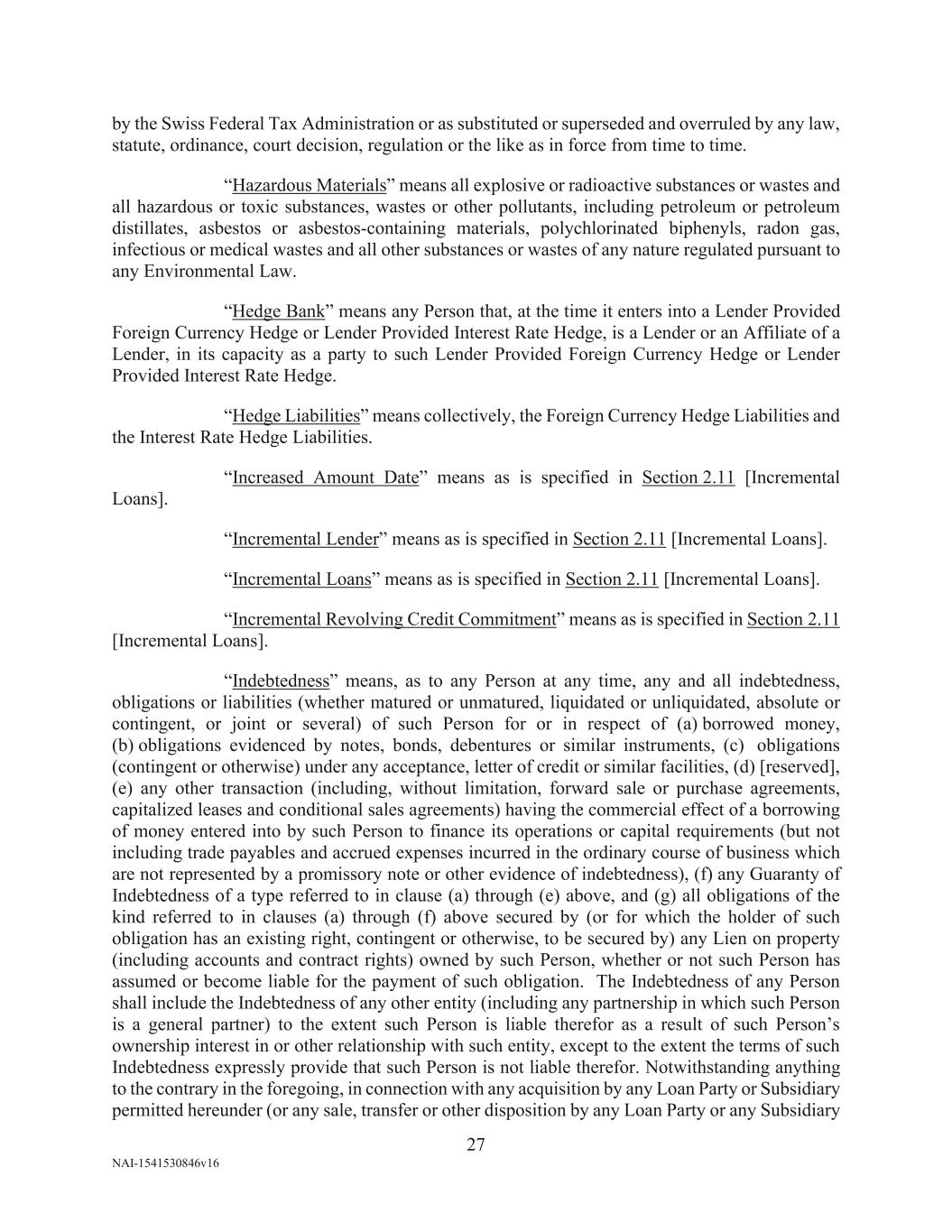 NAI-1541530846v16 27 by the Swiss Federal Tax Administration or as substituted or superseded and overruled by any law, statute, ordinance, court decision, regulation or the like as in force from time to time. “Hazardous Materials” means all explosive or radioactive substances or wastes and all hazardous or toxic substances, wastes or other pollutants, including petroleum or petroleum distillates, asbestos or asbestos-containing materials, polychlorinated biphenyls, radon gas, infectious or medical wastes and all other substances or wastes of any nature regulated pursuant to any Environmental Law. “Hedge Bank” means any Person that, at the time it enters into a Lender Provided Foreign Currency Hedge or Lender Provided Interest Rate Hedge, is a Lender or an Affiliate of a Lender, in its capacity as a party to such Lender Provided Foreign Currency Hedge or Lender Provided Interest Rate Hedge. “Hedge Liabilities” means collectively, the Foreign Currency Hedge Liabilities and the Interest Rate Hedge Liabilities. “Increased Amount Date” means as is specified in Section 2.11 [Incremental Loans]. “Incremental Lender” means as is specified in Section 2.11 [Incremental Loans]. “Incremental Loans” means as is specified in Section 2.11 [Incremental Loans]. “Incremental Revolving Credit Commitment” means as is specified in Section 2.11 [Incremental Loans]. “Indebtedness” means, as to any Person at any time, any and all indebtedness, obligations or liabilities (whether matured or unmatured, liquidated or unliquidated, absolute or contingent, or joint or several) of such Person for or in respect of (a) borrowed money, (b) obligations evidenced by notes, bonds, debentures or similar instruments, (c) obligations (contingent or otherwise) under any acceptance, letter of credit or similar facilities, (d) [reserved], (e) any other transaction (including, without limitation, forward sale or purchase agreements, capitalized leases and conditional sales agreements) having the commercial effect of a borrowing of money entered into by such Person to finance its operations or capital requirements (but not including trade payables and accrued expenses incurred in the ordinary course of business which are not represented by a promissory note or other evidence of indebtedness), (f) any Guaranty of Indebtedness of a type referred to in clause (a) through (e) above, and (g) all obligations of the kind referred to in clauses (a) through (f) above secured by (or for which the holder of such obligation has an existing right, contingent or otherwise, to be secured by) any Lien on property (including accounts and contract rights) owned by such Person, whether or not such Person has assumed or become liable for the payment of such obligation. The Indebtedness of any Person shall include the Indebtedness of any other entity (including any partnership in which such Person is a general partner) to the extent such Person is liable therefor as a result of such Person’s ownership interest in or other relationship with such entity, except to the extent the terms of such Indebtedness expressly provide that such Person is not liable therefor. Notwithstanding anything to the contrary in the foregoing, in connection with any acquisition by any Loan Party or Subsidiary permitted hereunder (or any sale, transfer or other disposition by any Loan Party or any Subsidiary