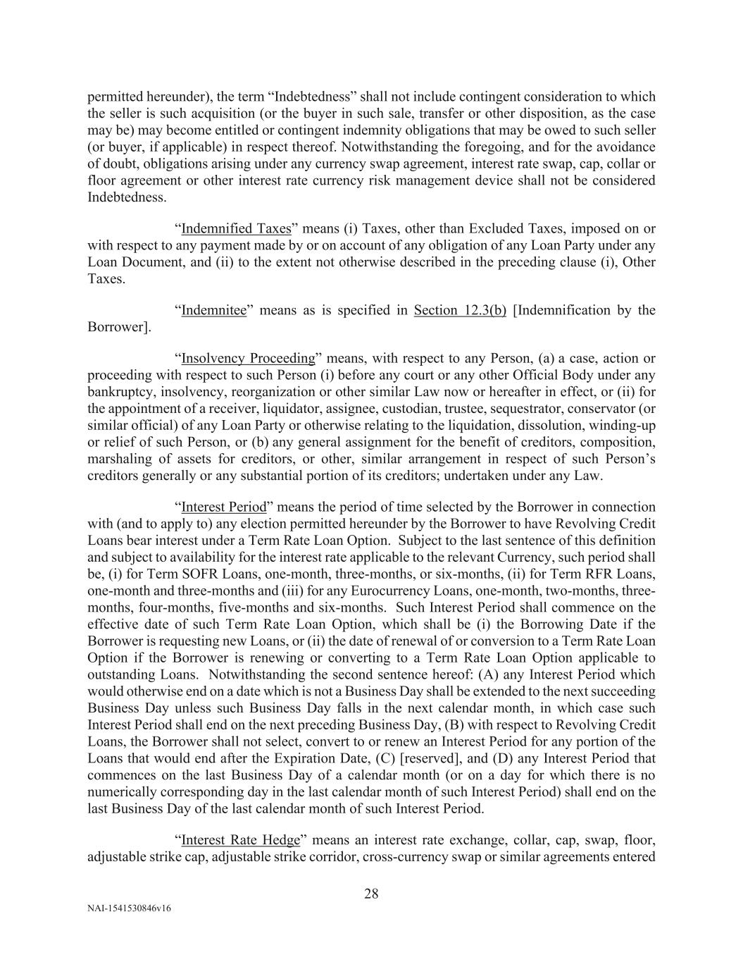 NAI-1541530846v16 28 permitted hereunder), the term “Indebtedness” shall not include contingent consideration to which the seller is such acquisition (or the buyer in such sale, transfer or other disposition, as the case may be) may become entitled or contingent indemnity obligations that may be owed to such seller (or buyer, if applicable) in respect thereof. Notwithstanding the foregoing, and for the avoidance of doubt, obligations arising under any currency swap agreement, interest rate swap, cap, collar or floor agreement or other interest rate currency risk management device shall not be considered Indebtedness. “Indemnified Taxes” means (i) Taxes, other than Excluded Taxes, imposed on or with respect to any payment made by or on account of any obligation of any Loan Party under any Loan Document, and (ii) to the extent not otherwise described in the preceding clause (i), Other Taxes. “Indemnitee” means as is specified in Section 12.3(b) [Indemnification by the Borrower]. “Insolvency Proceeding” means, with respect to any Person, (a) a case, action or proceeding with respect to such Person (i) before any court or any other Official Body under any bankruptcy, insolvency, reorganization or other similar Law now or hereafter in effect, or (ii) for the appointment of a receiver, liquidator, assignee, custodian, trustee, sequestrator, conservator (or similar official) of any Loan Party or otherwise relating to the liquidation, dissolution, winding-up or relief of such Person, or (b) any general assignment for the benefit of creditors, composition, marshaling of assets for creditors, or other, similar arrangement in respect of such Person’s creditors generally or any substantial portion of its creditors; undertaken under any Law. “Interest Period” means the period of time selected by the Borrower in connection with (and to apply to) any election permitted hereunder by the Borrower to have Revolving Credit Loans bear interest under a Term Rate Loan Option. Subject to the last sentence of this definition and subject to availability for the interest rate applicable to the relevant Currency, such period shall be, (i) for Term SOFR Loans, one-month, three-months, or six-months, (ii) for Term RFR Loans, one-month and three-months and (iii) for any Eurocurrency Loans, one-month, two-months, three- months, four-months, five-months and six-months. Such Interest Period shall commence on the effective date of such Term Rate Loan Option, which shall be (i) the Borrowing Date if the Borrower is requesting new Loans, or (ii) the date of renewal of or conversion to a Term Rate Loan Option if the Borrower is renewing or converting to a Term Rate Loan Option applicable to outstanding Loans. Notwithstanding the second sentence hereof: (A) any Interest Period which would otherwise end on a date which is not a Business Day shall be extended to the next succeeding Business Day unless such Business Day falls in the next calendar month, in which case such Interest Period shall end on the next preceding Business Day, (B) with respect to Revolving Credit Loans, the Borrower shall not select, convert to or renew an Interest Period for any portion of the Loans that would end after the Expiration Date, (C) [reserved], and (D) any Interest Period that commences on the last Business Day of a calendar month (or on a day for which there is no numerically corresponding day in the last calendar month of such Interest Period) shall end on the last Business Day of the last calendar month of such Interest Period. “Interest Rate Hedge” means an interest rate exchange, collar, cap, swap, floor, adjustable strike cap, adjustable strike corridor, cross-currency swap or similar agreements entered