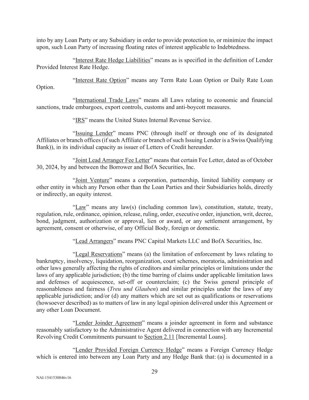 NAI-1541530846v16 29 into by any Loan Party or any Subsidiary in order to provide protection to, or minimize the impact upon, such Loan Party of increasing floating rates of interest applicable to Indebtedness. “Interest Rate Hedge Liabilities” means as is specified in the definition of Lender Provided Interest Rate Hedge. “Interest Rate Option” means any Term Rate Loan Option or Daily Rate Loan Option. “International Trade Laws” means all Laws relating to economic and financial sanctions, trade embargoes, export controls, customs and anti-boycott measures. “IRS” means the United States Internal Revenue Service. “Issuing Lender” means PNC (through itself or through one of its designated Affiliates or branch offices (if such Affiliate or branch of such Issuing Lender is a Swiss Qualifying Bank)), in its individual capacity as issuer of Letters of Credit hereunder. “Joint Lead Arranger Fee Letter” means that certain Fee Letter, dated as of October 30, 2024, by and between the Borrower and BofA Securities, Inc. “Joint Venture” means a corporation, partnership, limited liability company or other entity in which any Person other than the Loan Parties and their Subsidiaries holds, directly or indirectly, an equity interest. “Law” means any law(s) (including common law), constitution, statute, treaty, regulation, rule, ordinance, opinion, release, ruling, order, executive order, injunction, writ, decree, bond, judgment, authorization or approval, lien or award, or any settlement arrangement, by agreement, consent or otherwise, of any Official Body, foreign or domestic. “Lead Arrangers” means PNC Capital Markets LLC and BofA Securities, Inc. “Legal Reservations” means (a) the limitation of enforcement by laws relating to bankruptcy, insolvency, liquidation, reorganization, court schemes, moratoria, administration and other laws generally affecting the rights of creditors and similar principles or limitations under the laws of any applicable jurisdiction; (b) the time barring of claims under applicable limitation laws and defenses of acquiescence, set-off or counterclaim; (c) the Swiss general principle of reasonableness and fairness (Treu und Glauben) and similar principles under the laws of any applicable jurisdiction; and/or (d) any matters which are set out as qualifications or reservations (howsoever described) as to matters of law in any legal opinion delivered under this Agreement or any other Loan Document. “Lender Joinder Agreement” means a joinder agreement in form and substance reasonably satisfactory to the Administrative Agent delivered in connection with any Incremental Revolving Credit Commitments pursuant to Section 2.11 [Incremental Loans]. “Lender Provided Foreign Currency Hedge” means a Foreign Currency Hedge which is entered into between any Loan Party and any Hedge Bank that: (a) is documented in a