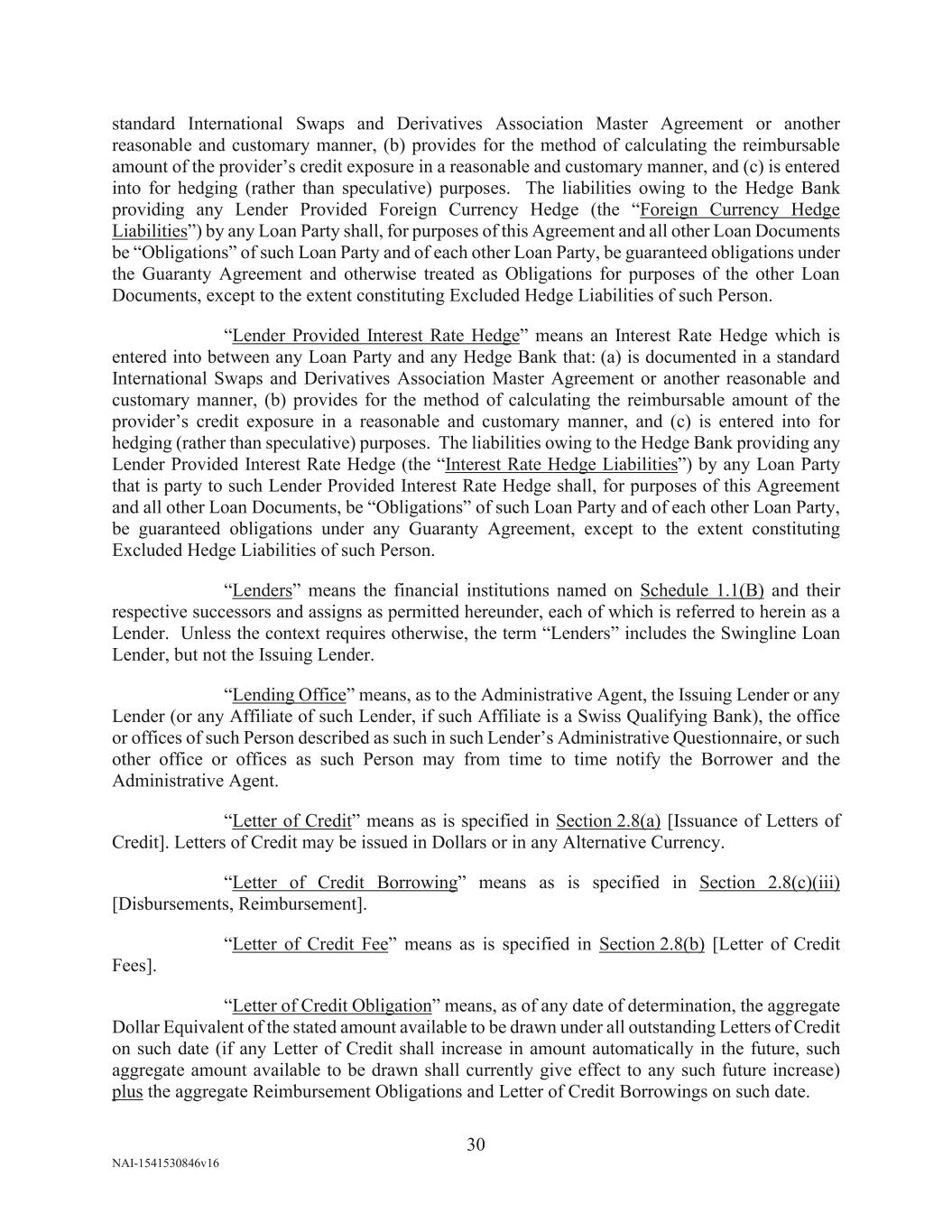 NAI-1541530846v16 30 standard International Swaps and Derivatives Association Master Agreement or another reasonable and customary manner, (b) provides for the method of calculating the reimbursable amount of the provider’s credit exposure in a reasonable and customary manner, and (c) is entered into for hedging (rather than speculative) purposes. The liabilities owing to the Hedge Bank providing any Lender Provided Foreign Currency Hedge (the “Foreign Currency Hedge Liabilities”) by any Loan Party shall, for purposes of this Agreement and all other Loan Documents be “Obligations” of such Loan Party and of each other Loan Party, be guaranteed obligations under the Guaranty Agreement and otherwise treated as Obligations for purposes of the other Loan Documents, except to the extent constituting Excluded Hedge Liabilities of such Person. “Lender Provided Interest Rate Hedge” means an Interest Rate Hedge which is entered into between any Loan Party and any Hedge Bank that: (a) is documented in a standard International Swaps and Derivatives Association Master Agreement or another reasonable and customary manner, (b) provides for the method of calculating the reimbursable amount of the provider’s credit exposure in a reasonable and customary manner, and (c) is entered into for hedging (rather than speculative) purposes. The liabilities owing to the Hedge Bank providing any Lender Provided Interest Rate Hedge (the “Interest Rate Hedge Liabilities”) by any Loan Party that is party to such Lender Provided Interest Rate Hedge shall, for purposes of this Agreement and all other Loan Documents, be “Obligations” of such Loan Party and of each other Loan Party, be guaranteed obligations under any Guaranty Agreement, except to the extent constituting Excluded Hedge Liabilities of such Person. “Lenders” means the financial institutions named on Schedule 1.1(B) and their respective successors and assigns as permitted hereunder, each of which is referred to herein as a Lender. Unless the context requires otherwise, the term “Lenders” includes the Swingline Loan Lender, but not the Issuing Lender. “Lending Office” means, as to the Administrative Agent, the Issuing Lender or any Lender (or any Affiliate of such Lender, if such Affiliate is a Swiss Qualifying Bank), the office or offices of such Person described as such in such Lender’s Administrative Questionnaire, or such other office or offices as such Person may from time to time notify the Borrower and the Administrative Agent. “Letter of Credit” means as is specified in Section 2.8(a) [Issuance of Letters of Credit]. Letters of Credit may be issued in Dollars or in any Alternative Currency. “Letter of Credit Borrowing” means as is specified in Section 2.8(c)(iii) [Disbursements, Reimbursement]. “Letter of Credit Fee” means as is specified in Section 2.8(b) [Letter of Credit Fees]. “Letter of Credit Obligation” means, as of any date of determination, the aggregate Dollar Equivalent of the stated amount available to be drawn under all outstanding Letters of Credit on such date (if any Letter of Credit shall increase in amount automatically in the future, such aggregate amount available to be drawn shall currently give effect to any such future increase) plus the aggregate Reimbursement Obligations and Letter of Credit Borrowings on such date.