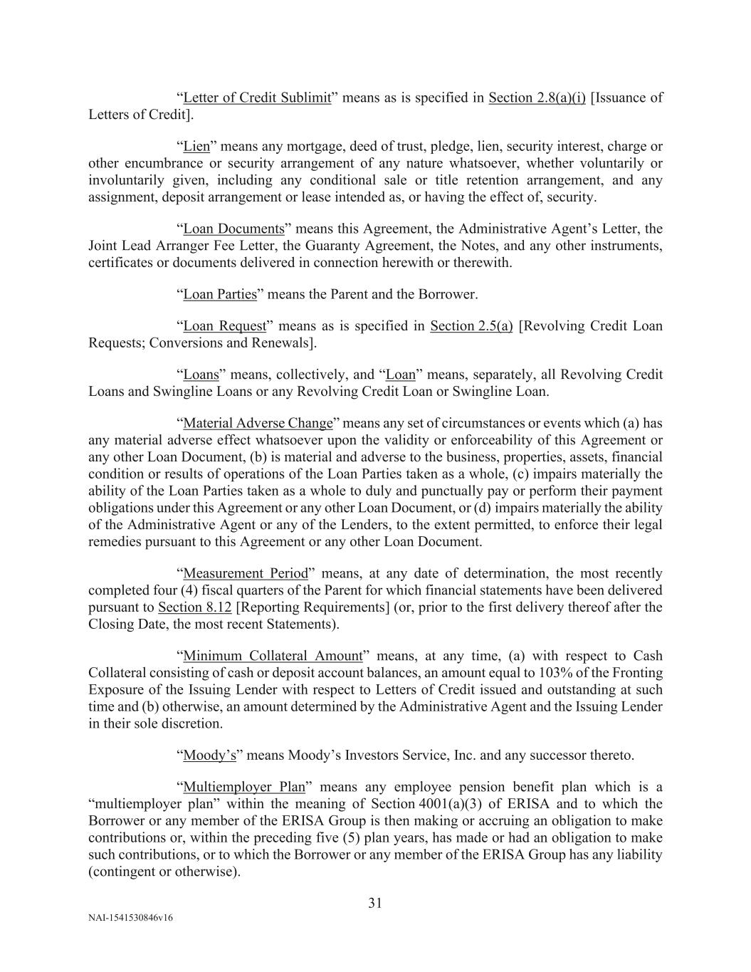 NAI-1541530846v16 31 “Letter of Credit Sublimit” means as is specified in Section 2.8(a)(i) [Issuance of Letters of Credit]. “Lien” means any mortgage, deed of trust, pledge, lien, security interest, charge or other encumbrance or security arrangement of any nature whatsoever, whether voluntarily or involuntarily given, including any conditional sale or title retention arrangement, and any assignment, deposit arrangement or lease intended as, or having the effect of, security. “Loan Documents” means this Agreement, the Administrative Agent’s Letter, the Joint Lead Arranger Fee Letter, the Guaranty Agreement, the Notes, and any other instruments, certificates or documents delivered in connection herewith or therewith. “Loan Parties” means the Parent and the Borrower. “Loan Request” means as is specified in Section 2.5(a) [Revolving Credit Loan Requests; Conversions and Renewals]. “Loans” means, collectively, and “Loan” means, separately, all Revolving Credit Loans and Swingline Loans or any Revolving Credit Loan or Swingline Loan. “Material Adverse Change” means any set of circumstances or events which (a) has any material adverse effect whatsoever upon the validity or enforceability of this Agreement or any other Loan Document, (b) is material and adverse to the business, properties, assets, financial condition or results of operations of the Loan Parties taken as a whole, (c) impairs materially the ability of the Loan Parties taken as a whole to duly and punctually pay or perform their payment obligations under this Agreement or any other Loan Document, or (d) impairs materially the ability of the Administrative Agent or any of the Lenders, to the extent permitted, to enforce their legal remedies pursuant to this Agreement or any other Loan Document. “Measurement Period” means, at any date of determination, the most recently completed four (4) fiscal quarters of the Parent for which financial statements have been delivered pursuant to Section 8.12 [Reporting Requirements] (or, prior to the first delivery thereof after the Closing Date, the most recent Statements). “Minimum Collateral Amount” means, at any time, (a) with respect to Cash Collateral consisting of cash or deposit account balances, an amount equal to 103% of the Fronting Exposure of the Issuing Lender with respect to Letters of Credit issued and outstanding at such time and (b) otherwise, an amount determined by the Administrative Agent and the Issuing Lender in their sole discretion. “Moody’s” means Moody’s Investors Service, Inc. and any successor thereto. “Multiemployer Plan” means any employee pension benefit plan which is a “multiemployer plan” within the meaning of Section 4001(a)(3) of ERISA and to which the Borrower or any member of the ERISA Group is then making or accruing an obligation to make contributions or, within the preceding five (5) plan years, has made or had an obligation to make such contributions, or to which the Borrower or any member of the ERISA Group has any liability (contingent or otherwise).