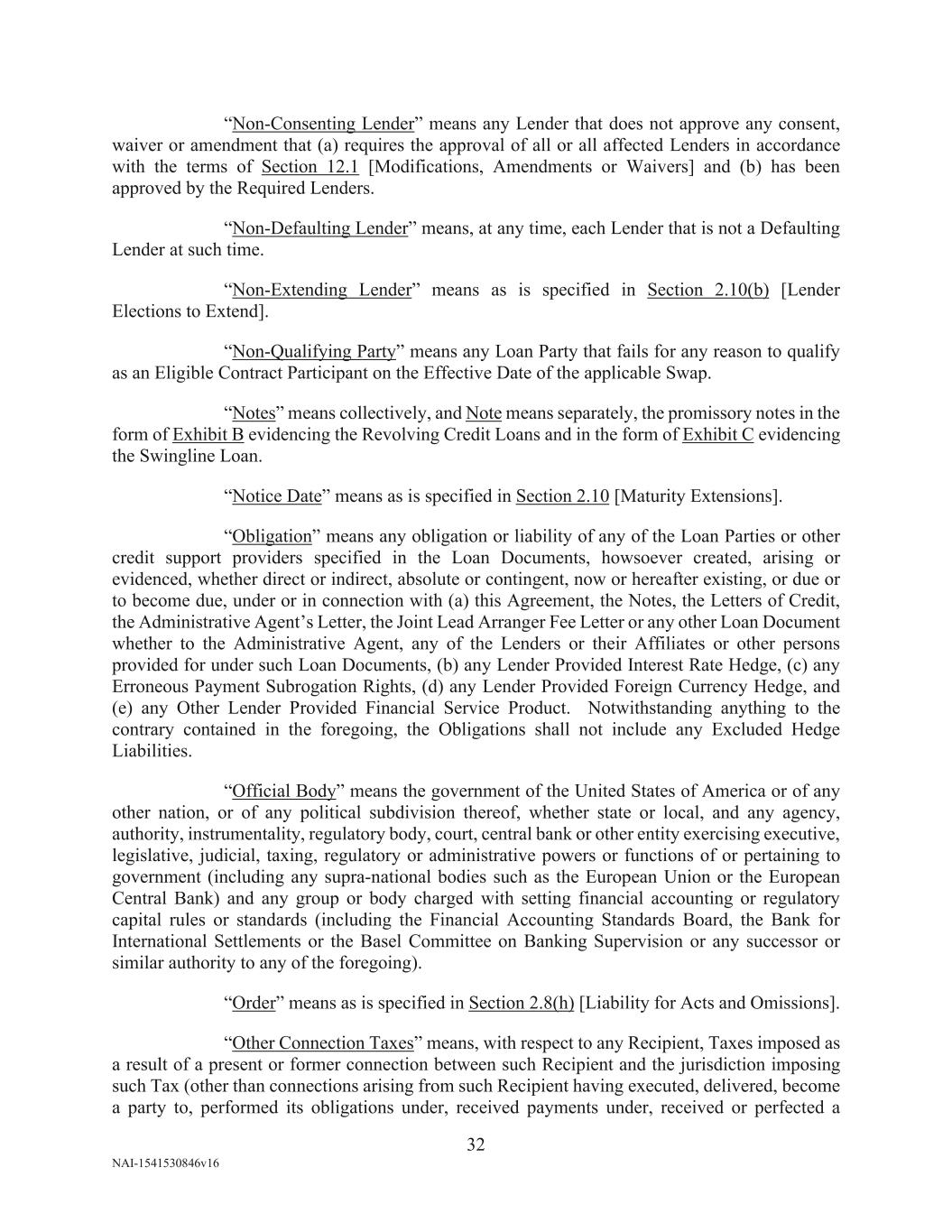 NAI-1541530846v16 32 “Non-Consenting Lender” means any Lender that does not approve any consent, waiver or amendment that (a) requires the approval of all or all affected Lenders in accordance with the terms of Section 12.1 [Modifications, Amendments or Waivers] and (b) has been approved by the Required Lenders. “Non-Defaulting Lender” means, at any time, each Lender that is not a Defaulting Lender at such time. “Non-Extending Lender” means as is specified in Section 2.10(b) [Lender Elections to Extend]. “Non-Qualifying Party” means any Loan Party that fails for any reason to qualify as an Eligible Contract Participant on the Effective Date of the applicable Swap. “Notes” means collectively, and Note means separately, the promissory notes in the form of Exhibit B evidencing the Revolving Credit Loans and in the form of Exhibit C evidencing the Swingline Loan. “Notice Date” means as is specified in Section 2.10 [Maturity Extensions]. “Obligation” means any obligation or liability of any of the Loan Parties or other credit support providers specified in the Loan Documents, howsoever created, arising or evidenced, whether direct or indirect, absolute or contingent, now or hereafter existing, or due or to become due, under or in connection with (a) this Agreement, the Notes, the Letters of Credit, the Administrative Agent’s Letter, the Joint Lead Arranger Fee Letter or any other Loan Document whether to the Administrative Agent, any of the Lenders or their Affiliates or other persons provided for under such Loan Documents, (b) any Lender Provided Interest Rate Hedge, (c) any Erroneous Payment Subrogation Rights, (d) any Lender Provided Foreign Currency Hedge, and (e) any Other Lender Provided Financial Service Product. Notwithstanding anything to the contrary contained in the foregoing, the Obligations shall not include any Excluded Hedge Liabilities. “Official Body” means the government of the United States of America or of any other nation, or of any political subdivision thereof, whether state or local, and any agency, authority, instrumentality, regulatory body, court, central bank or other entity exercising executive, legislative, judicial, taxing, regulatory or administrative powers or functions of or pertaining to government (including any supra-national bodies such as the European Union or the European Central Bank) and any group or body charged with setting financial accounting or regulatory capital rules or standards (including the Financial Accounting Standards Board, the Bank for International Settlements or the Basel Committee on Banking Supervision or any successor or similar authority to any of the foregoing). “Order” means as is specified in Section 2.8(h) [Liability for Acts and Omissions]. “Other Connection Taxes” means, with respect to any Recipient, Taxes imposed as a result of a present or former connection between such Recipient and the jurisdiction imposing such Tax (other than connections arising from such Recipient having executed, delivered, become a party to, performed its obligations under, received payments under, received or perfected a