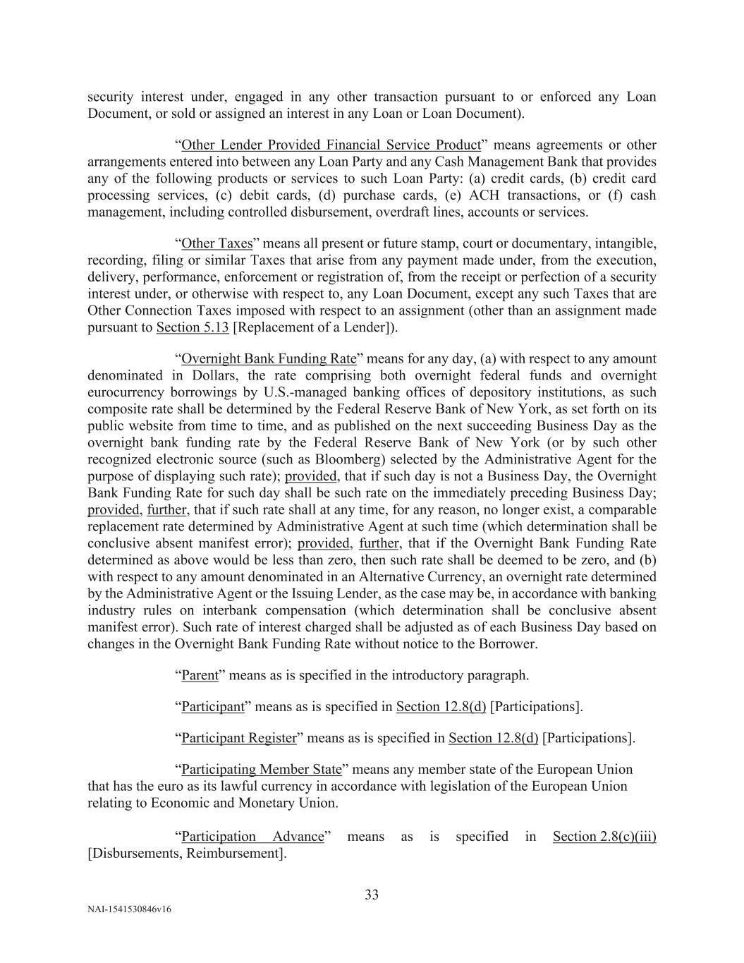 NAI-1541530846v16 33 security interest under, engaged in any other transaction pursuant to or enforced any Loan Document, or sold or assigned an interest in any Loan or Loan Document). “Other Lender Provided Financial Service Product” means agreements or other arrangements entered into between any Loan Party and any Cash Management Bank that provides any of the following products or services to such Loan Party: (a) credit cards, (b) credit card processing services, (c) debit cards, (d) purchase cards, (e) ACH transactions, or (f) cash management, including controlled disbursement, overdraft lines, accounts or services. “Other Taxes” means all present or future stamp, court or documentary, intangible, recording, filing or similar Taxes that arise from any payment made under, from the execution, delivery, performance, enforcement or registration of, from the receipt or perfection of a security interest under, or otherwise with respect to, any Loan Document, except any such Taxes that are Other Connection Taxes imposed with respect to an assignment (other than an assignment made pursuant to Section 5.13 [Replacement of a Lender]). “Overnight Bank Funding Rate” means for any day, (a) with respect to any amount denominated in Dollars, the rate comprising both overnight federal funds and overnight eurocurrency borrowings by U.S.-managed banking offices of depository institutions, as such composite rate shall be determined by the Federal Reserve Bank of New York, as set forth on its public website from time to time, and as published on the next succeeding Business Day as the overnight bank funding rate by the Federal Reserve Bank of New York (or by such other recognized electronic source (such as Bloomberg) selected by the Administrative Agent for the purpose of displaying such rate); provided, that if such day is not a Business Day, the Overnight Bank Funding Rate for such day shall be such rate on the immediately preceding Business Day; provided, further, that if such rate shall at any time, for any reason, no longer exist, a comparable replacement rate determined by Administrative Agent at such time (which determination shall be conclusive absent manifest error); provided, further, that if the Overnight Bank Funding Rate determined as above would be less than zero, then such rate shall be deemed to be zero, and (b) with respect to any amount denominated in an Alternative Currency, an overnight rate determined by the Administrative Agent or the Issuing Lender, as the case may be, in accordance with banking industry rules on interbank compensation (which determination shall be conclusive absent manifest error). Such rate of interest charged shall be adjusted as of each Business Day based on changes in the Overnight Bank Funding Rate without notice to the Borrower. “Parent” means as is specified in the introductory paragraph. “Participant” means as is specified in Section 12.8(d) [Participations]. “Participant Register” means as is specified in Section 12.8(d) [Participations]. “Participating Member State” means any member state of the European Union that has the euro as its lawful currency in accordance with legislation of the European Union relating to Economic and Monetary Union. “Participation Advance” means as is specified in Section 2.8(c)(iii) [Disbursements, Reimbursement].