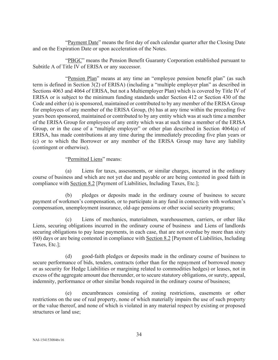 NAI-1541530846v16 34 “Payment Date” means the first day of each calendar quarter after the Closing Date and on the Expiration Date or upon acceleration of the Notes. “PBGC” means the Pension Benefit Guaranty Corporation established pursuant to Subtitle A of Title IV of ERISA or any successor. “Pension Plan” means at any time an “employee pension benefit plan” (as such term is defined in Section 3(2) of ERISA) (including a “multiple employer plan” as described in Sections 4063 and 4064 of ERISA, but not a Multiemployer Plan) which is covered by Title IV of ERISA or is subject to the minimum funding standards under Section 412 or Section 430 of the Code and either (a) is sponsored, maintained or contributed to by any member of the ERISA Group for employees of any member of the ERISA Group, (b) has at any time within the preceding five years been sponsored, maintained or contributed to by any entity which was at such time a member of the ERISA Group for employees of any entity which was at such time a member of the ERISA Group, or in the case of a “multiple employer” or other plan described in Section 4064(a) of ERISA, has made contributions at any time during the immediately preceding five plan years or (c) or to which the Borrower or any member of the ERISA Group may have any liability (contingent or otherwise). “Permitted Liens” means: (a) Liens for taxes, assessments, or similar charges, incurred in the ordinary course of business and which are not yet due and payable or are being contested in good faith in compliance with Section 8.2 [Payment of Liabilities, Including Taxes, Etc.]; (b) pledges or deposits made in the ordinary course of business to secure payment of workmen’s compensation, or to participate in any fund in connection with workmen’s compensation, unemployment insurance, old-age pensions or other social security programs; (c) Liens of mechanics, materialmen, warehousemen, carriers, or other like Liens, securing obligations incurred in the ordinary course of business and Liens of landlords securing obligations to pay lease payments, in each case, that are not overdue by more than sixty (60) days or are being contested in compliance with Section 8.2 [Payment of Liabilities, Including Taxes, Etc.]; (d) good-faith pledges or deposits made in the ordinary course of business to secure performance of bids, tenders, contracts (other than for the repayment of borrowed money or as security for Hedge Liabilities or margining related to commodities hedges) or leases, not in excess of the aggregate amount due thereunder, or to secure statutory obligations, or surety, appeal, indemnity, performance or other similar bonds required in the ordinary course of business; (e) encumbrances consisting of zoning restrictions, easements or other restrictions on the use of real property, none of which materially impairs the use of such property or the value thereof, and none of which is violated in any material respect by existing or proposed structures or land use;