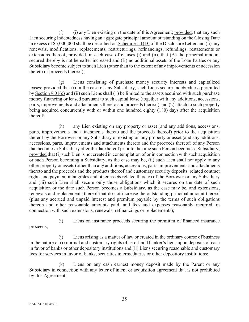 NAI-1541530846v16 35 (f) (i) any Lien existing on the date of this Agreement; provided, that any such Lien securing Indebtedness having an aggregate principal amount outstanding on the Closing Date in excess of $5,000,000 shall be described on Schedule 1.1(D) of the Disclosure Letter and (ii) any renewals, modifications, replacements, restructurings, refinancings, refundings, restatements or extensions thereof; provided, in each case of clauses (i) and (ii), that (A) the principal amount secured thereby is not hereafter increased and (B) no additional assets of the Loan Parties or any Subsidiary become subject to such Lien (other than to the extent of any improvements or accession thereto or proceeds thereof); (g) Liens consisting of purchase money security interests and capitalized leases; provided that (i) in the case of any Subsidiary, such Liens secure Indebtedness permitted by Section 9.01(c) and (ii) such Liens shall (1) be limited to the assets acquired with such purchase money financing or leased pursuant to such capital lease (together with any additions, accessions, parts, improvements and attachments thereto and proceeds thereof) and (2) attach to such property being acquired concurrently with or within one hundred eighty (180) days after the acquisition thereof; (h) any Lien existing on any property or asset (and any additions, accessions, parts, improvements and attachments thereto and the proceeds thereof) prior to the acquisition thereof by the Borrower or any Subsidiary or existing on any property or asset (and any additions, accessions, parts, improvements and attachments thereto and the proceeds thereof) of any Person that becomes a Subsidiary after the date hereof prior to the time such Person becomes a Subsidiary; provided that (i) such Lien is not created in contemplation of or in connection with such acquisition or such Person becoming a Subsidiary, as the case may be, (ii) such Lien shall not apply to any other property or assets (other than any additions, accessions, parts, improvements and attachments thereto and the proceeds and the products thereof and customary security deposits, related contract rights and payment intangibles and other assets related thereto) of the Borrower or any Subsidiary and (iii) such Lien shall secure only those obligations which it secures on the date of such acquisition or the date such Person becomes a Subsidiary, as the case may be, and extensions, renewals and replacements thereof that do not increase the outstanding principal amount thereof (plus any accrued and unpaid interest and premium payable by the terms of such obligations thereon and other reasonable amounts paid, and fees and expenses reasonably incurred, in connection with such extensions, renewals, refinancings or replacements); (i) Liens on insurance proceeds securing the premium of financed insurance proceeds; (j) Liens arising as a matter of law or created in the ordinary course of business in the nature of (i) normal and customary rights of setoff and banker’s liens upon deposits of cash in favor of banks or other depository institutions and (ii) Liens securing reasonable and customary fees for services in favor of banks, securities intermediaries or other depository institutions; (k) Liens on any cash earnest money deposit made by the Parent or any Subsidiary in connection with any letter of intent or acquisition agreement that is not prohibited by this Agreement;