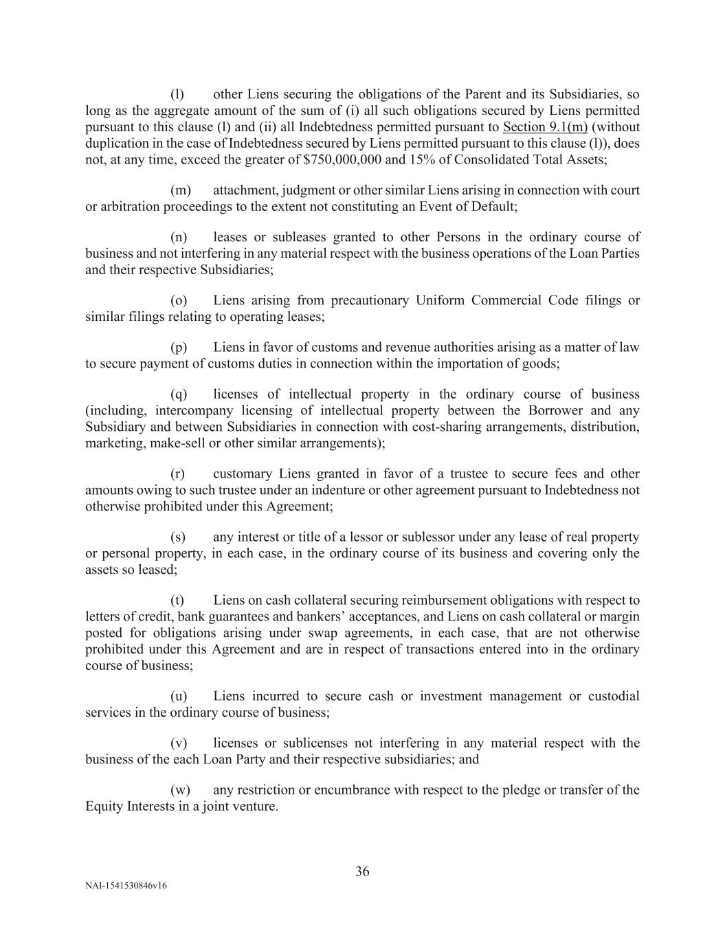 NAI-1541530846v16 36 (l) other Liens securing the obligations of the Parent and its Subsidiaries, so long as the aggregate amount of the sum of (i) all such obligations secured by Liens permitted pursuant to this clause (l) and (ii) all Indebtedness permitted pursuant to Section 9.1(m) (without duplication in the case of Indebtedness secured by Liens permitted pursuant to this clause (l)), does not, at any time, exceed the greater of $750,000,000 and 15% of Consolidated Total Assets; (m) attachment, judgment or other similar Liens arising in connection with court or arbitration proceedings to the extent not constituting an Event of Default; (n) leases or subleases granted to other Persons in the ordinary course of business and not interfering in any material respect with the business operations of the Loan Parties and their respective Subsidiaries; (o) Liens arising from precautionary Uniform Commercial Code filings or similar filings relating to operating leases; (p) Liens in favor of customs and revenue authorities arising as a matter of law to secure payment of customs duties in connection within the importation of goods; (q) licenses of intellectual property in the ordinary course of business (including, intercompany licensing of intellectual property between the Borrower and any Subsidiary and between Subsidiaries in connection with cost-sharing arrangements, distribution, marketing, make-sell or other similar arrangements); (r) customary Liens granted in favor of a trustee to secure fees and other amounts owing to such trustee under an indenture or other agreement pursuant to Indebtedness not otherwise prohibited under this Agreement; (s) any interest or title of a lessor or sublessor under any lease of real property or personal property, in each case, in the ordinary course of its business and covering only the assets so leased; (t) Liens on cash collateral securing reimbursement obligations with respect to letters of credit, bank guarantees and bankers’ acceptances, and Liens on cash collateral or margin posted for obligations arising under swap agreements, in each case, that are not otherwise prohibited under this Agreement and are in respect of transactions entered into in the ordinary course of business; (u) Liens incurred to secure cash or investment management or custodial services in the ordinary course of business; (v) licenses or sublicenses not interfering in any material respect with the business of the each Loan Party and their respective subsidiaries; and (w) any restriction or encumbrance with respect to the pledge or transfer of the Equity Interests in a joint venture.